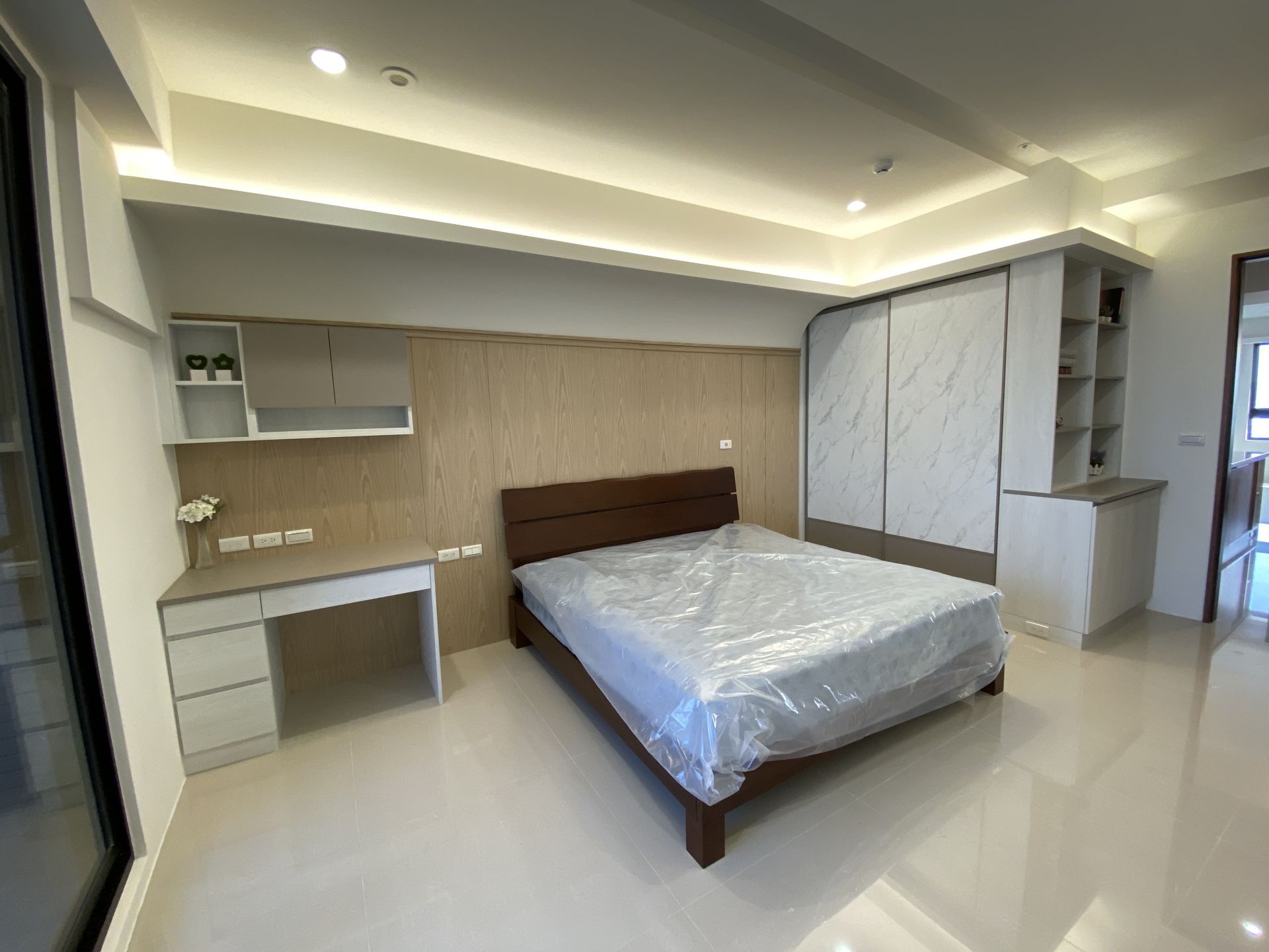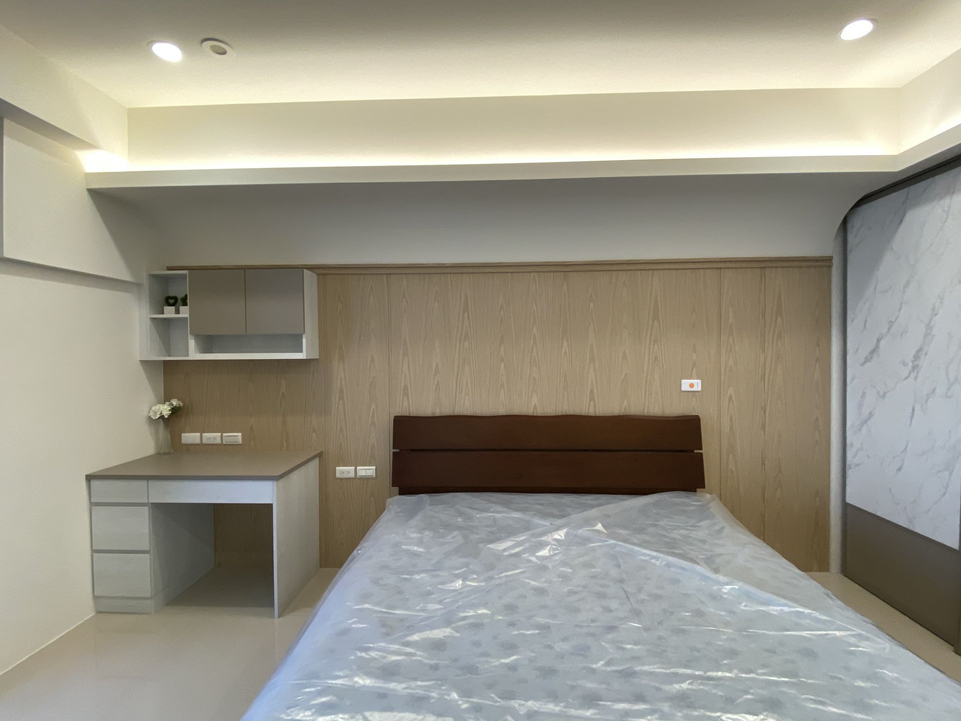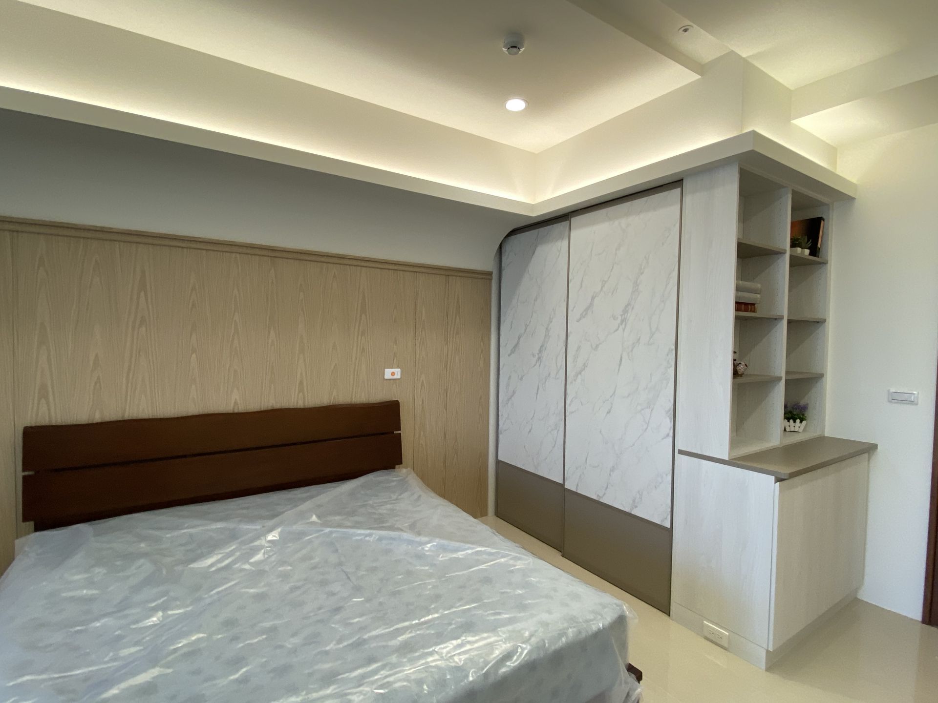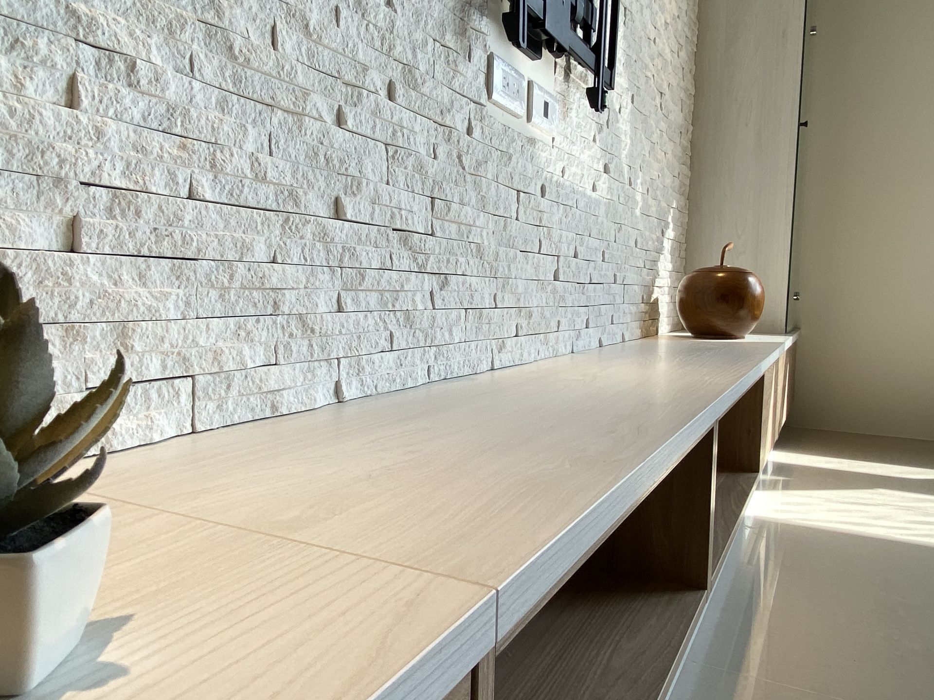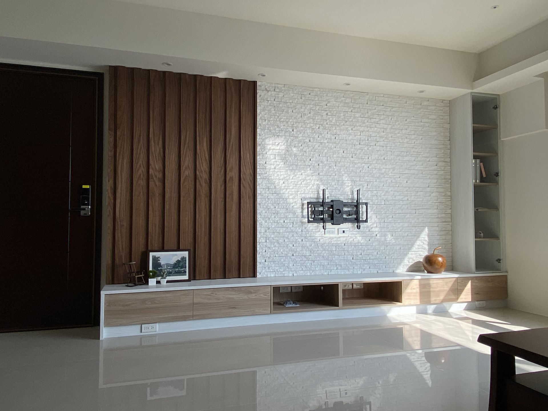 客廳區域,我們運用木作沙發半高牆搭配系統櫃,創造舒適的休憩氛圍,並在電視牆貼上文化石,增添自然紋理。餐廳旁的餐桌旁收納矮櫃組,讓用餐時光更加便利。主臥室內,木作造型斜角圓弧天花板與木作床後造型背牆,營造出溫馨的休憩氛圍,並搭配實用的系統化妝台,滿足日常所需。次臥則規劃了系統書桌組與系統開門衣櫃,兼顧學習與收納。