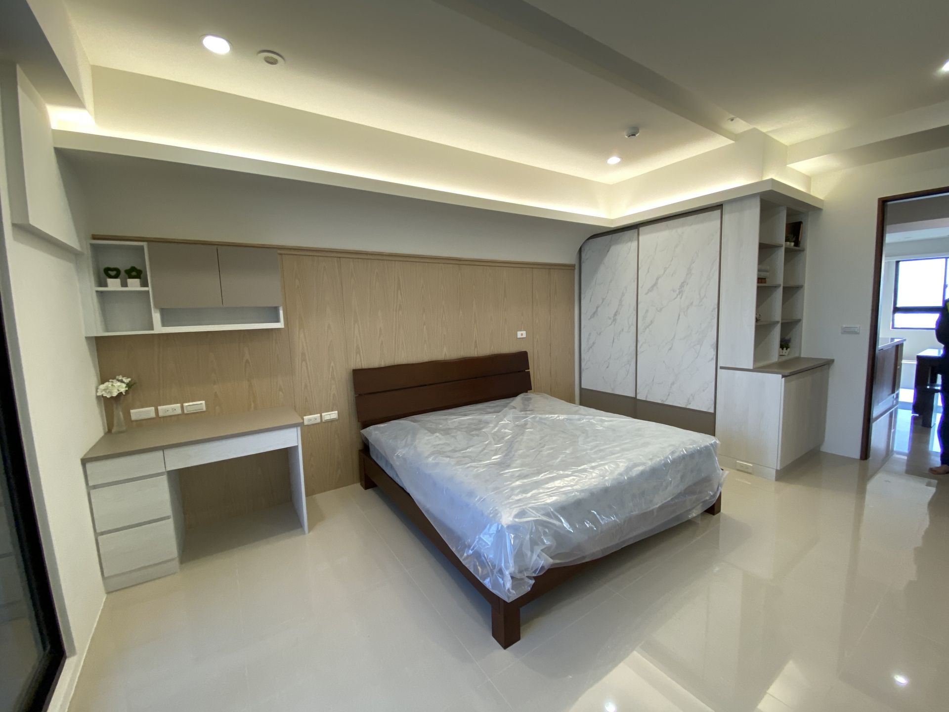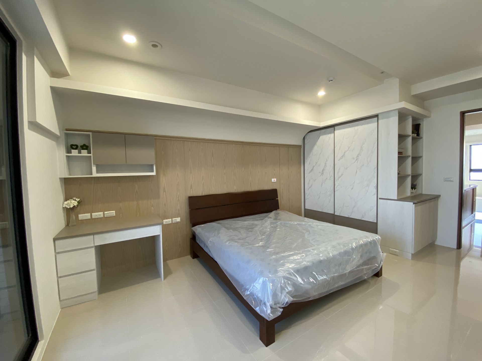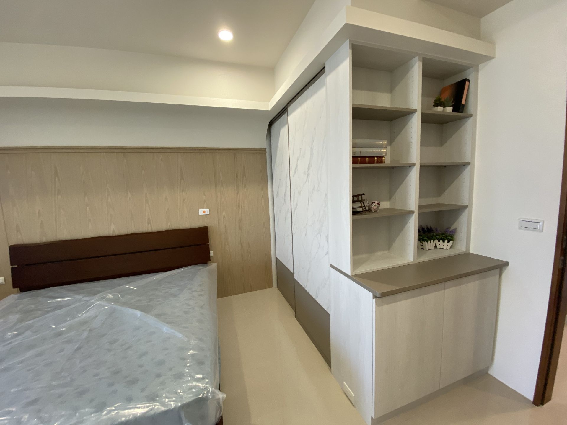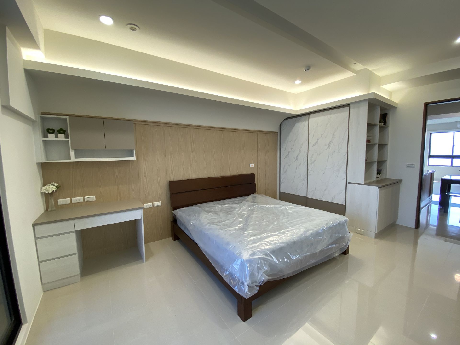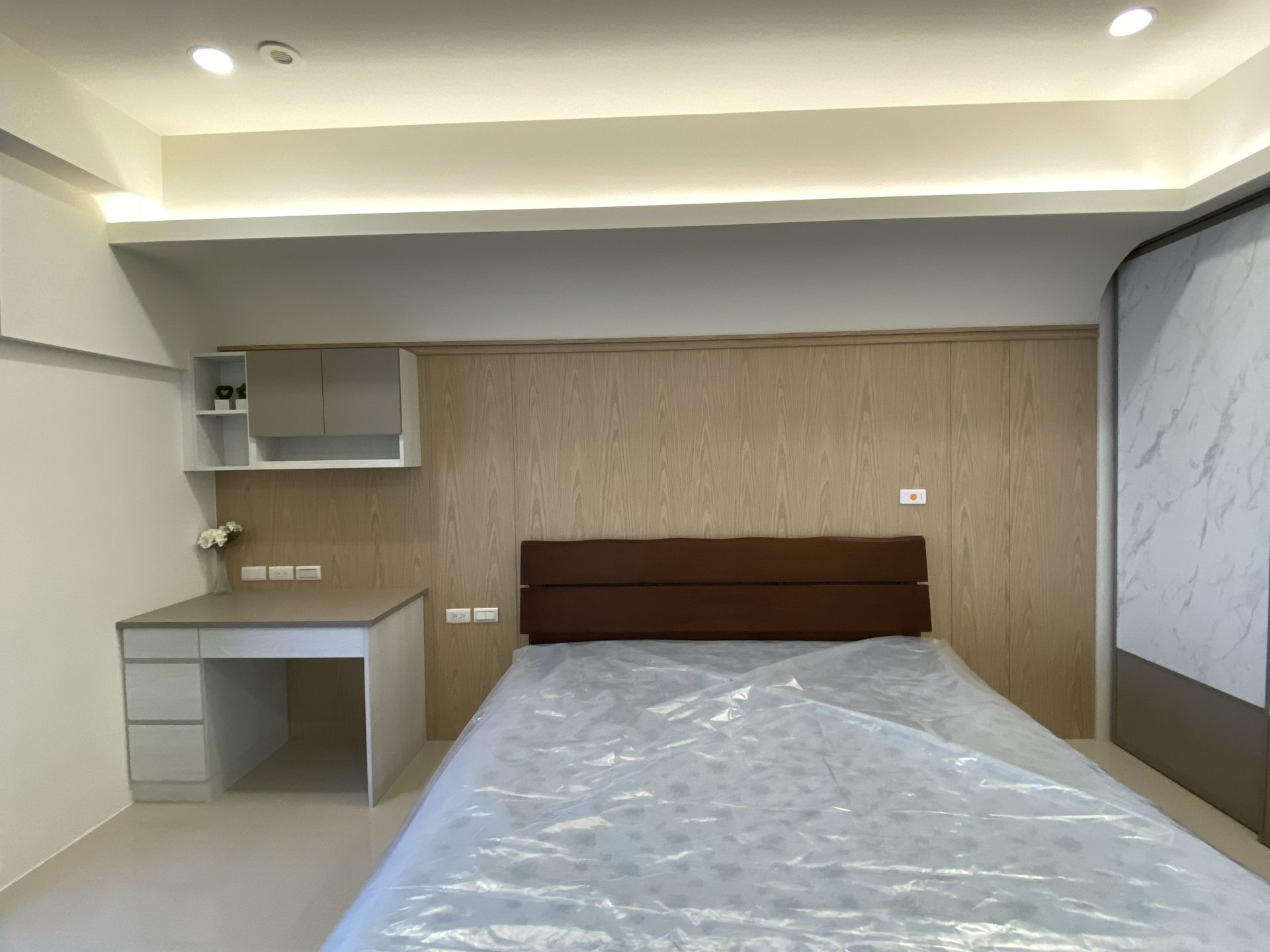 客廳區域,我們運用木作沙發半高牆搭配系統櫃,創造舒適的休憩氛圍,並在電視牆貼上文化石,增添自然紋理。餐廳旁的餐桌旁收納矮櫃組,讓用餐時光更加便利。主臥室內,木作造型斜角圓弧天花板與木作床後造型背牆,營造出溫馨的休憩氛圍,並搭配實用的系統化妝台,滿足日常所需。次臥則規劃了系統書桌組與系統開門衣櫃,兼顧學習與收納。