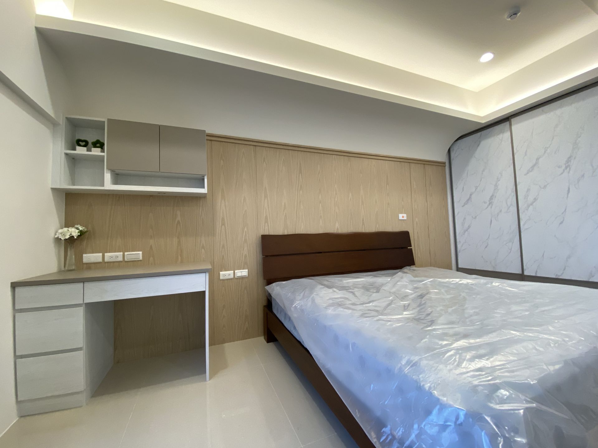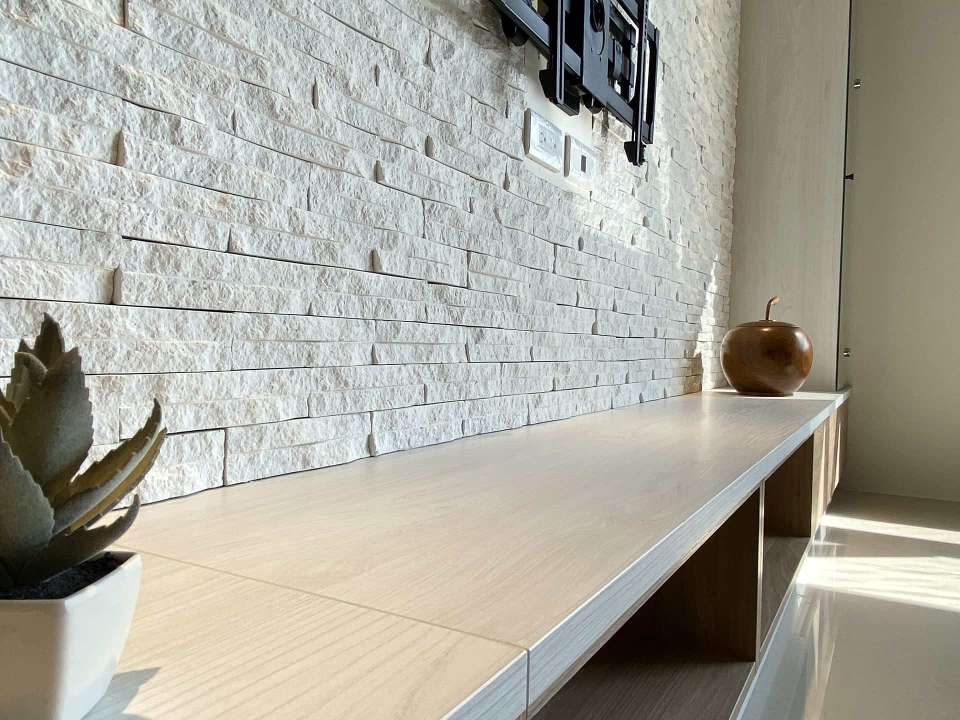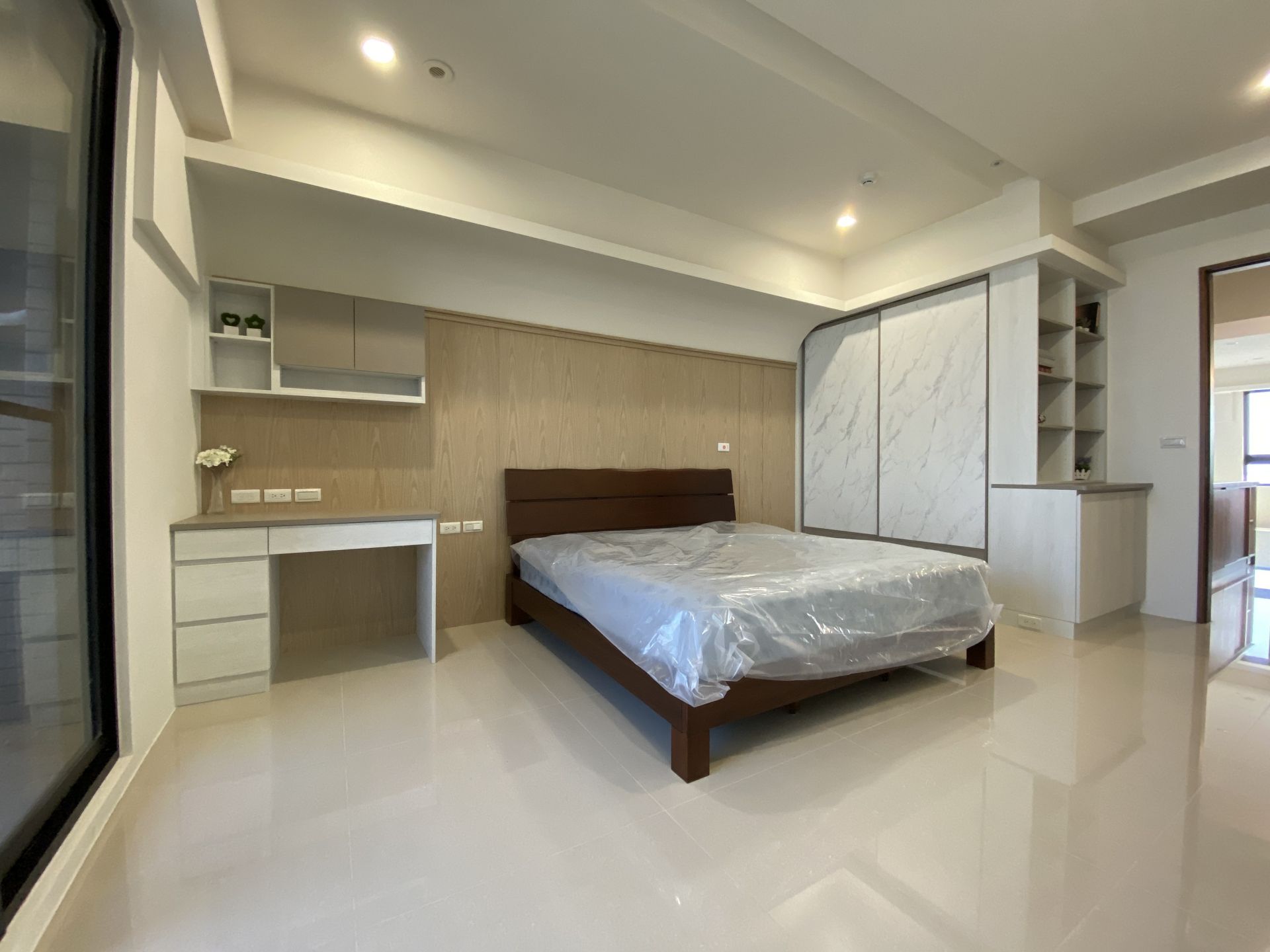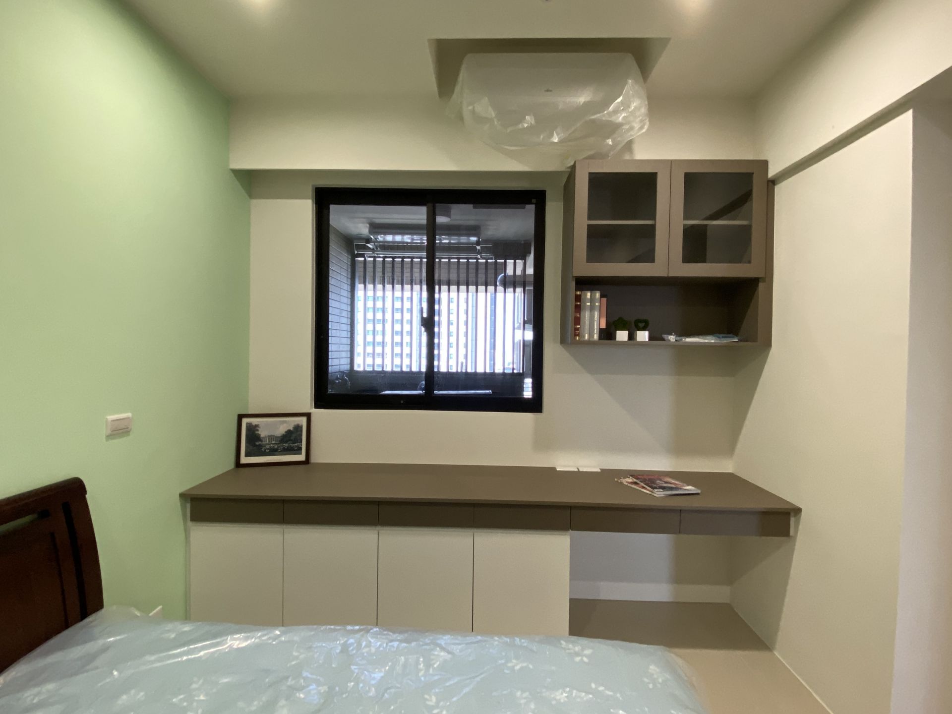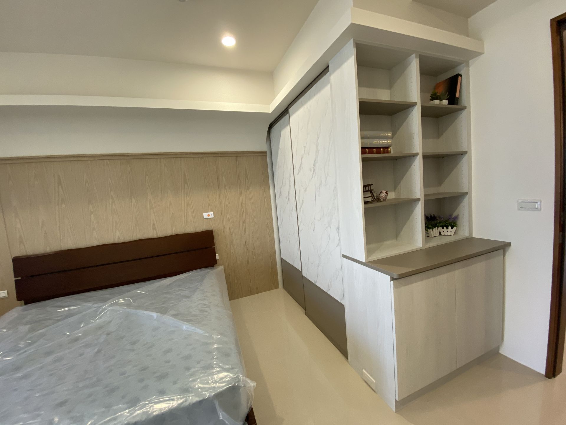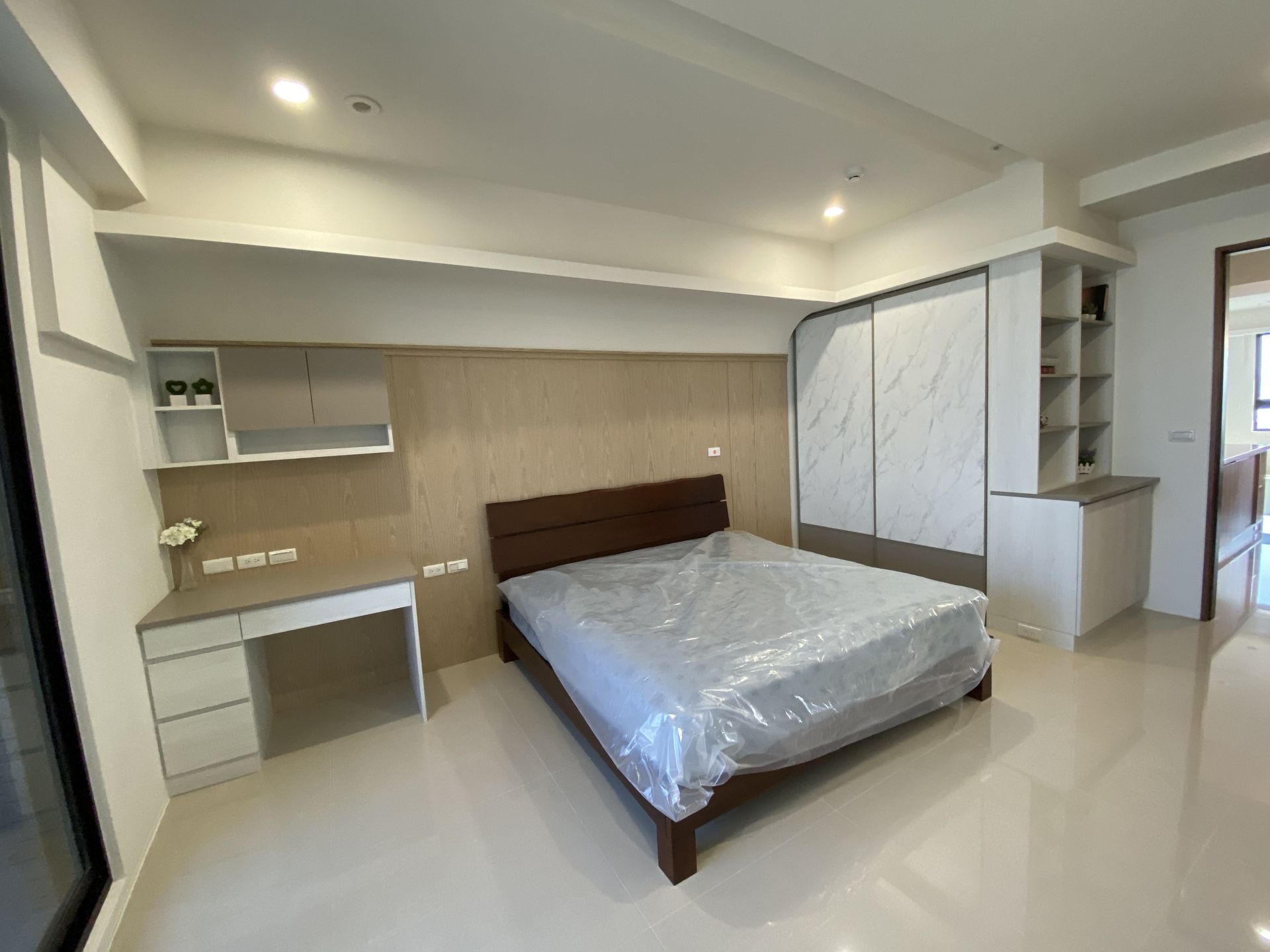客廳區域,我們運用木作沙發半高牆搭配系統櫃,創造舒適的休憩氛圍,並在電視牆貼上文化石,增添自然紋理。餐廳旁的餐桌旁收納矮櫃組,讓用餐時光更加便利。主臥室內,木作造型斜角圓弧天花板與木作床後造型背牆,營造出溫馨的休憩氛圍,並搭配實用的系統化妝台,滿足日常所需。次臥則規劃了系統書桌組與系統開門衣櫃,兼顧學習與收納。