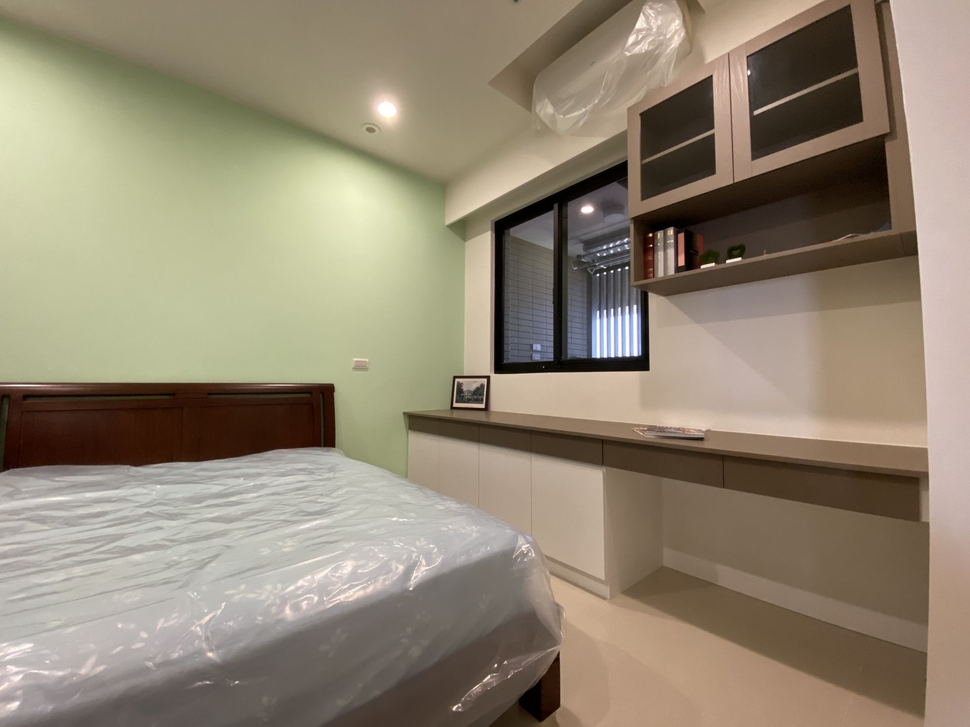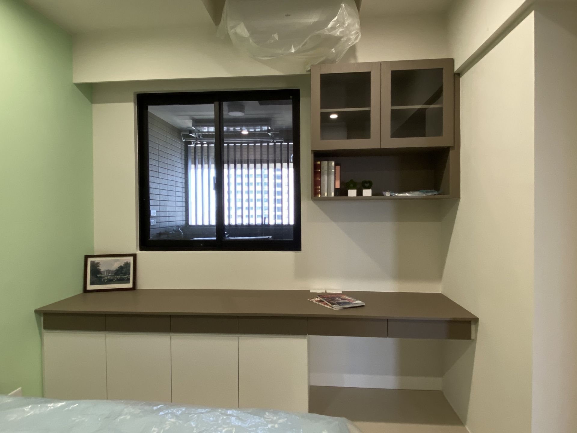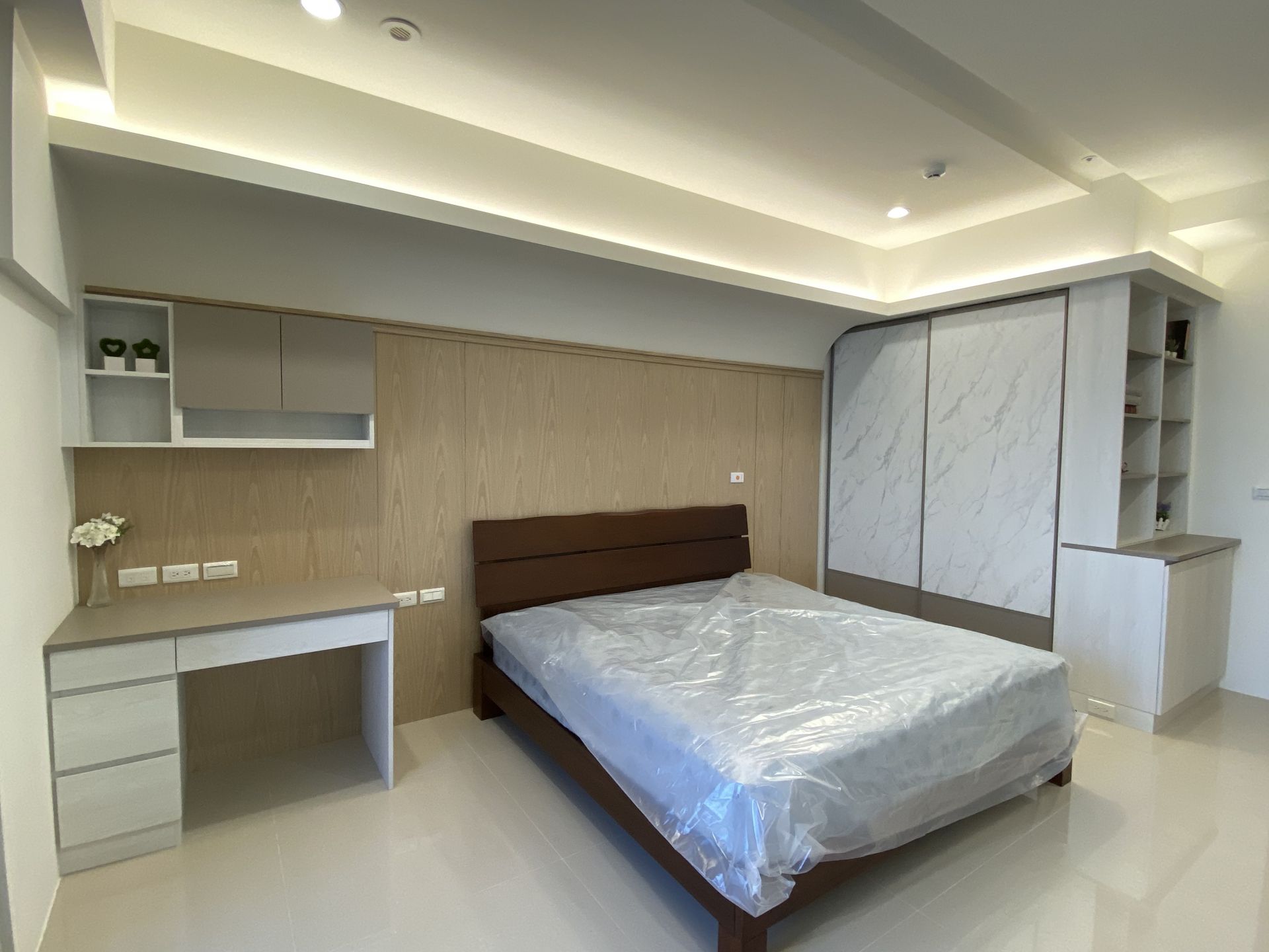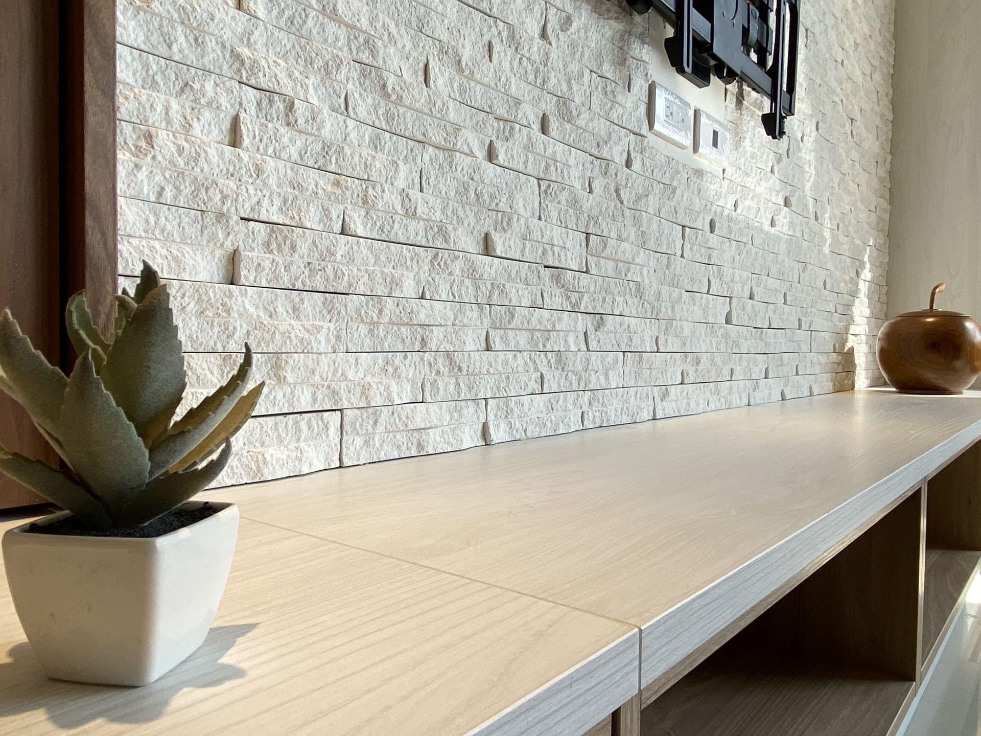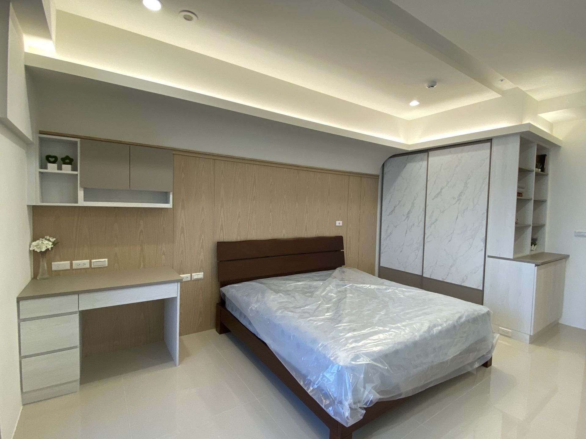 客廳區域,我們運用木作沙發半高牆搭配系統櫃,創造舒適的休憩氛圍,並在電視牆貼上文化石,增添自然紋理。餐廳旁的餐桌旁收納矮櫃組,讓用餐時光更加便利。主臥室內,木作造型斜角圓弧天花板與木作床後造型背牆,營造出溫馨的休憩氛圍,並搭配實用的系統化妝台,滿足日常所需。次臥則規劃了系統書桌組與系統開門衣櫃,兼顧學習與收納。