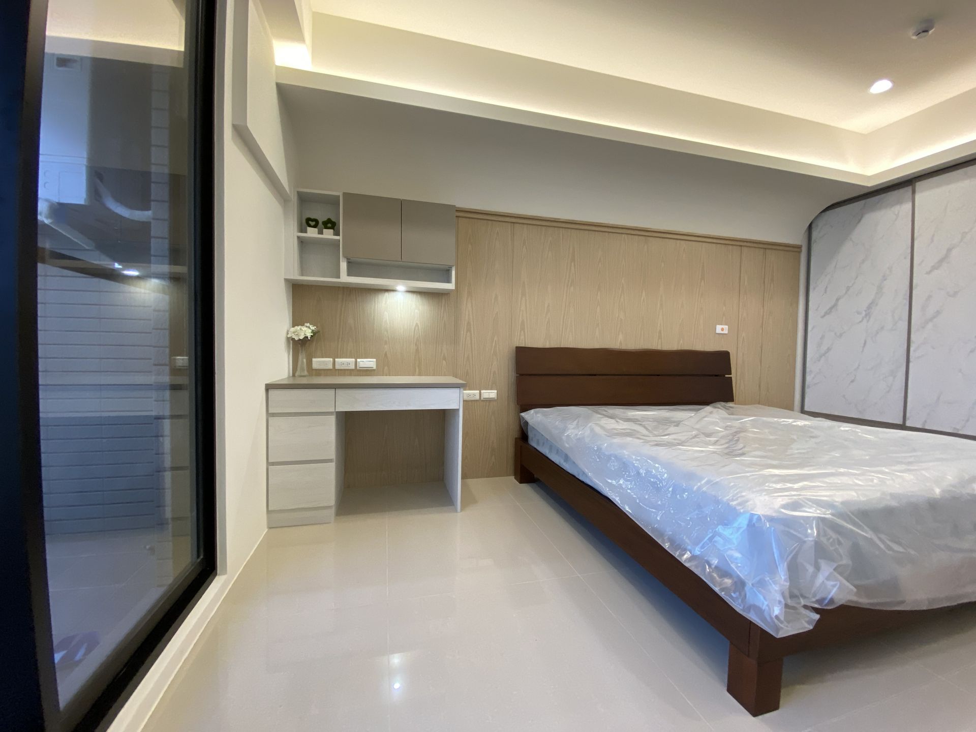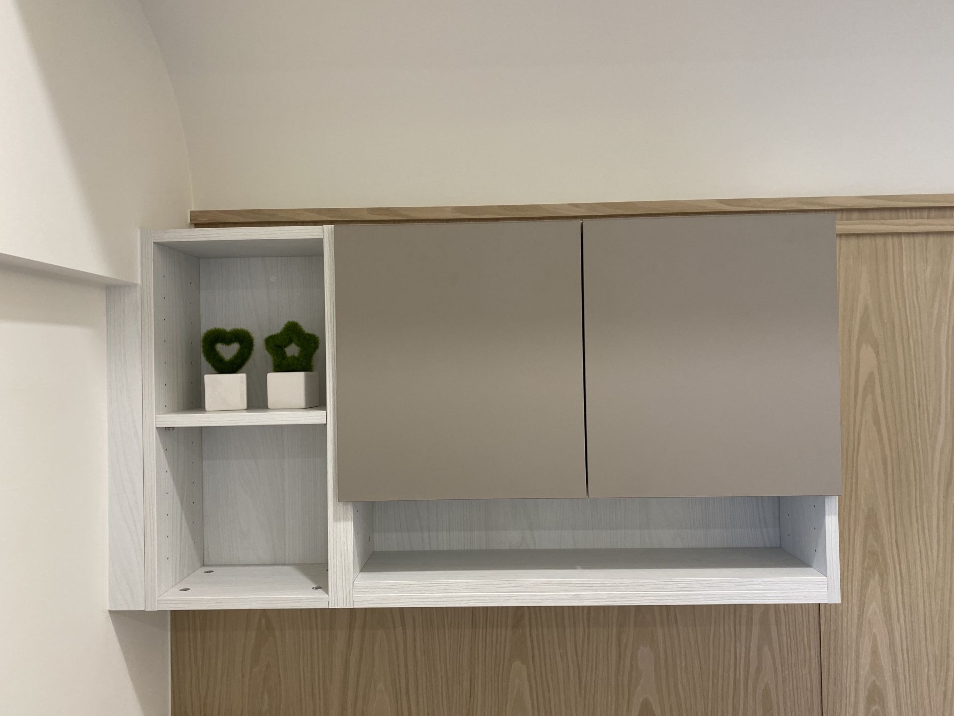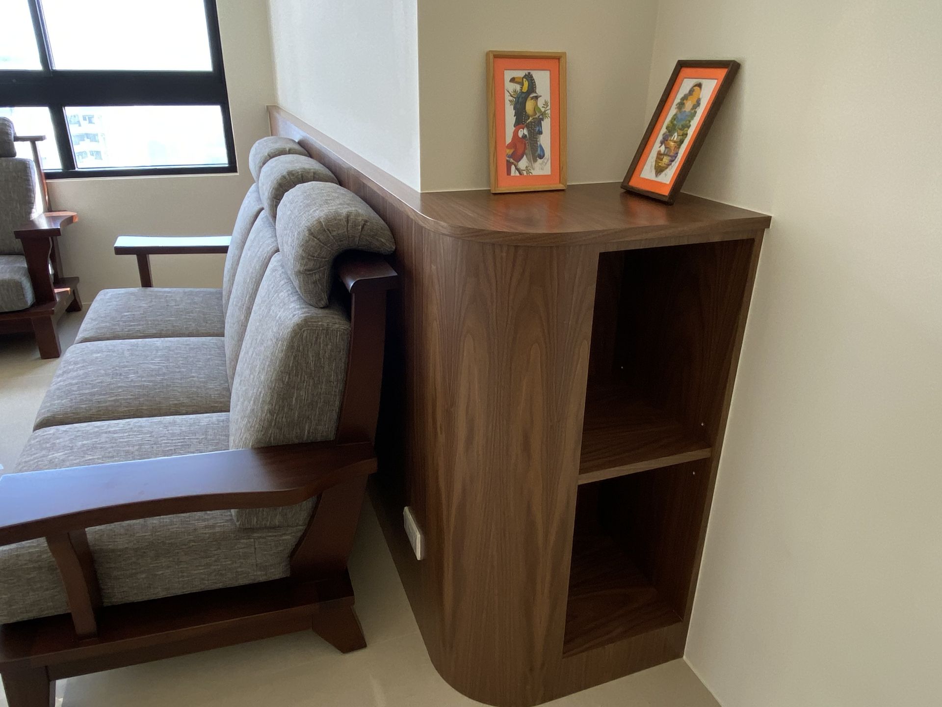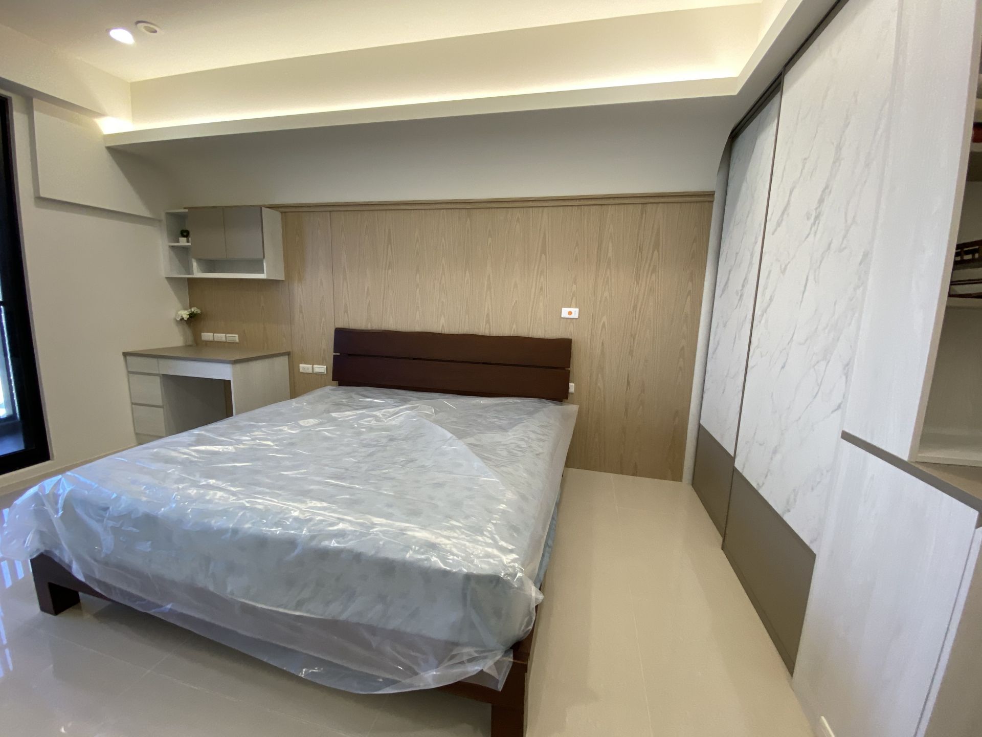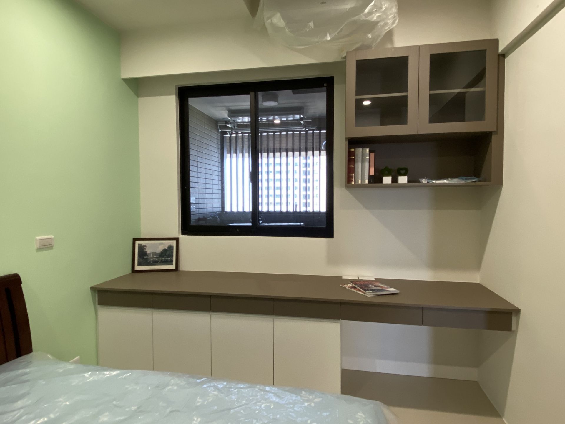 客廳區域,我們運用木作沙發半高牆搭配系統櫃,創造舒適的休憩氛圍,並在電視牆貼上文化石,增添自然紋理。餐廳旁的餐桌旁收納矮櫃組,讓用餐時光更加便利。主臥室內,木作造型斜角圓弧天花板與木作床後造型背牆,營造出溫馨的休憩氛圍,並搭配實用的系統化妝台,滿足日常所需。次臥則規劃了系統書桌組與系統開門衣櫃,兼顧學習與收納。