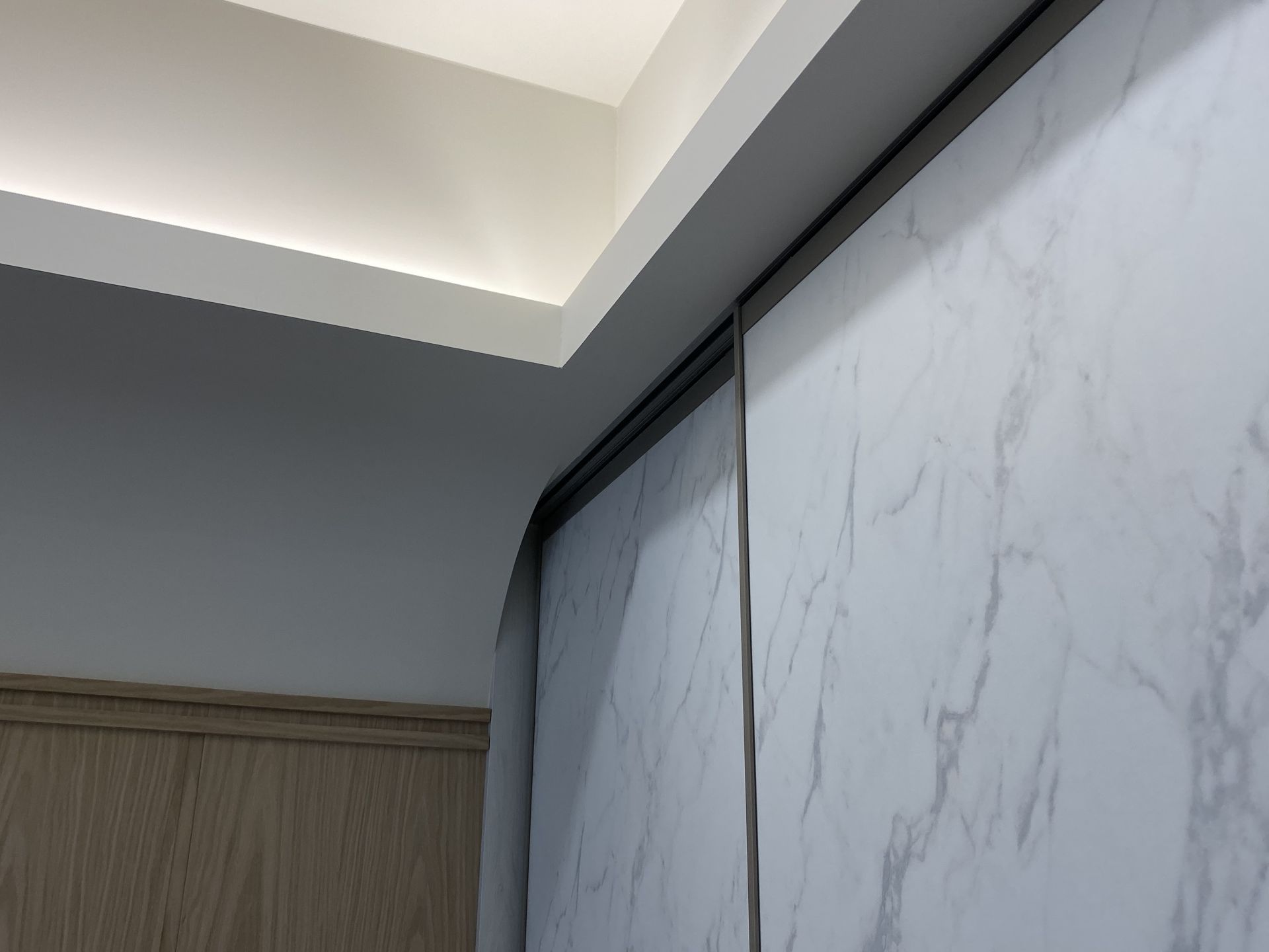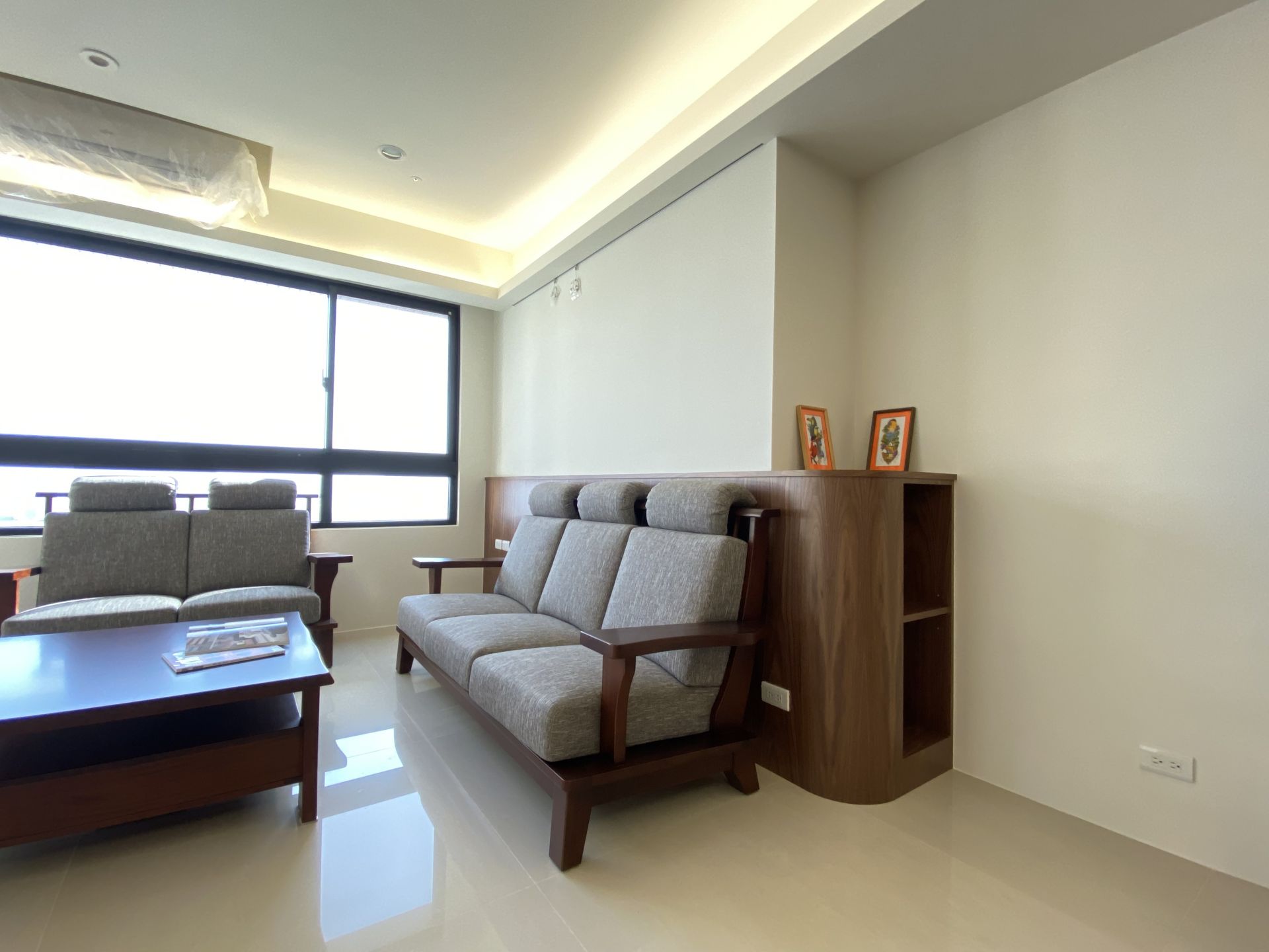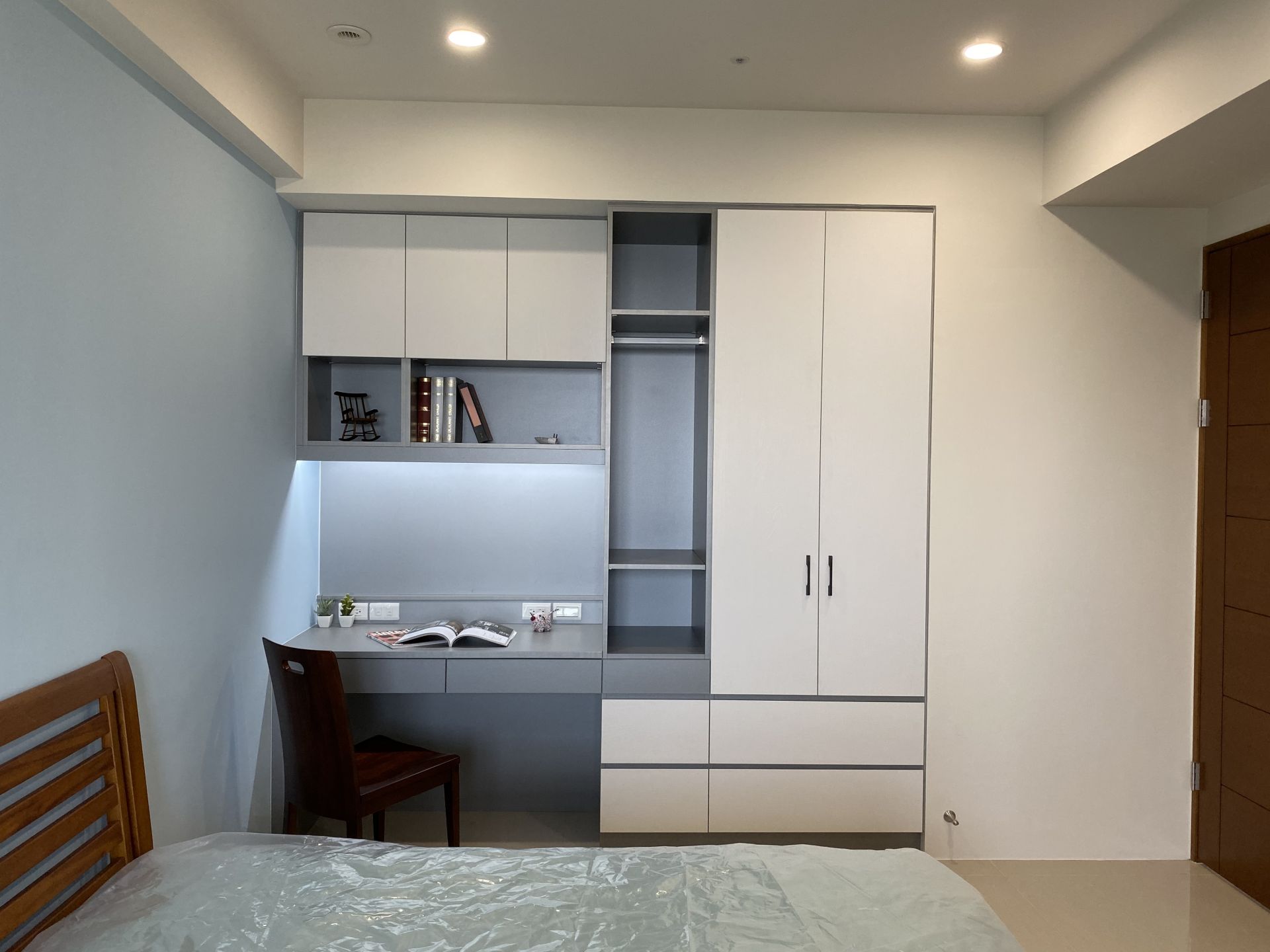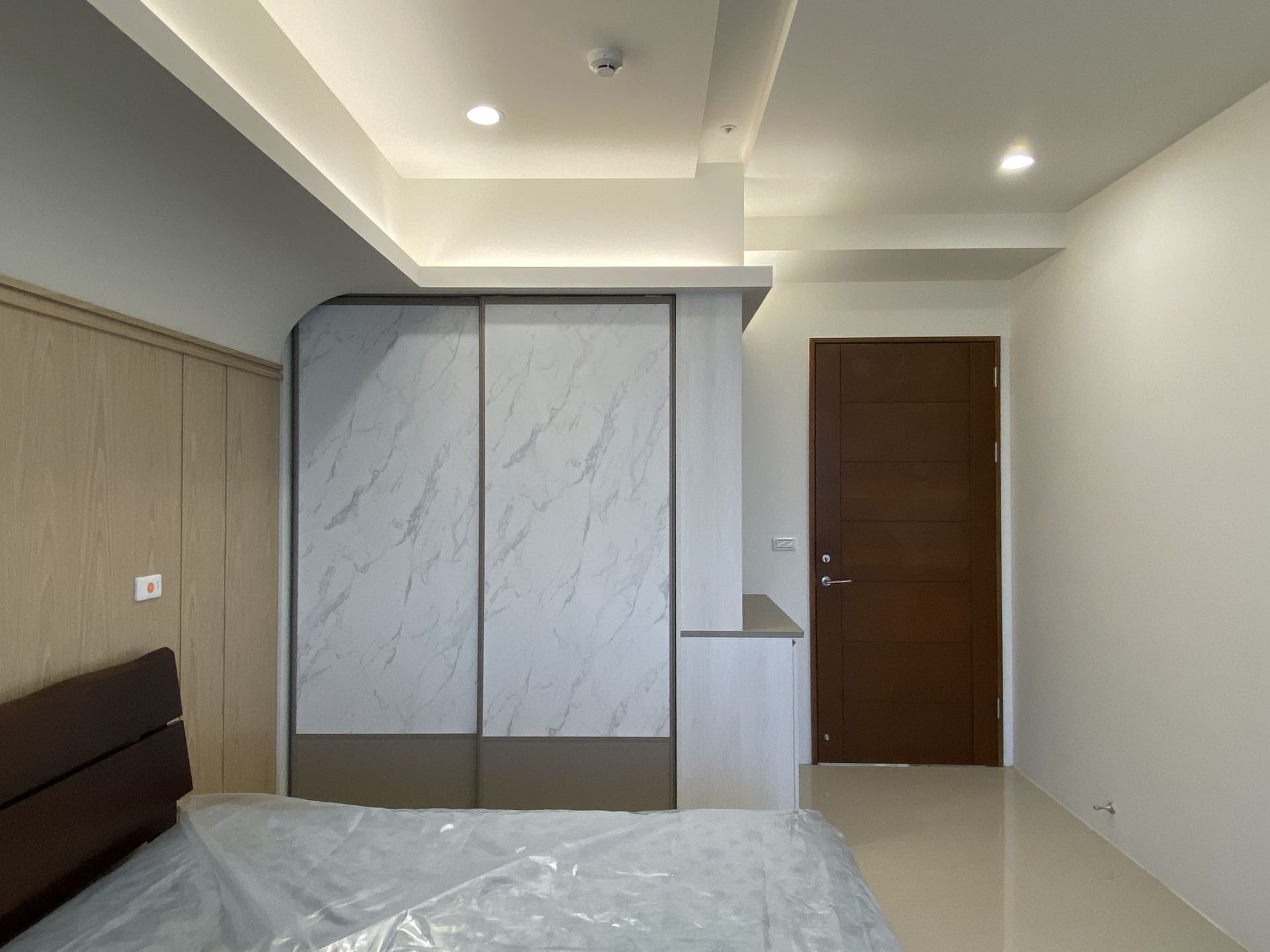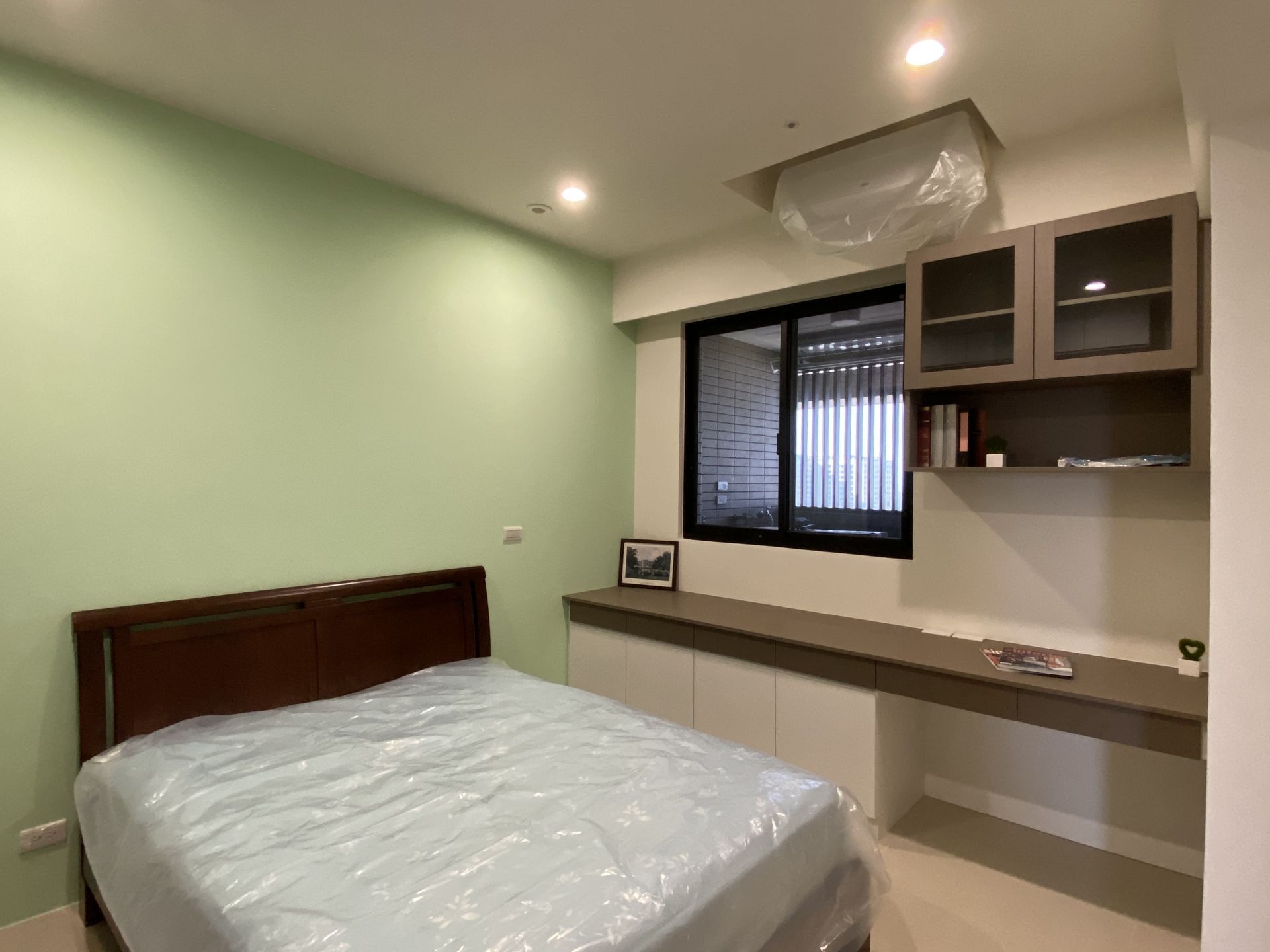 客廳區域,我們運用木作沙發半高牆搭配系統櫃,創造舒適的休憩氛圍,並在電視牆貼上文化石,增添自然紋理。餐廳旁的餐桌旁收納矮櫃組,讓用餐時光更加便利。主臥室內,木作造型斜角圓弧天花板與木作床後造型背牆,營造出溫馨的休憩氛圍,並搭配實用的系統化妝台,滿足日常所需。次臥則規劃了系統書桌組與系統開門衣櫃,兼顧學習與收納。