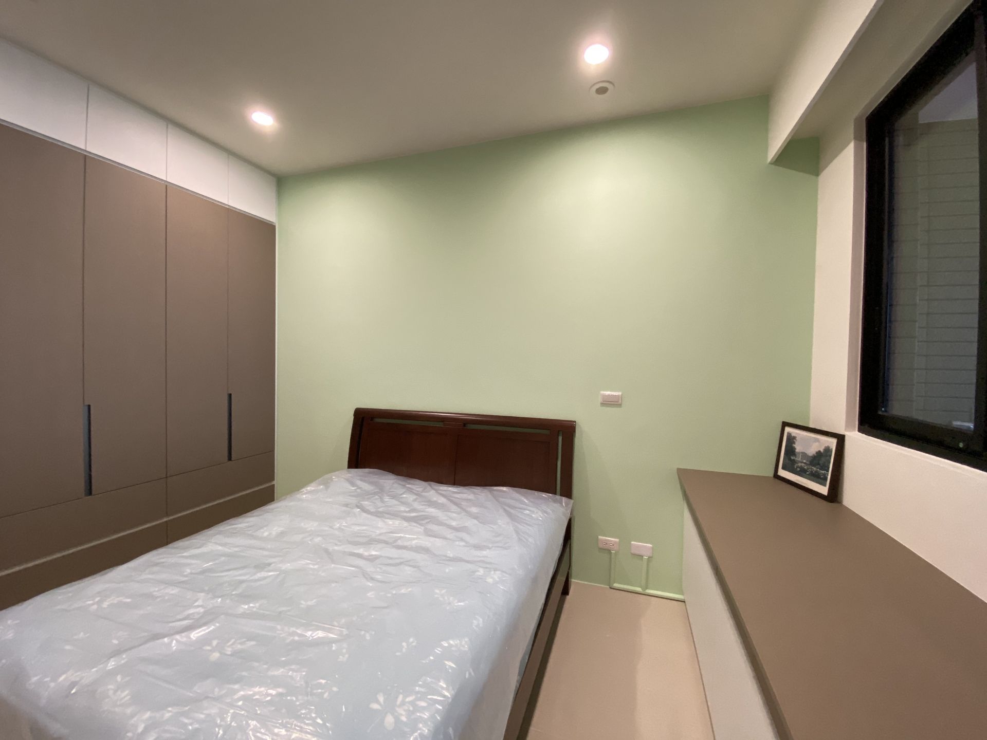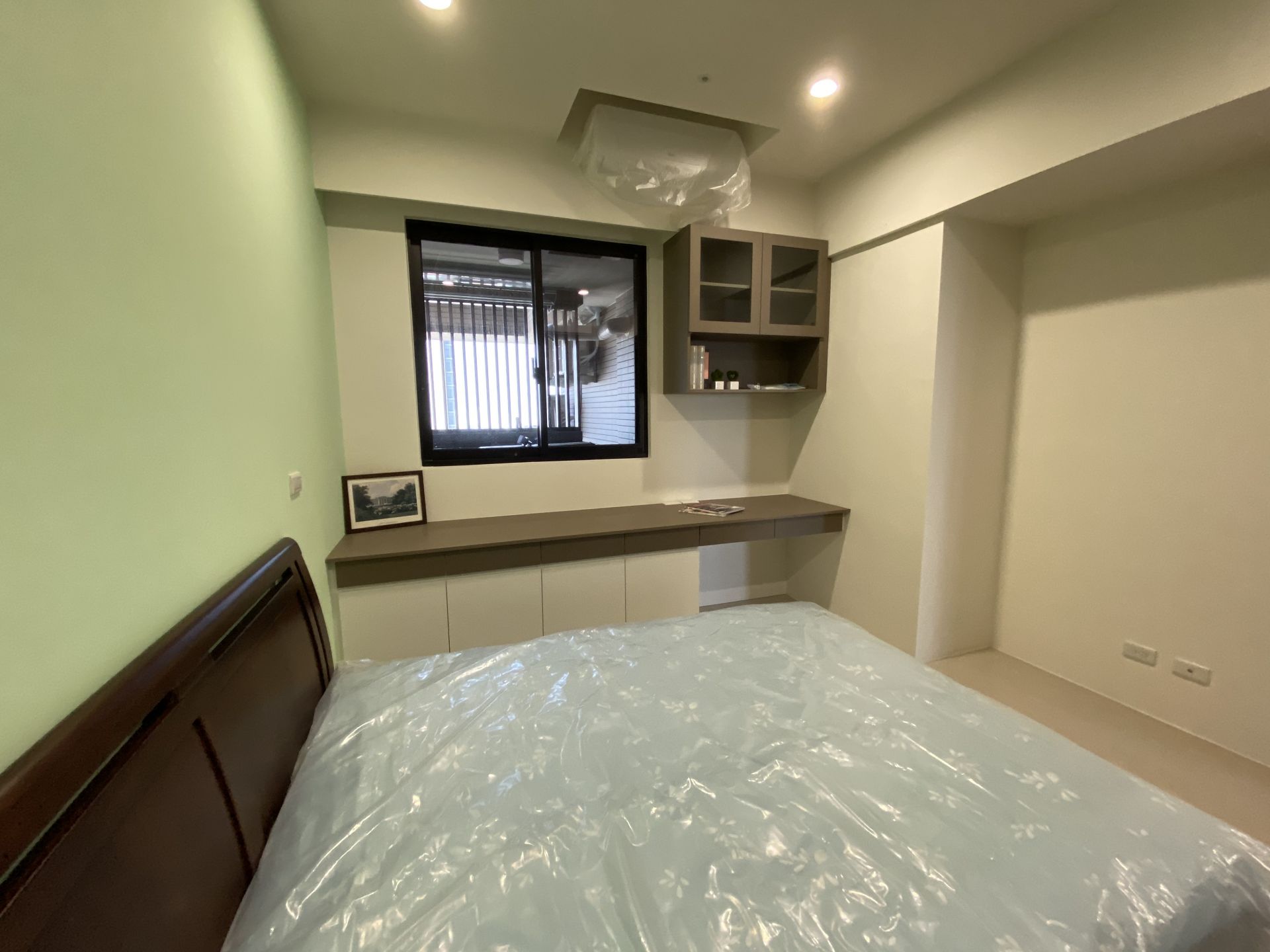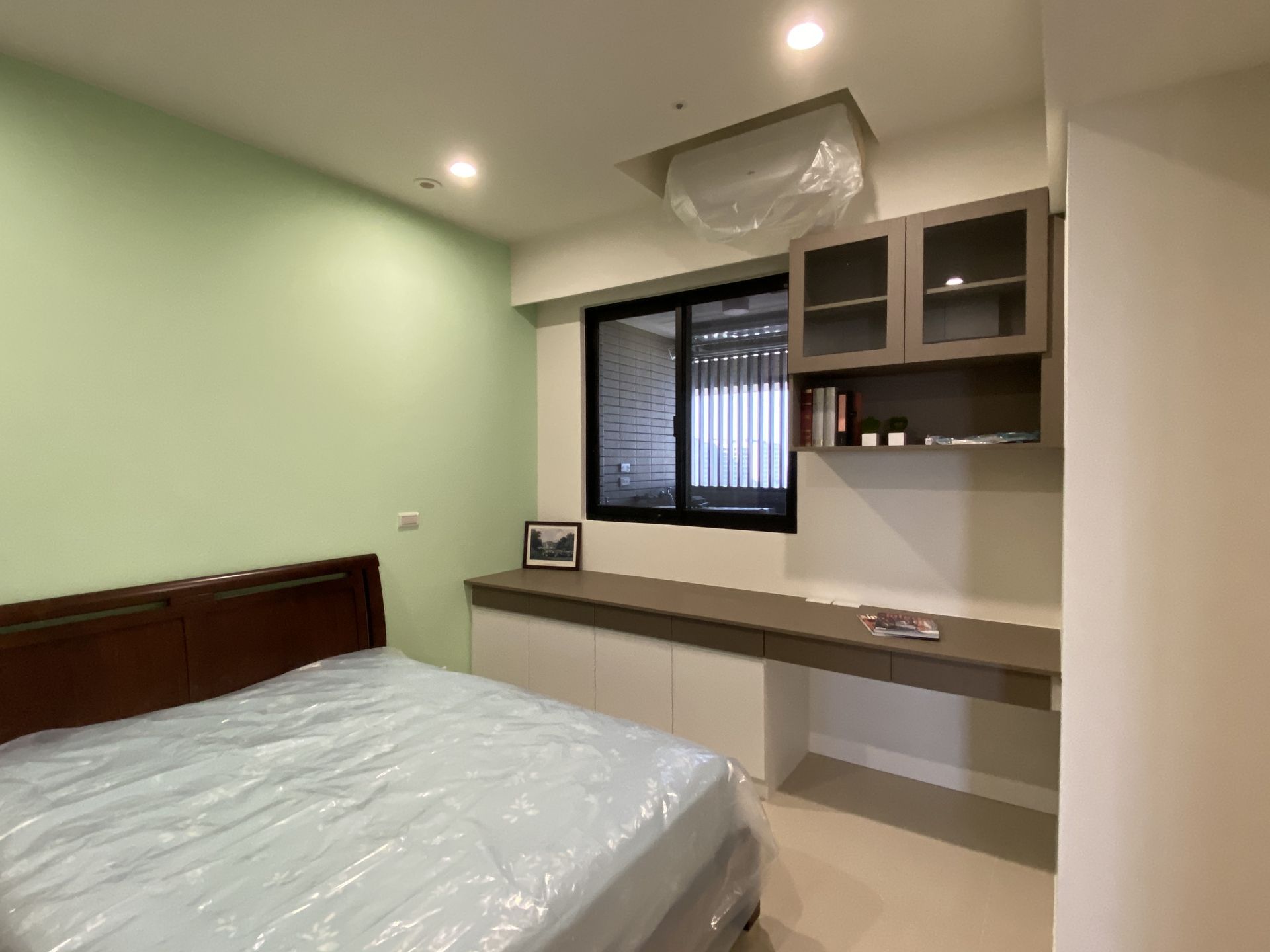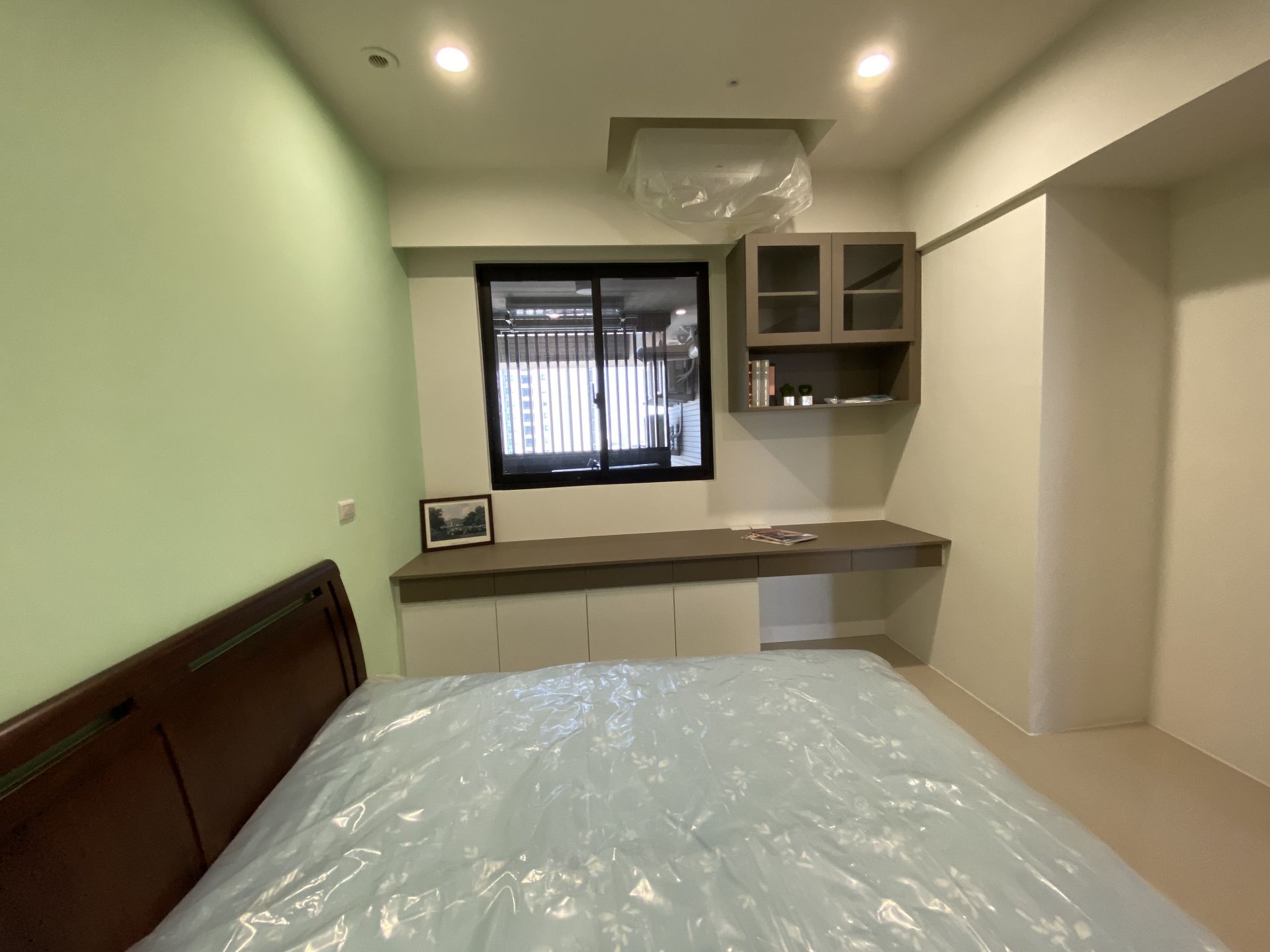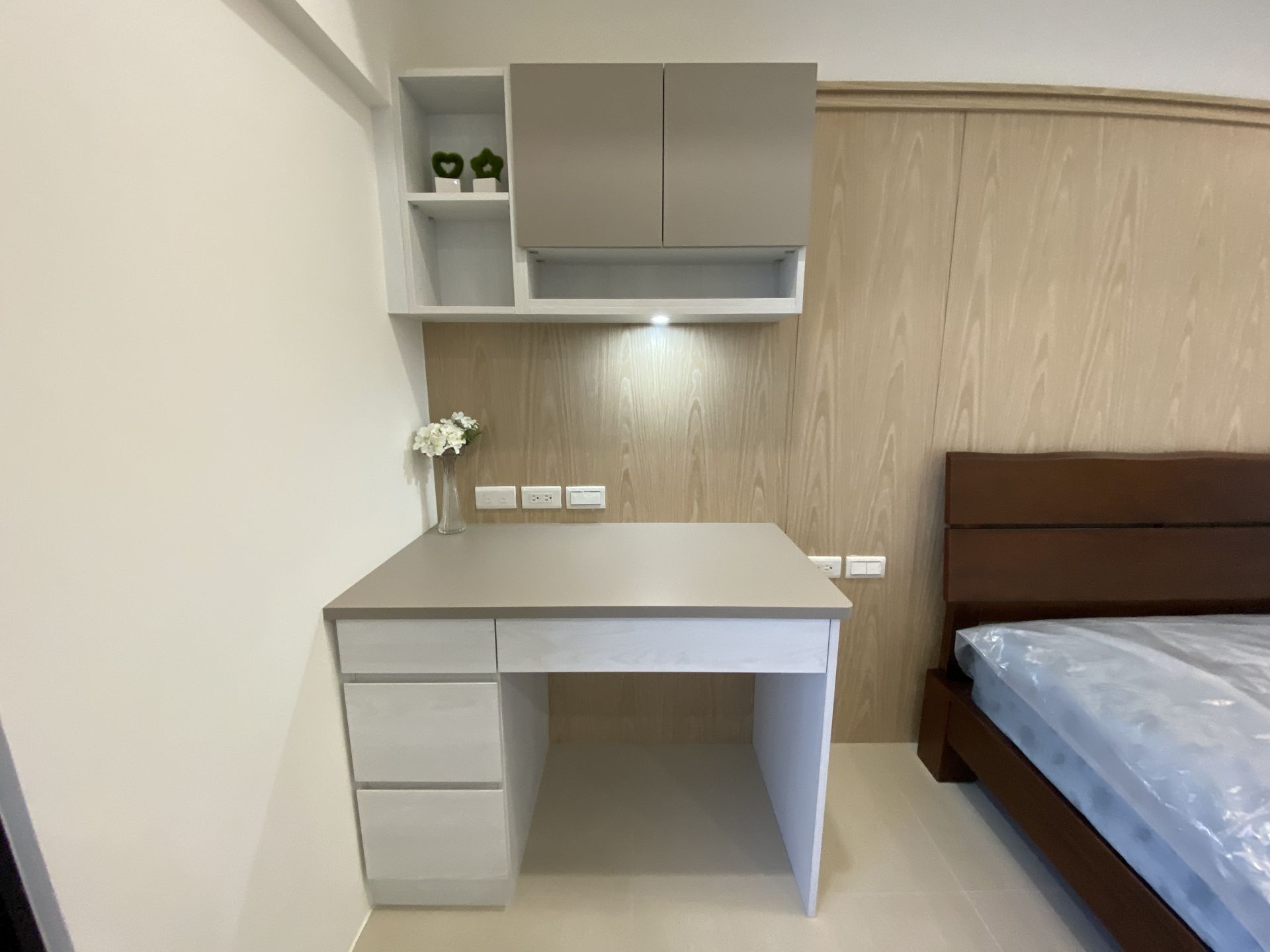 客廳區域,我們運用木作沙發半高牆搭配系統櫃,創造舒適的休憩氛圍,並在電視牆貼上文化石,增添自然紋理。餐廳旁的餐桌旁收納矮櫃組,讓用餐時光更加便利。主臥室內,木作造型斜角圓弧天花板與木作床後造型背牆,營造出溫馨的休憩氛圍,並搭配實用的系統化妝台,滿足日常所需。次臥則規劃了系統書桌組與系統開門衣櫃,兼顧學習與收納。