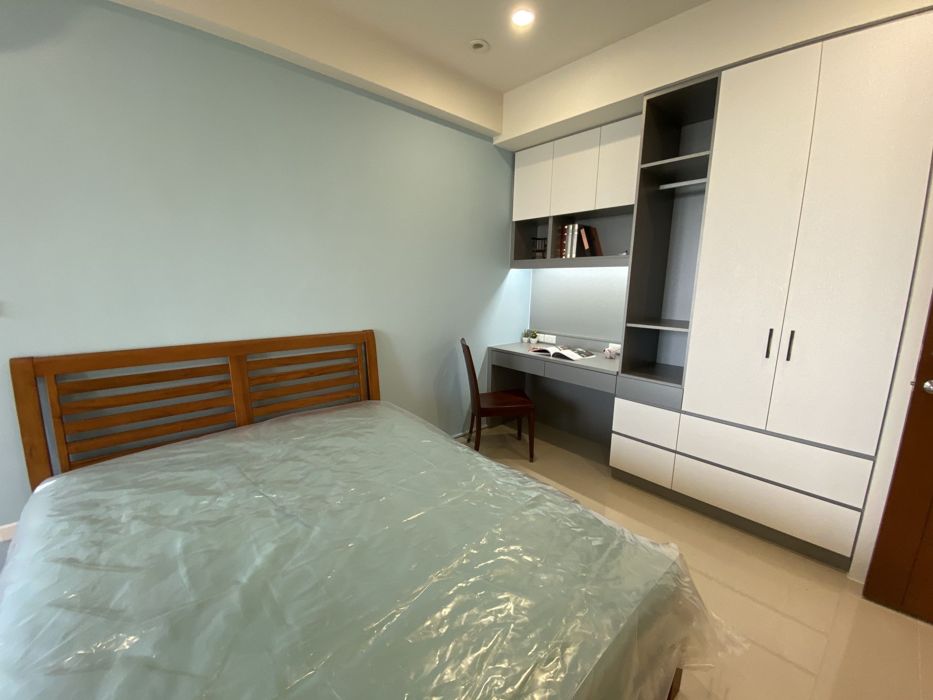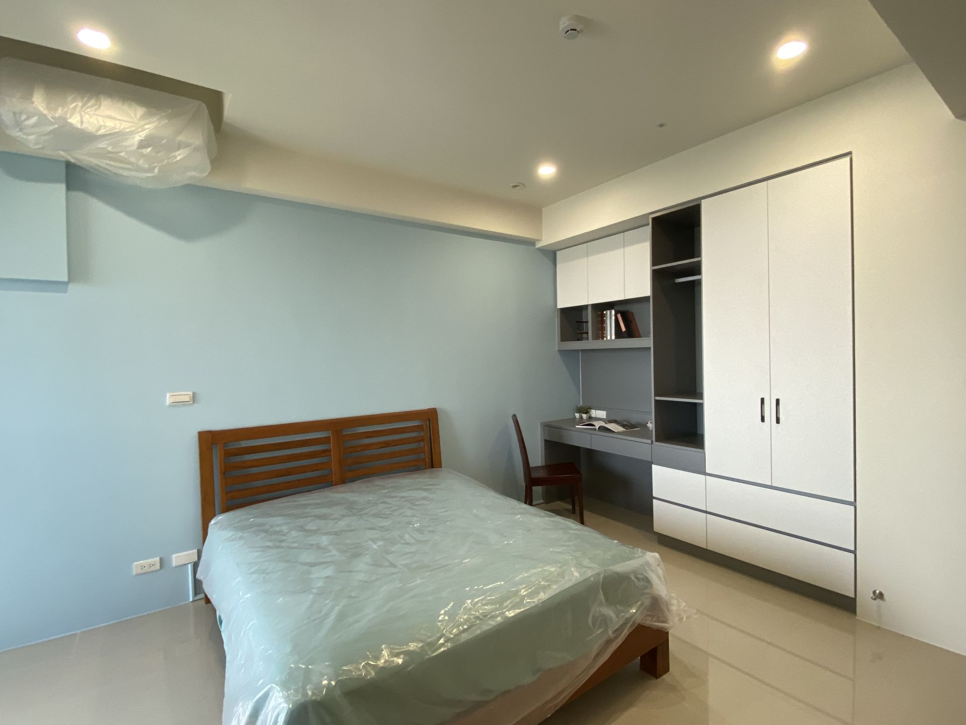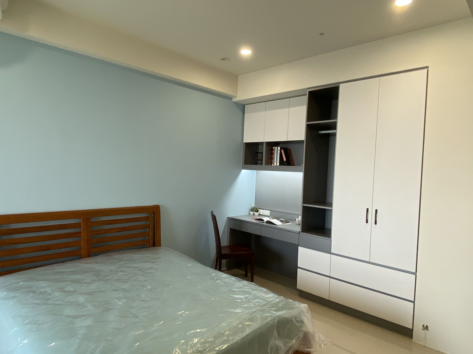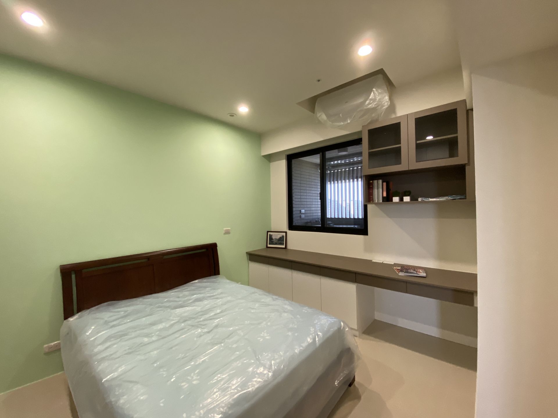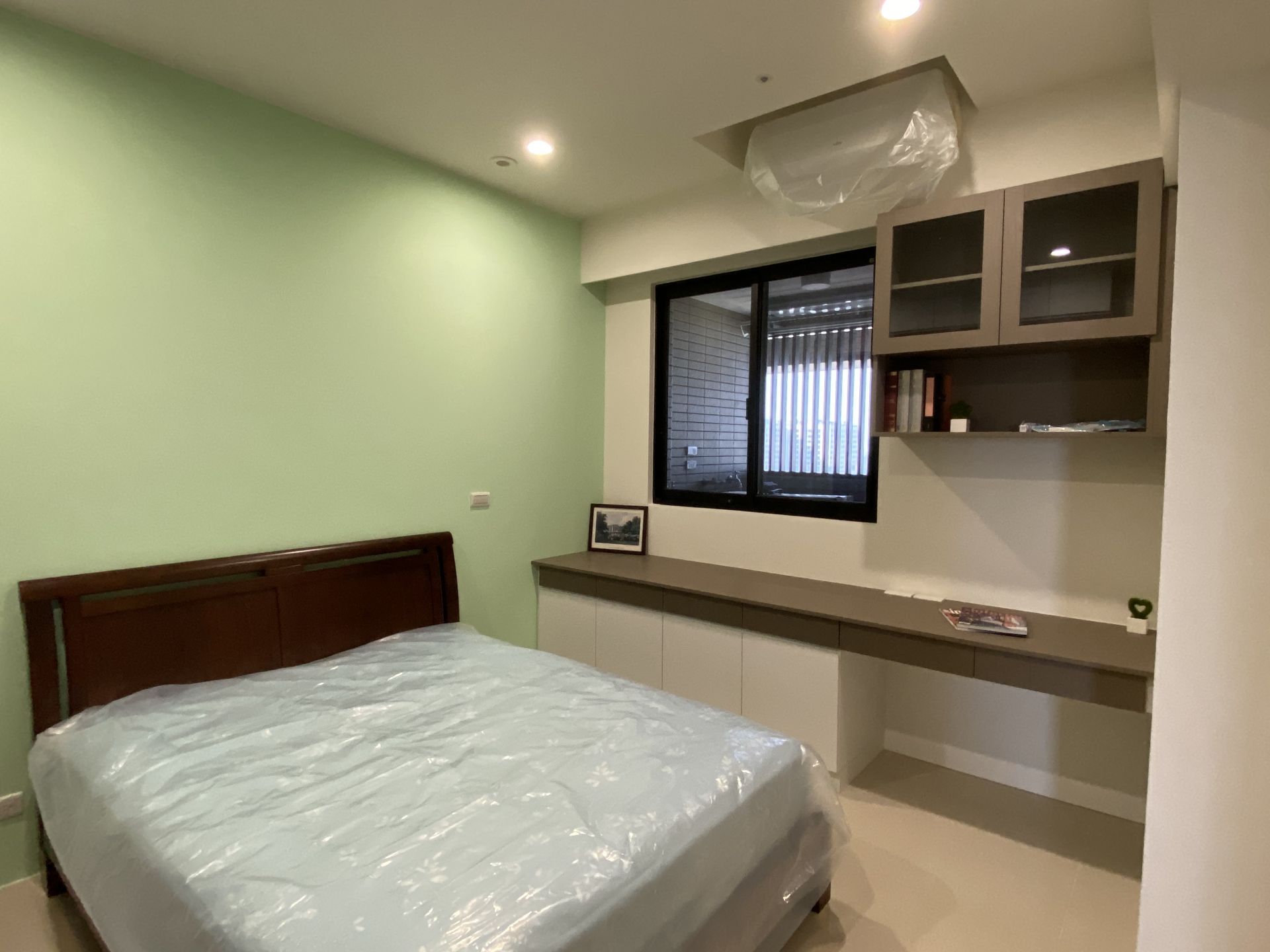客廳區域,我們運用木作沙發半高牆搭配系統櫃,創造舒適的休憩氛圍,並在電視牆貼上文化石,增添自然紋理。餐廳旁的餐桌旁收納矮櫃組,讓用餐時光更加便利。主臥室內,木作造型斜角圓弧天花板與木作床後造型背牆,營造出溫馨的休憩氛圍,並搭配實用的系統化妝台,滿足日常所需。次臥則規劃了系統書桌組與系統開門衣櫃,兼顧學習與收納。