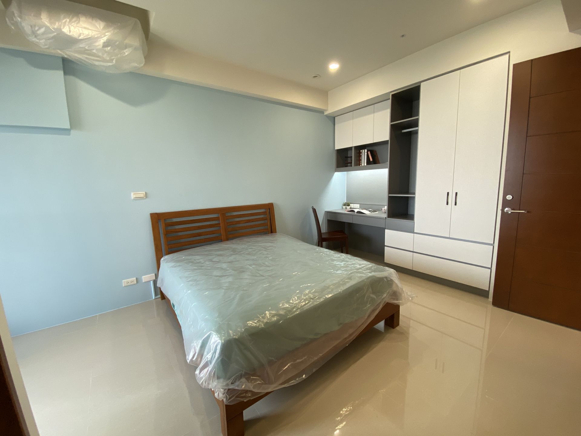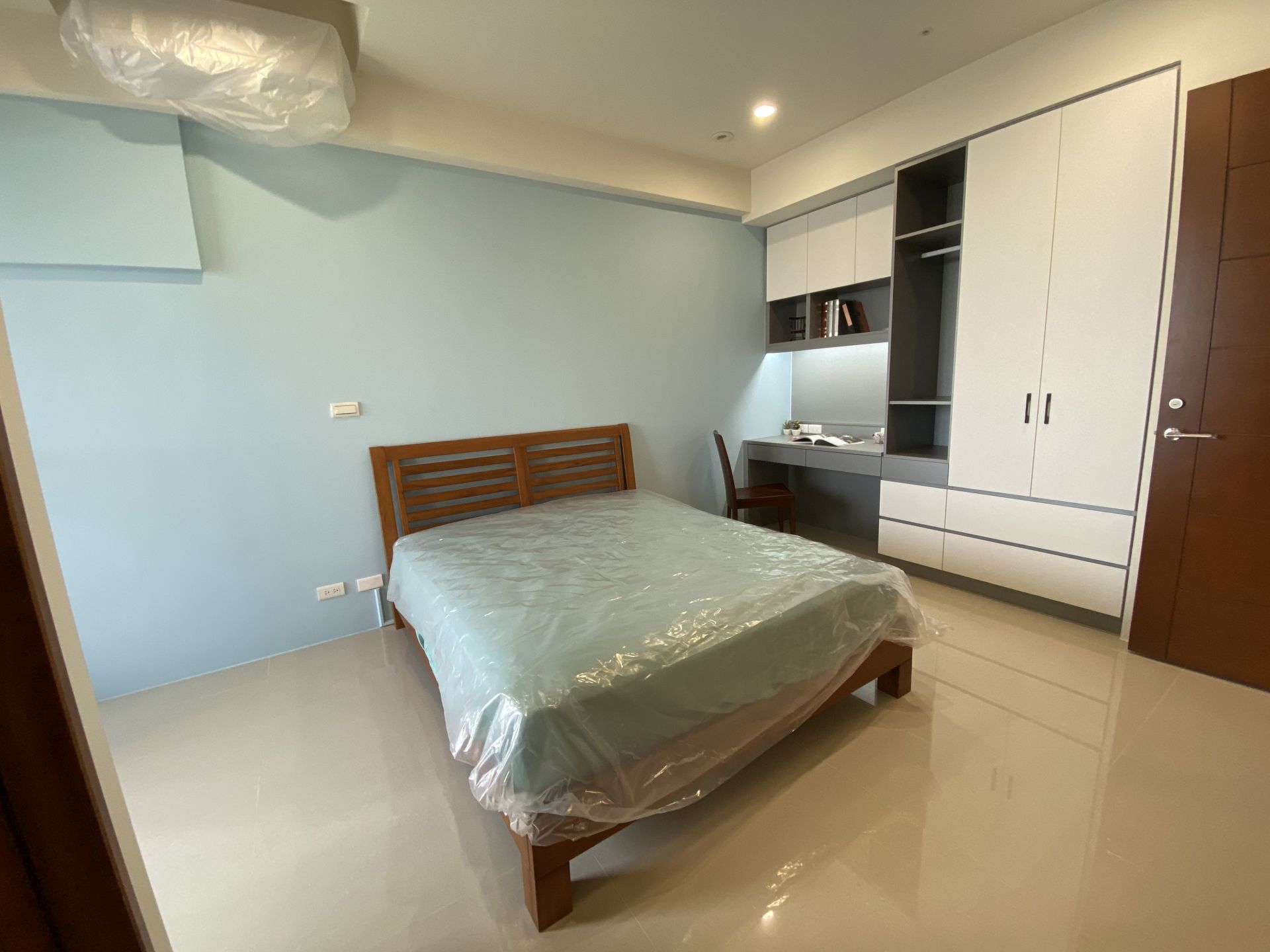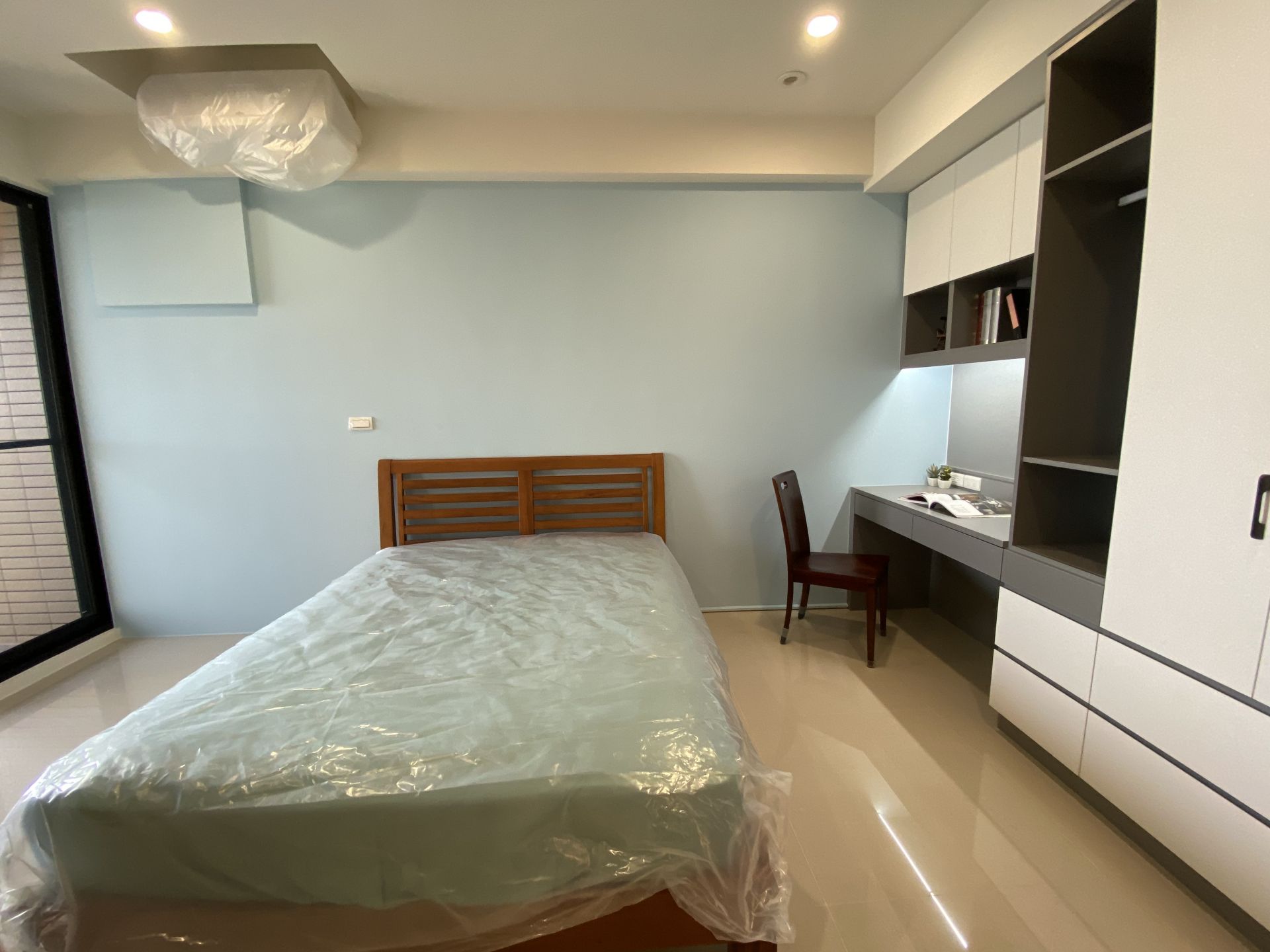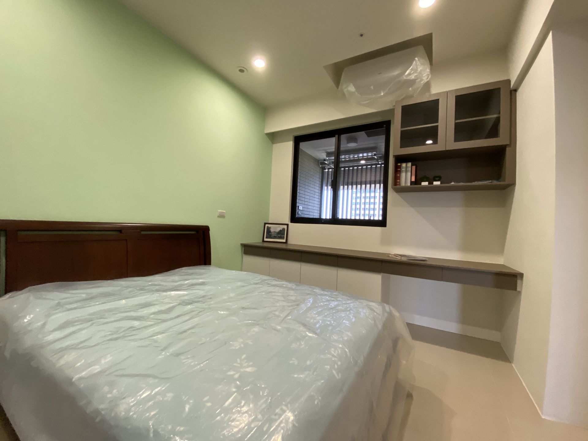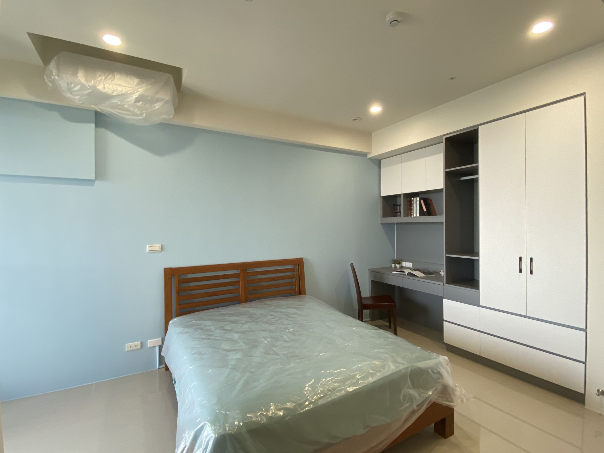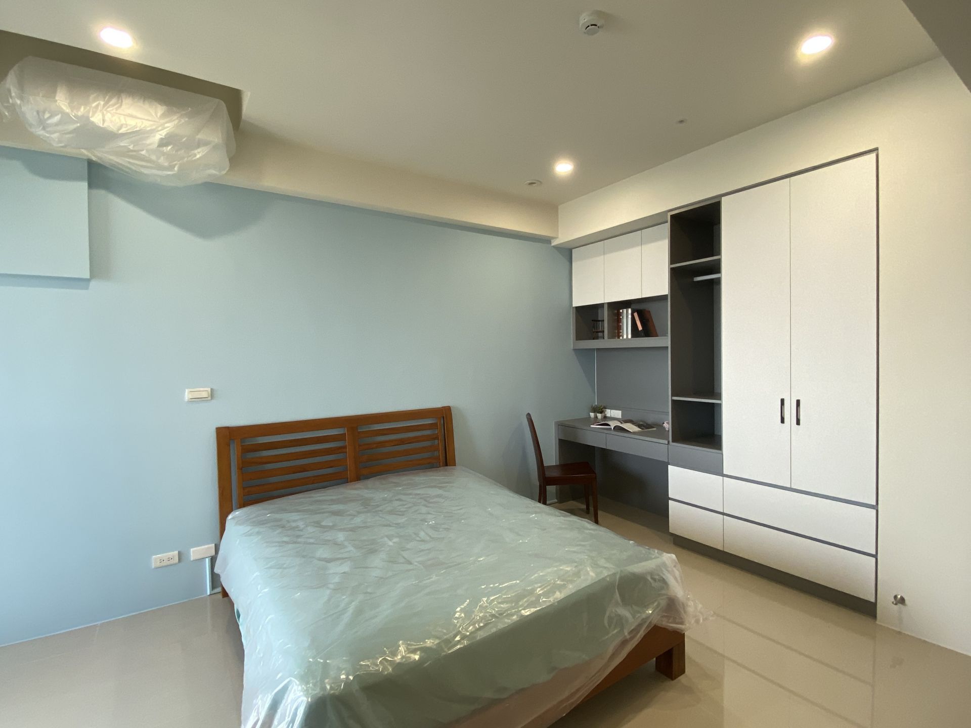 客廳區域,我們運用木作沙發半高牆搭配系統櫃,創造舒適的休憩氛圍,並在電視牆貼上文化石,增添自然紋理。餐廳旁的餐桌旁收納矮櫃組,讓用餐時光更加便利。主臥室內,木作造型斜角圓弧天花板與木作床後造型背牆,營造出溫馨的休憩氛圍,並搭配實用的系統化妝台,滿足日常所需。次臥則規劃了系統書桌組與系統開門衣櫃,兼顧學習與收納。