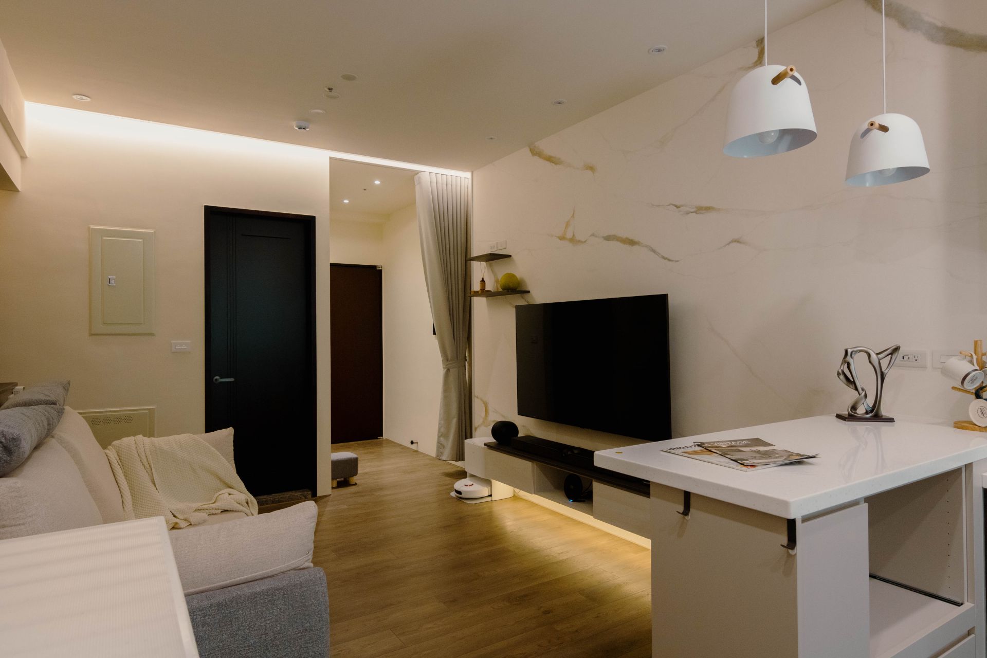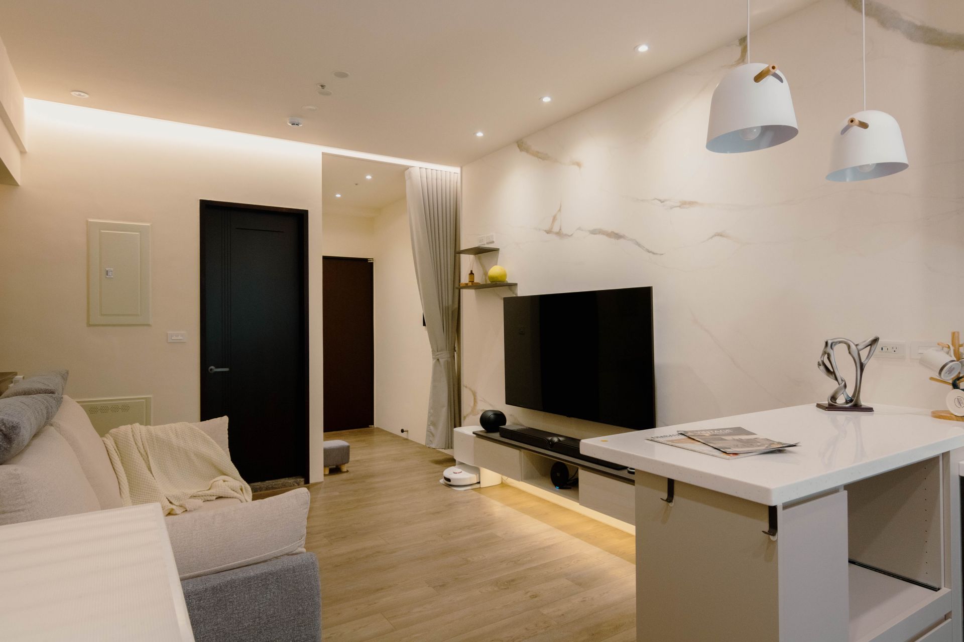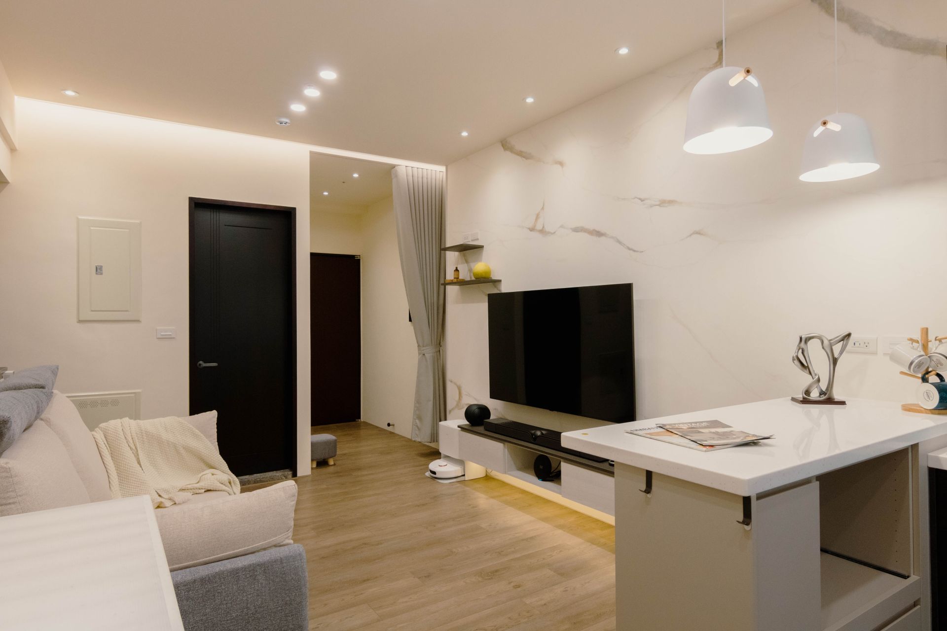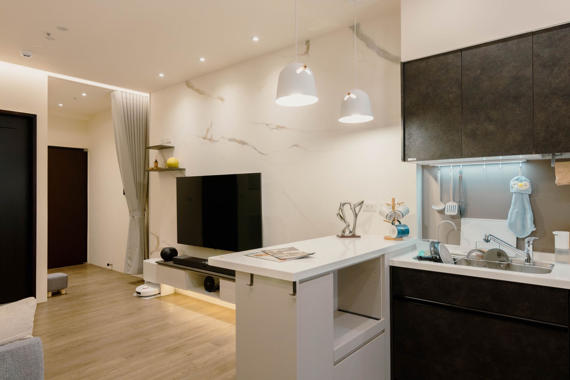 客廳電視牆面漆上溫暖塗料,並以系統修飾櫃巧妙整合電箱,維持視覺整潔。餐廳區域利用人造石吧檯,下方搭配系統矮櫃、系統餐邊矮櫃與緩衝抽屜、拉盤,不僅增加收納,更成為家人的互動核心。