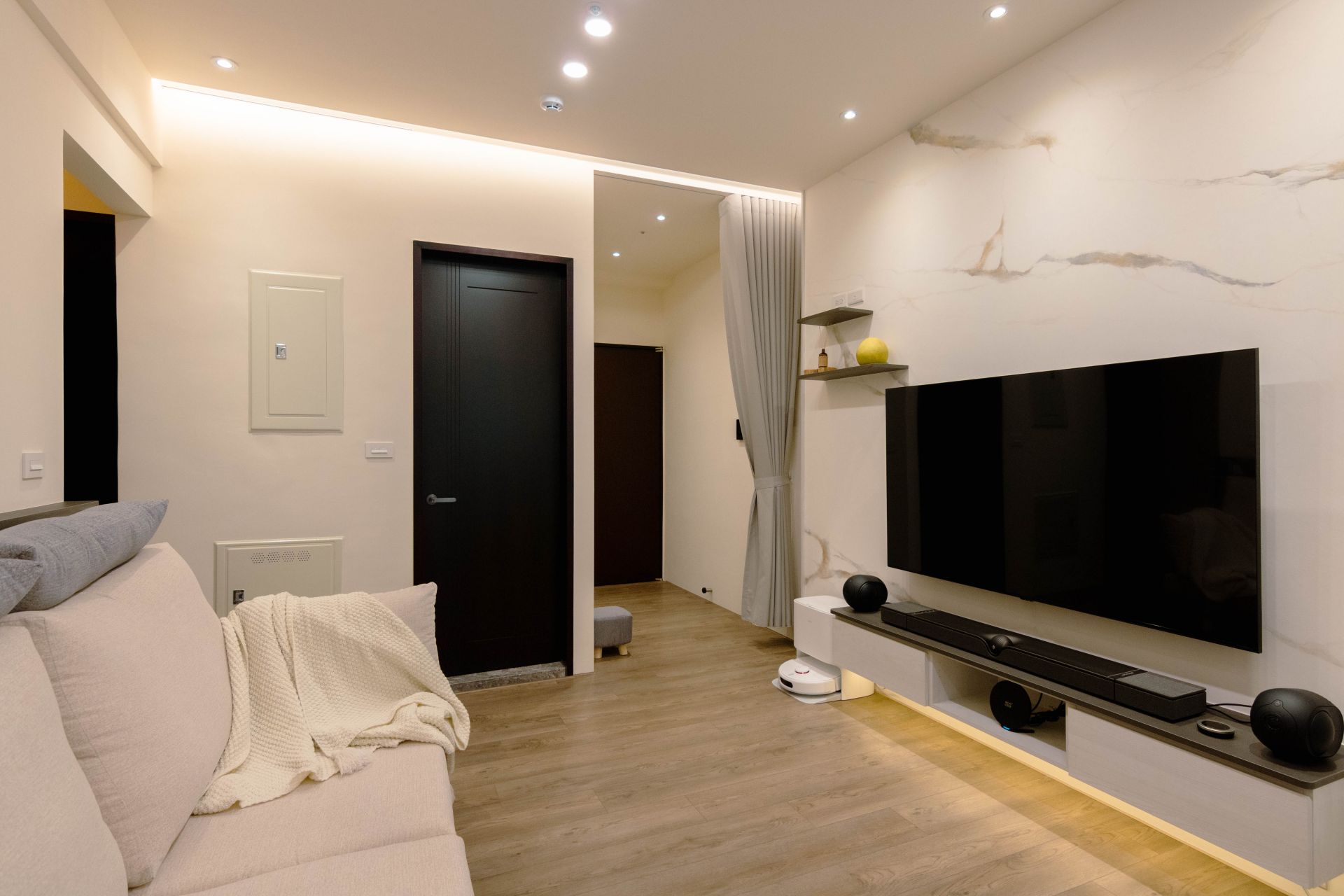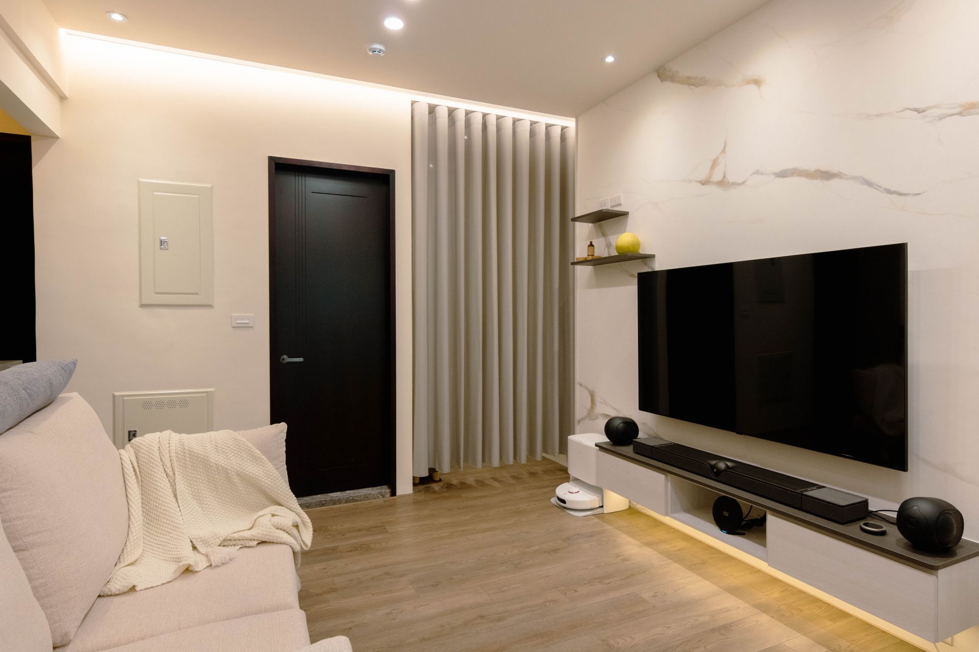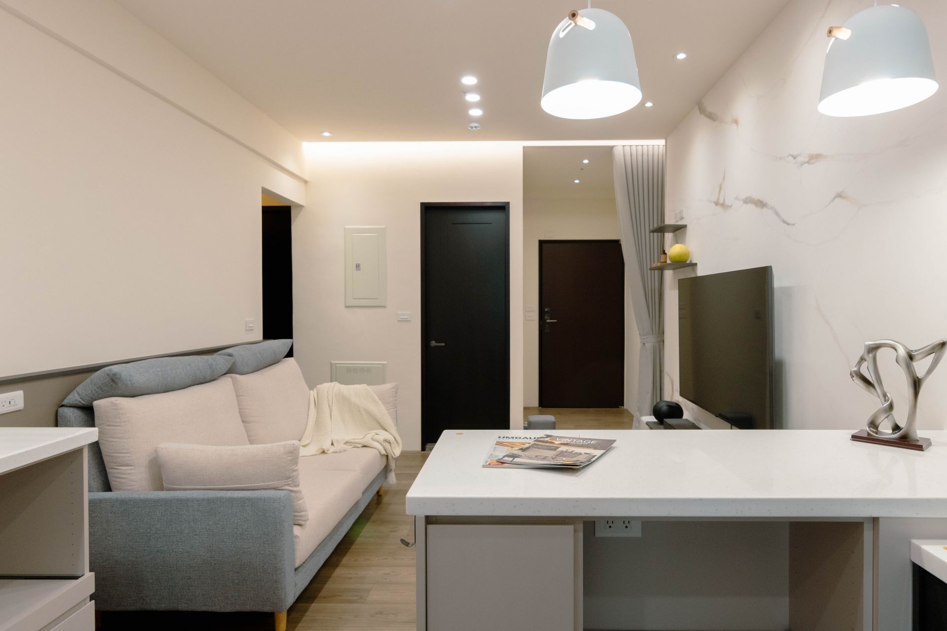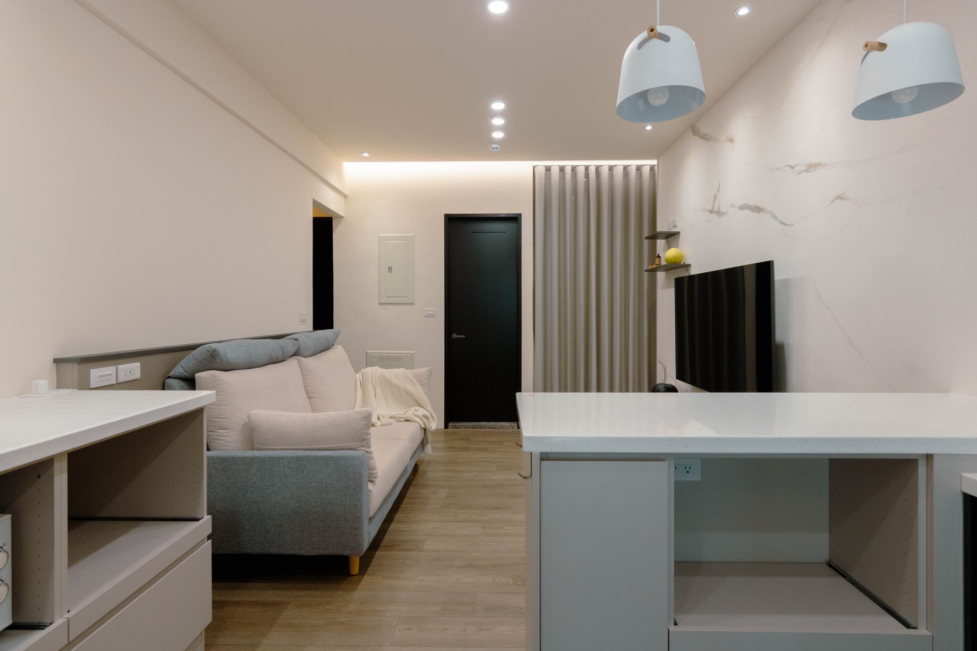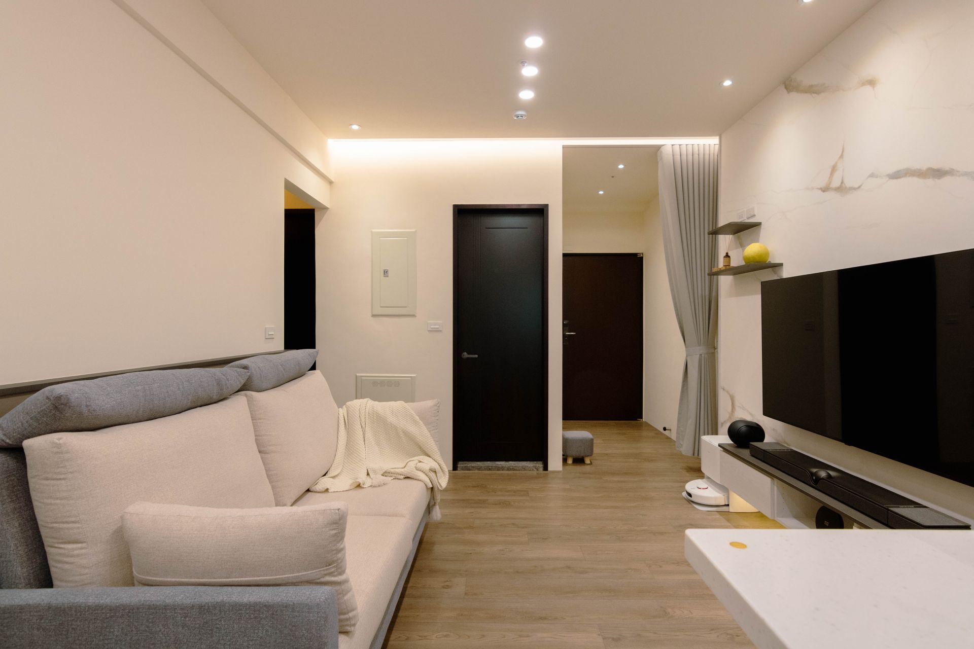 客廳電視牆面漆上溫暖塗料,並以系統修飾櫃巧妙整合電箱,維持視覺整潔。餐廳區域利用人造石吧檯,下方搭配系統矮櫃、系統餐邊矮櫃與緩衝抽屜、拉盤,不僅增加收納,更成為家人的互動核心。
