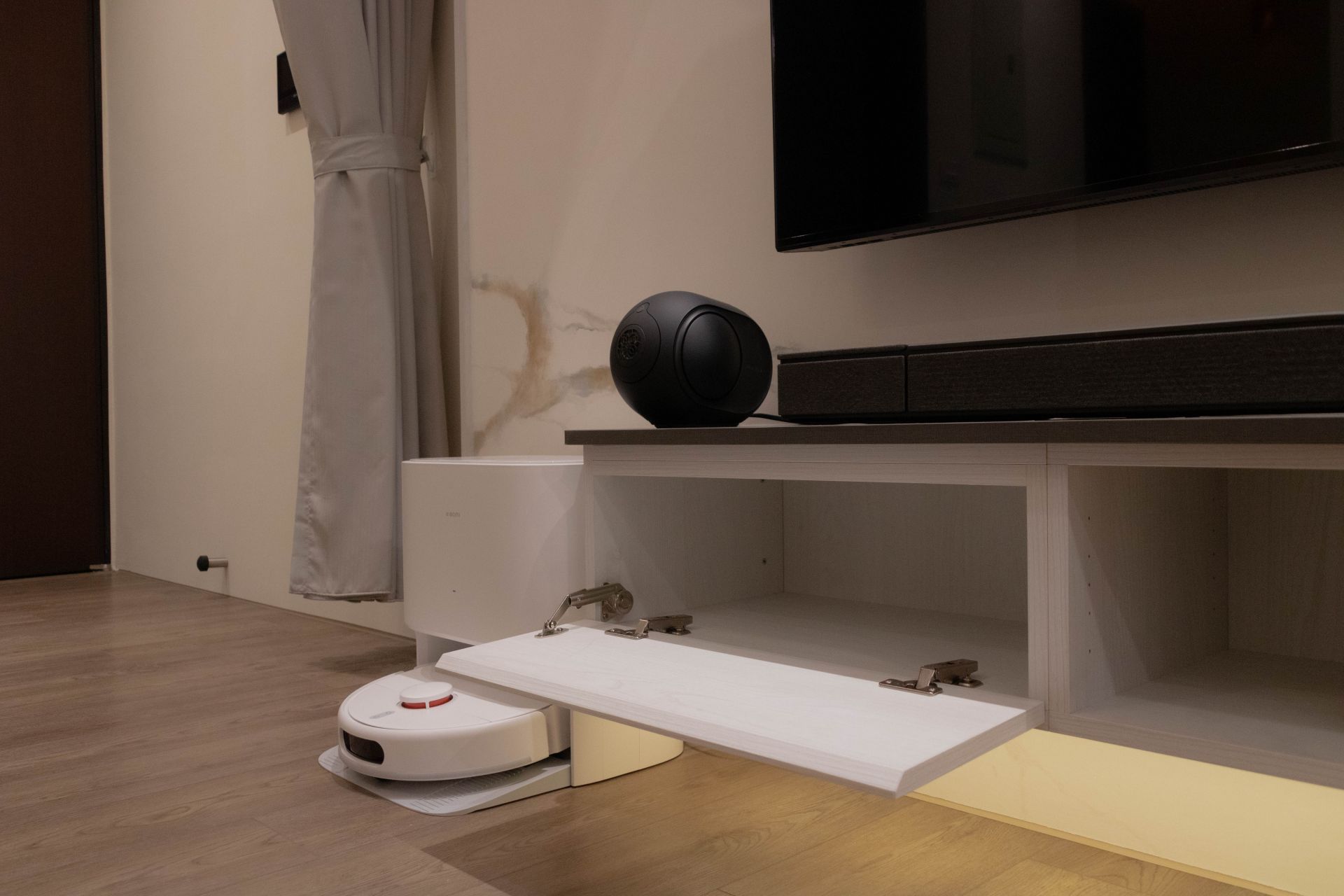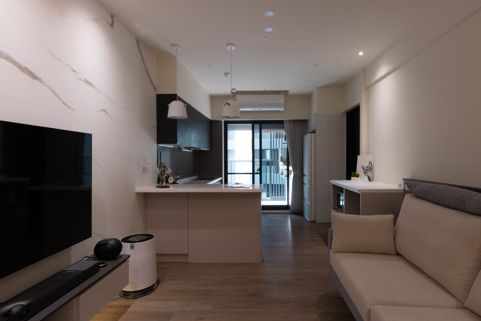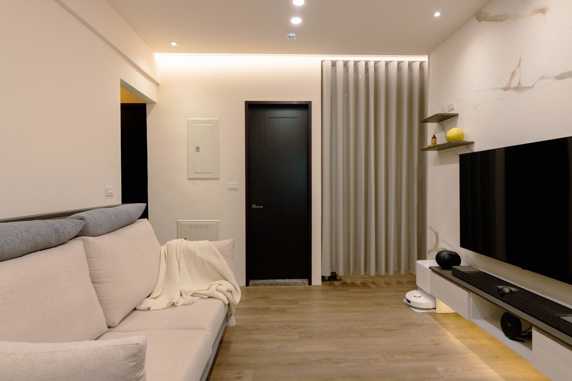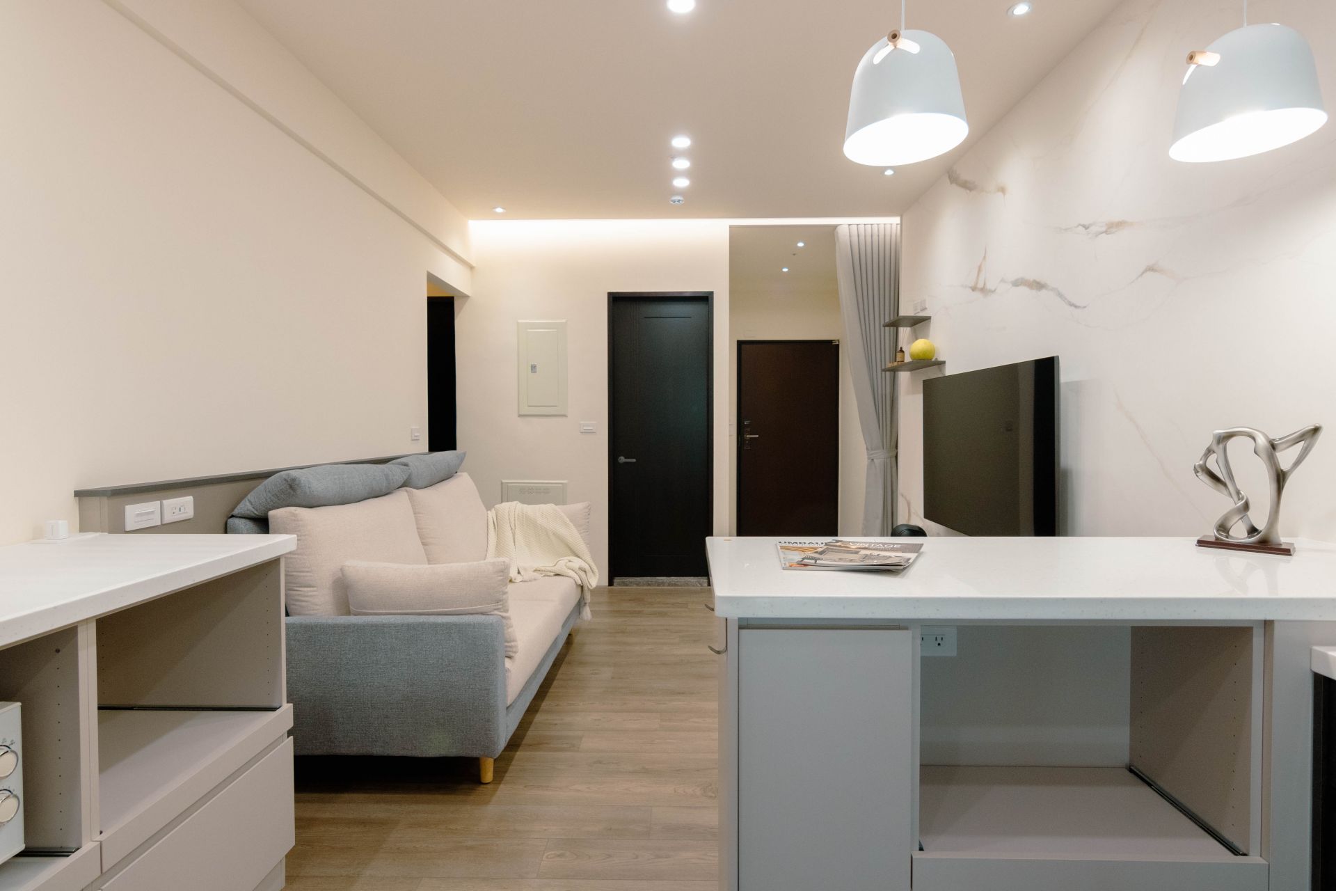 客廳電視牆面漆上溫暖塗料,並以系統修飾櫃巧妙整合電箱,維持視覺整潔。餐廳區域利用人造石吧檯,下方搭配系統矮櫃、系統餐邊矮櫃與緩衝抽屜、拉盤,不僅增加收納,更成為家人的互動核心。