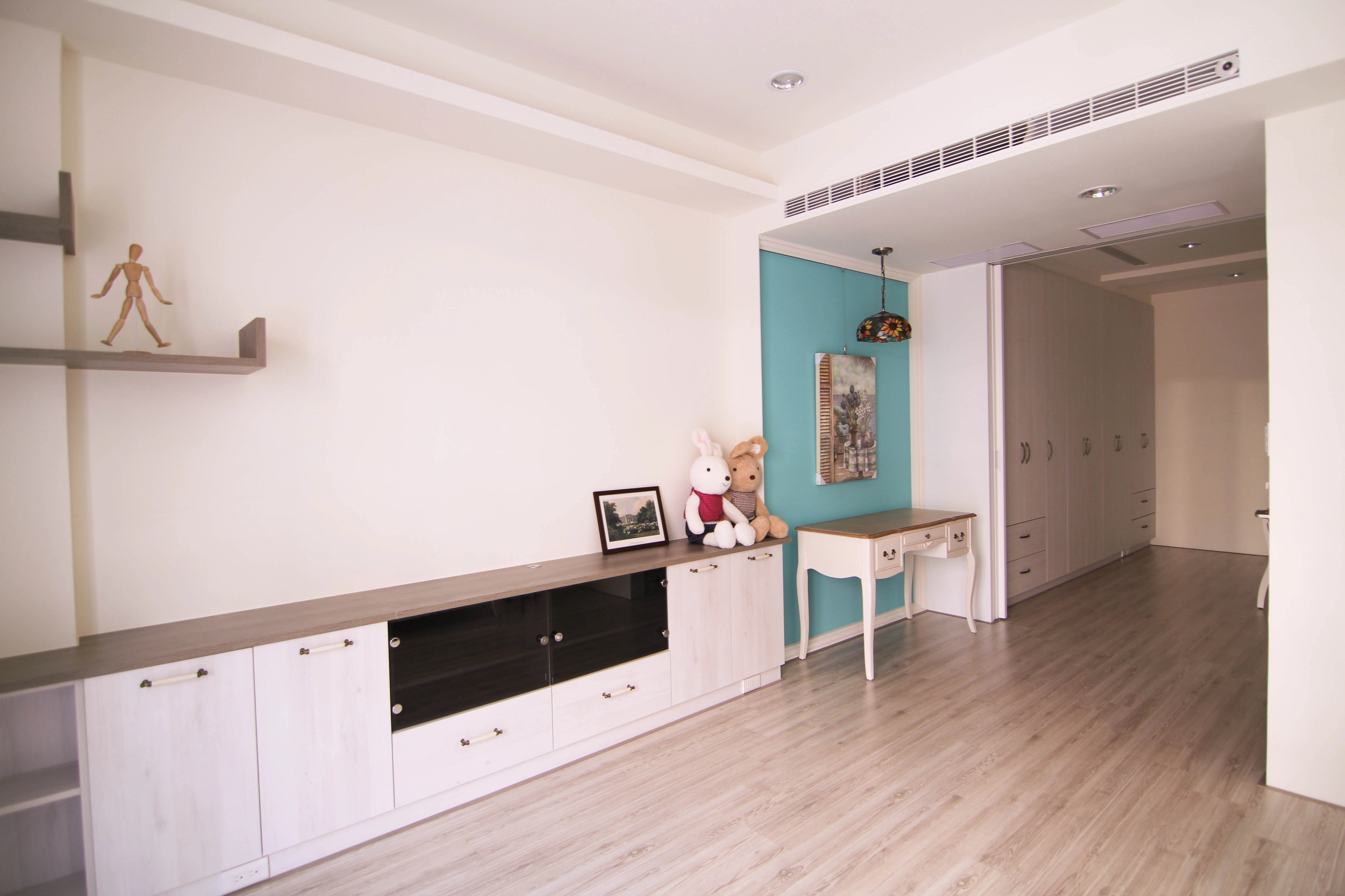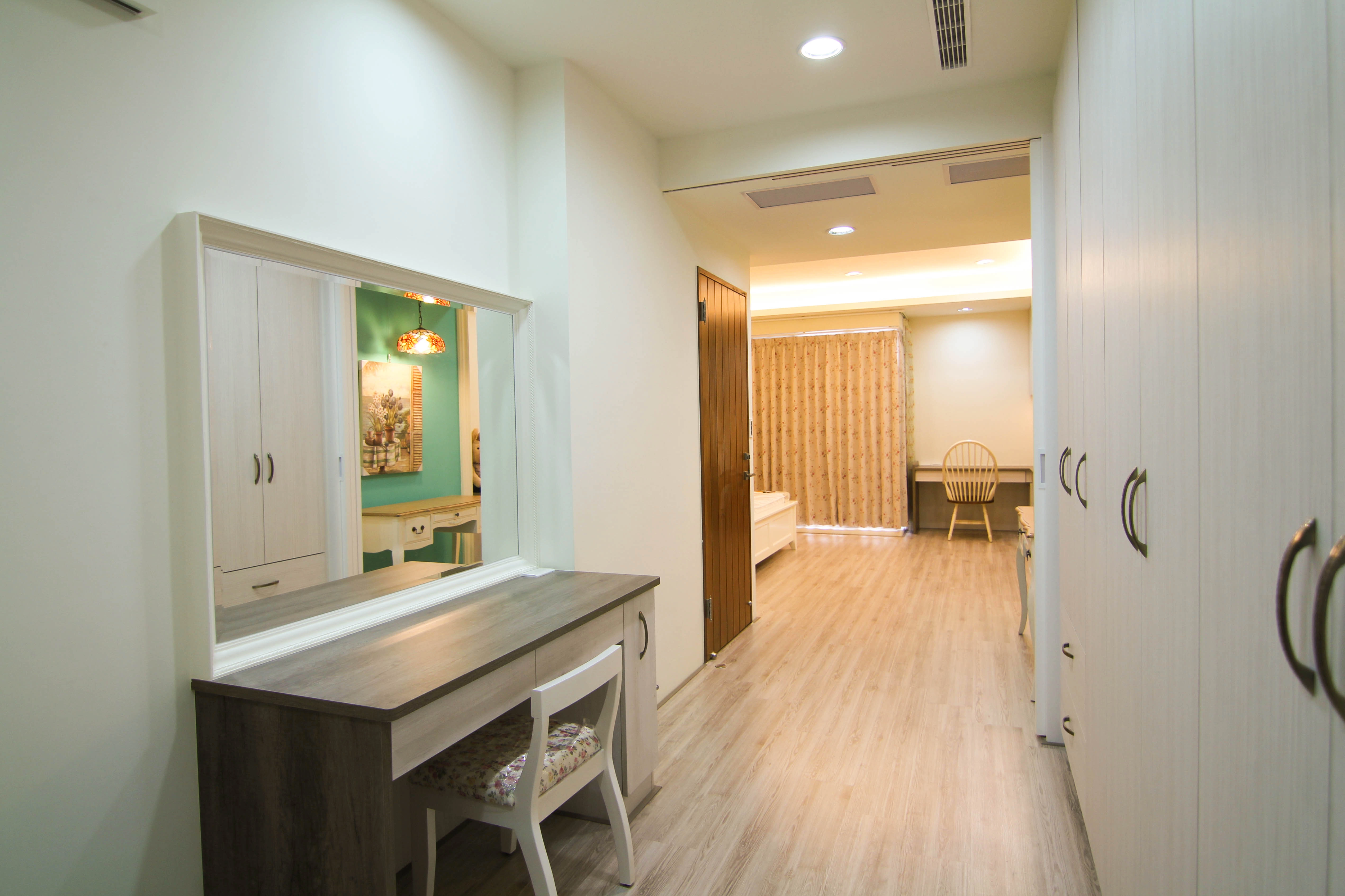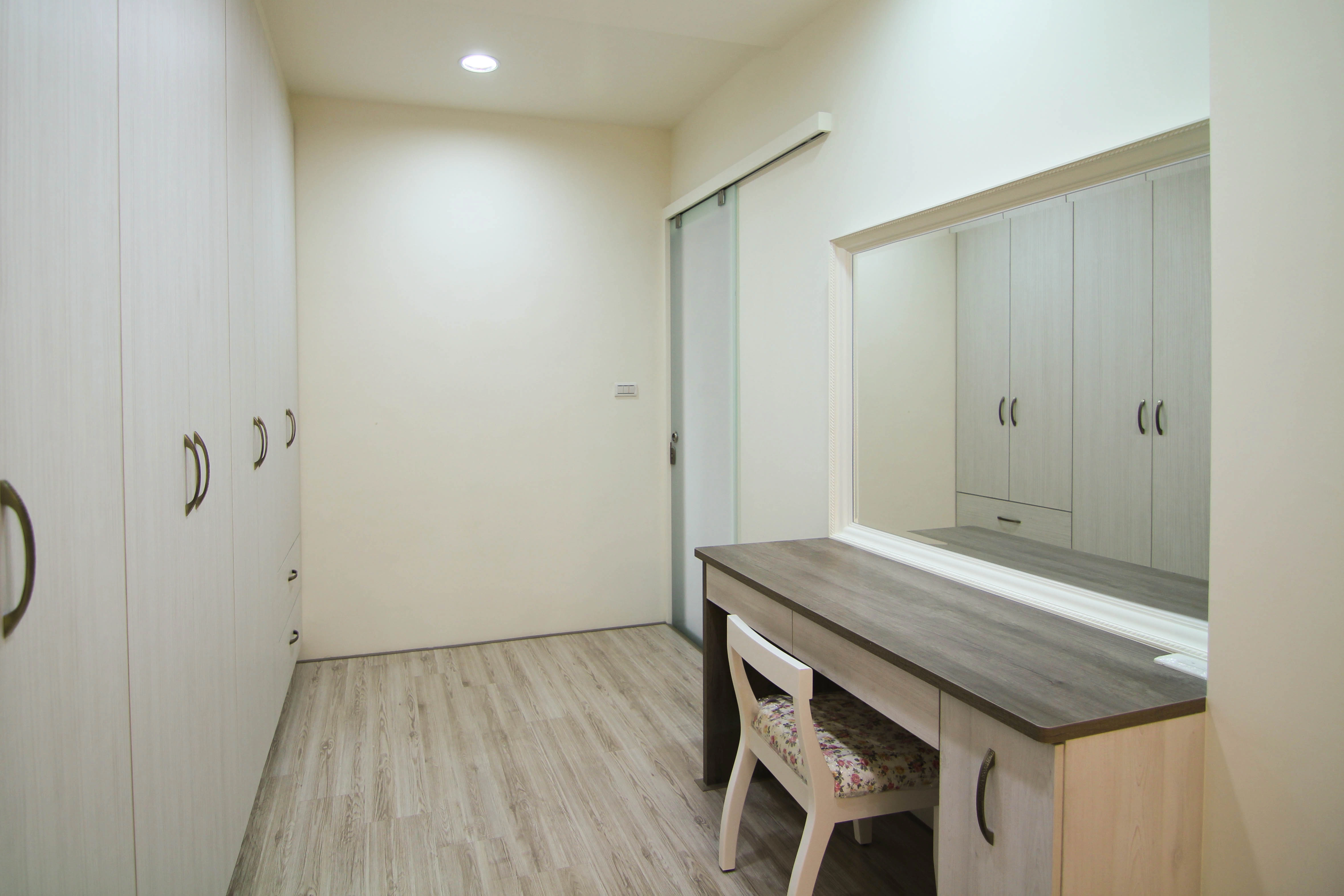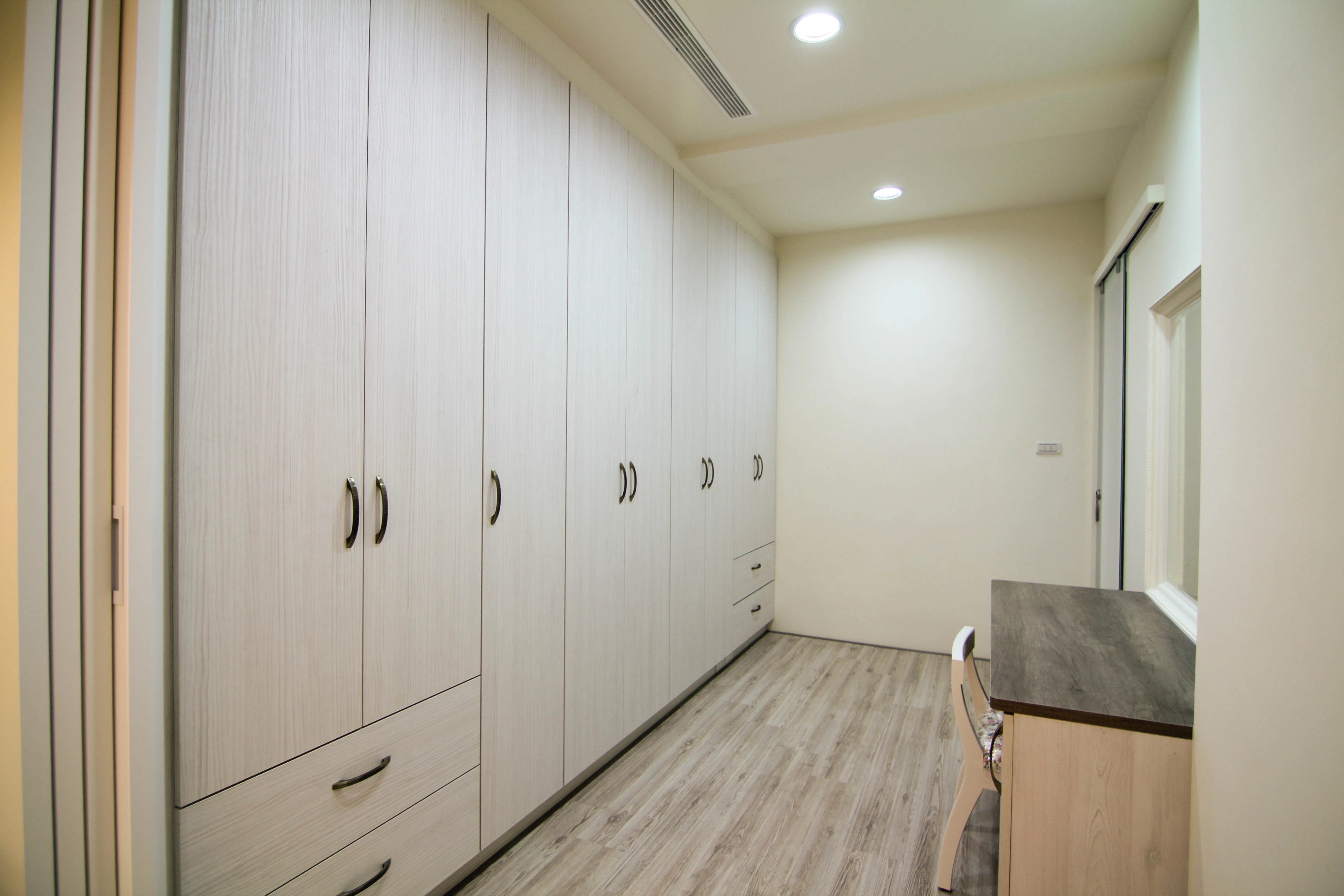 公領域規劃了實用吧台,成為家人輕食交流的核心;私領域則發揮系統家具的靈活性,將主臥書桌與收納機能完美整合。更衣室內部配置整套淺木紋衣櫃與化妝桌,不僅將生活備品收納於無形,更維持了視覺的一致與清爽,讓空間使用起來更加井然有序且順手。