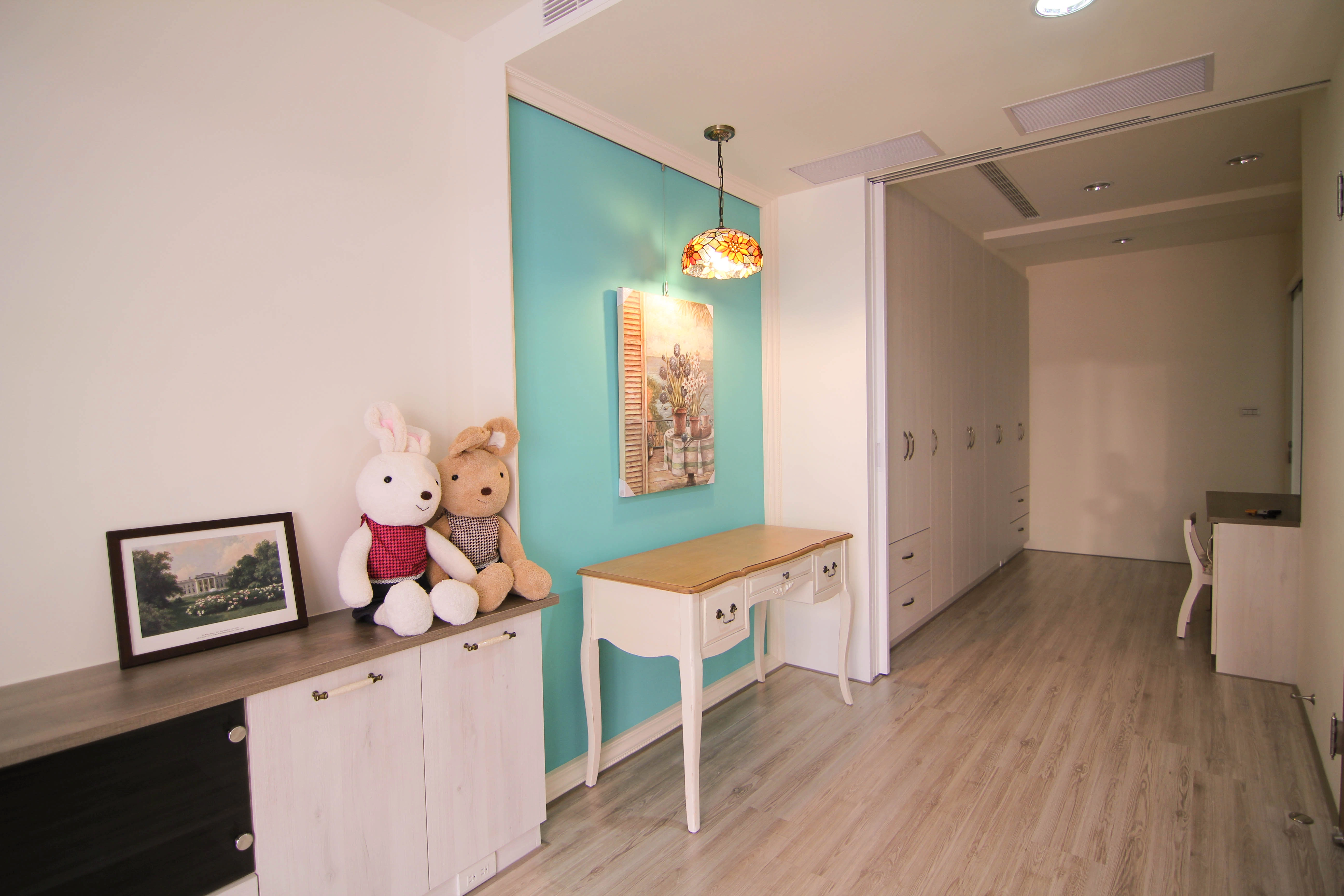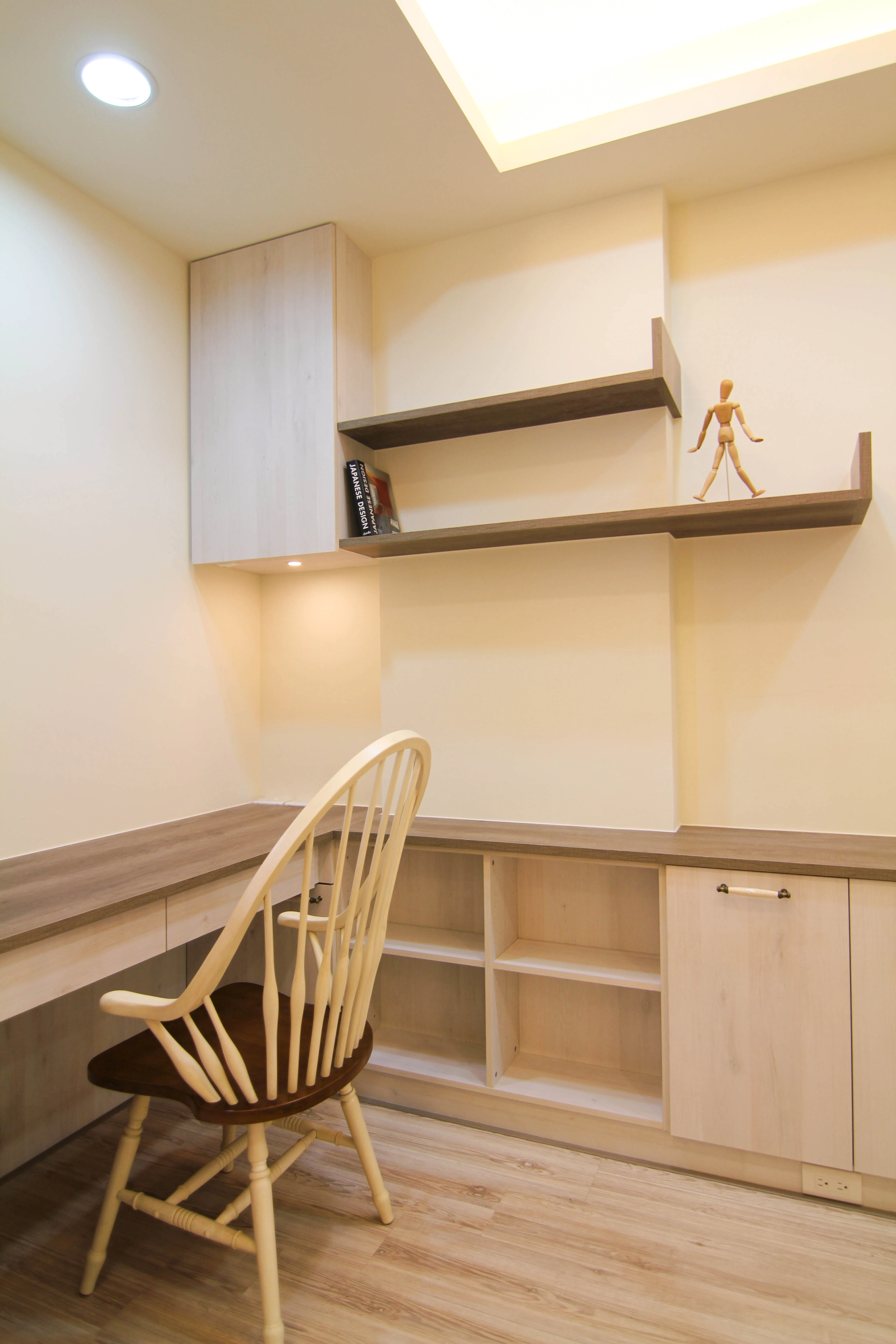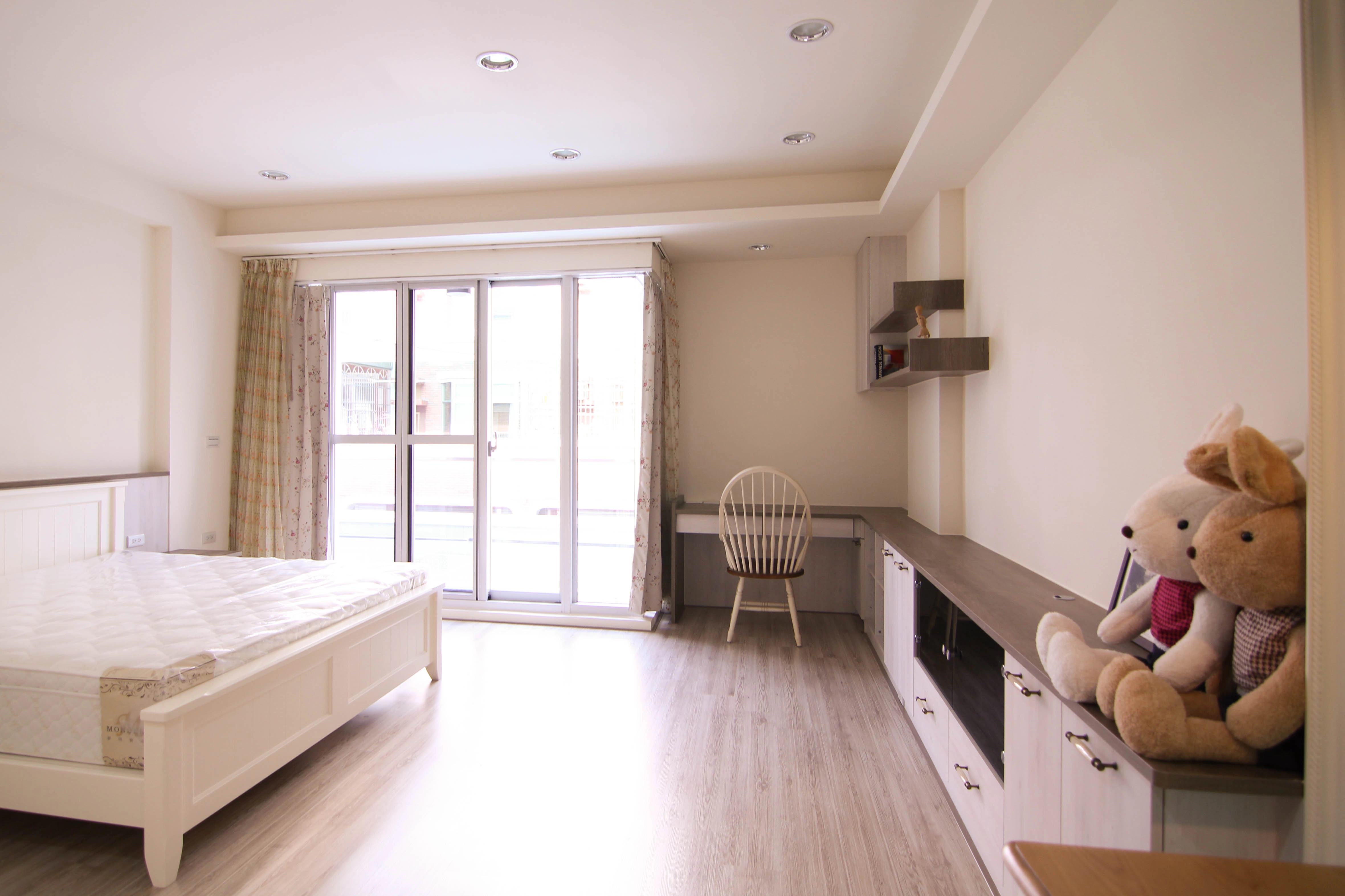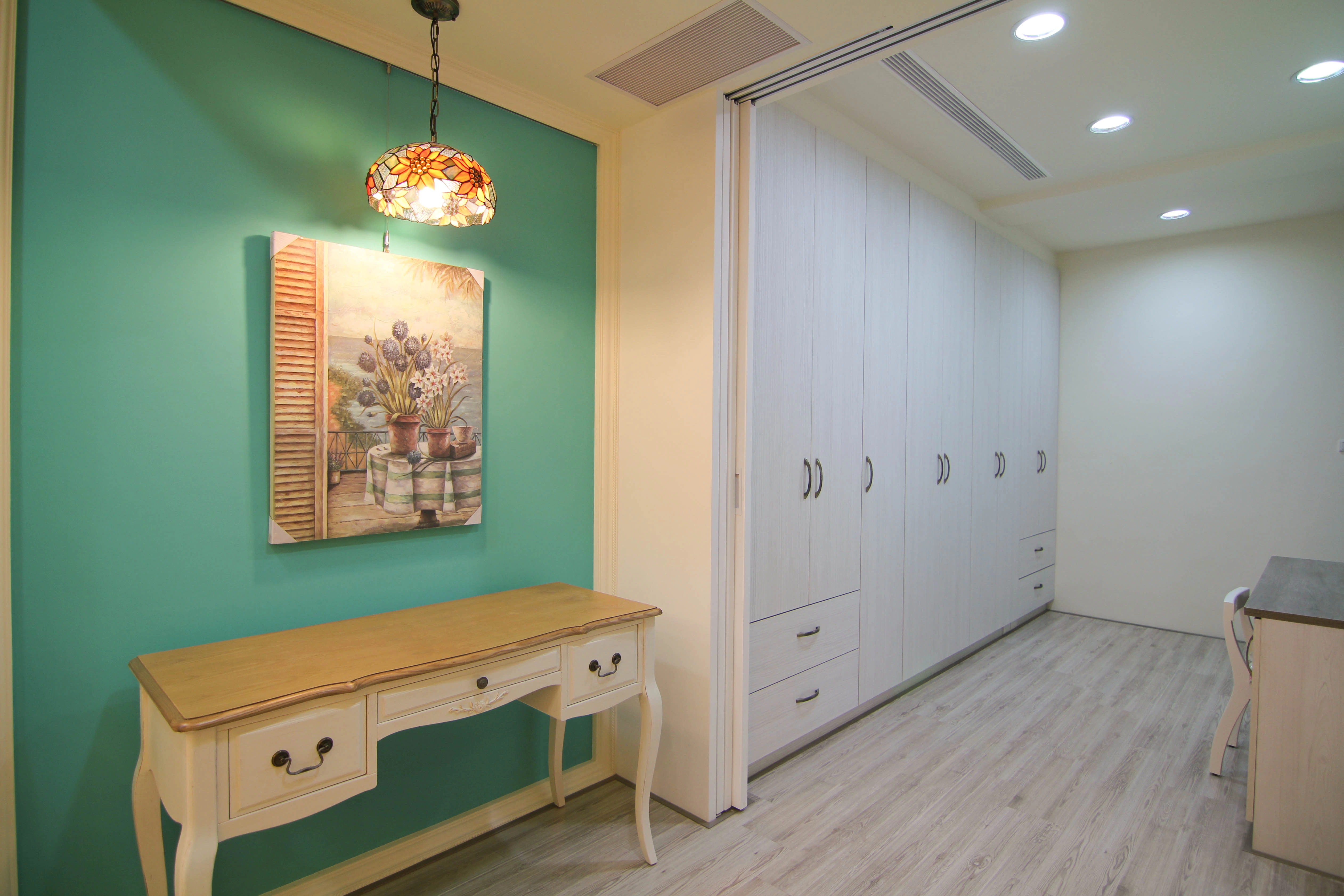 公領域規劃了實用吧台,成為家人輕食交流的核心;私領域則發揮系統家具的靈活性,將主臥書桌與收納機能完美整合。更衣室內部配置整套淺木紋衣櫃與化妝桌,不僅將生活備品收納於無形,更維持了視覺的一致與清爽,讓空間使用起來更加井然有序且順手。