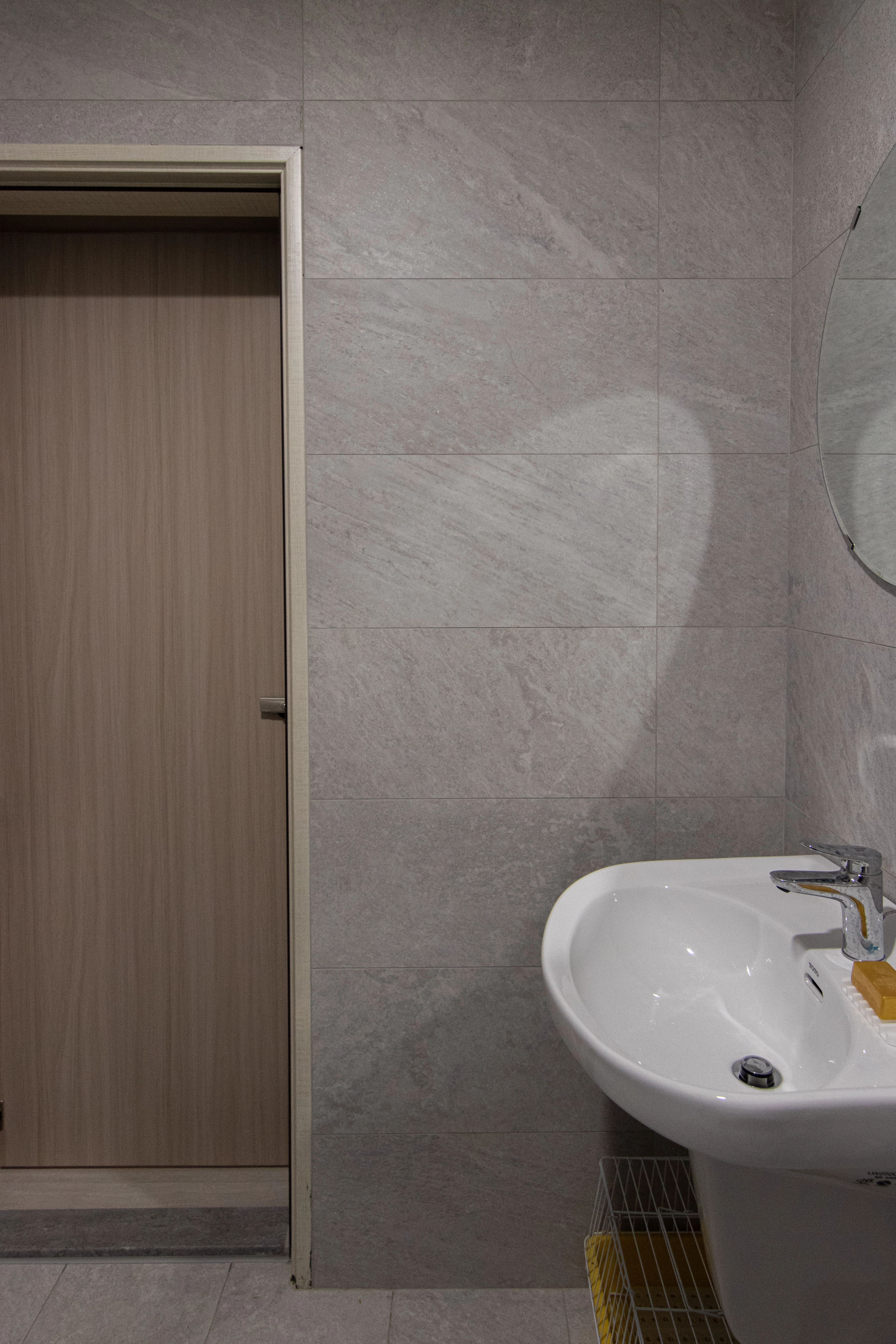 德盈台南室內設計團隊將安南安富街老屋蛻變為避暑綠洲。全棟廁所更換門片,並於門檻選用石材與人造石,衛浴設備更升級為 TOTO 龍捲噴射式馬桶。