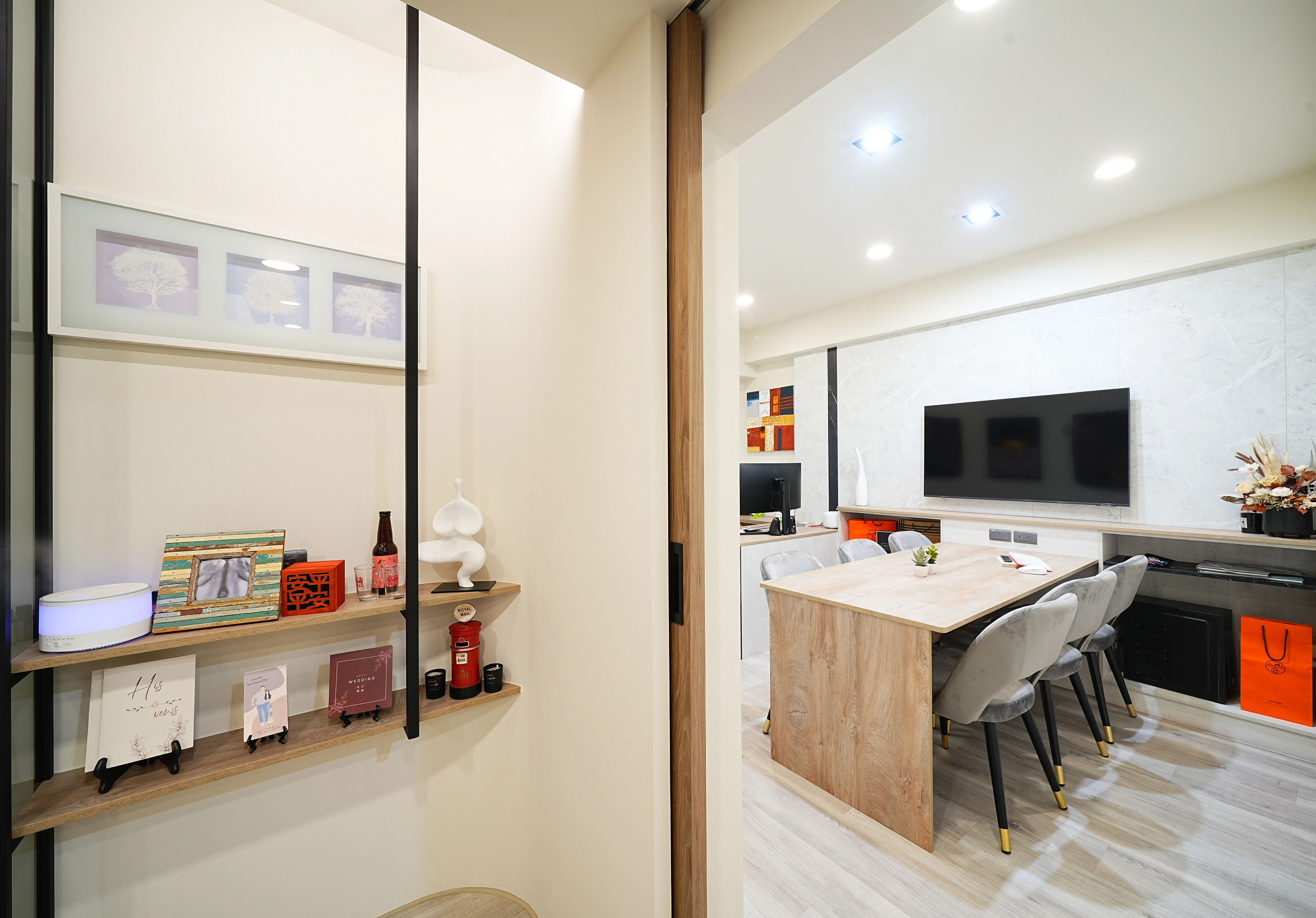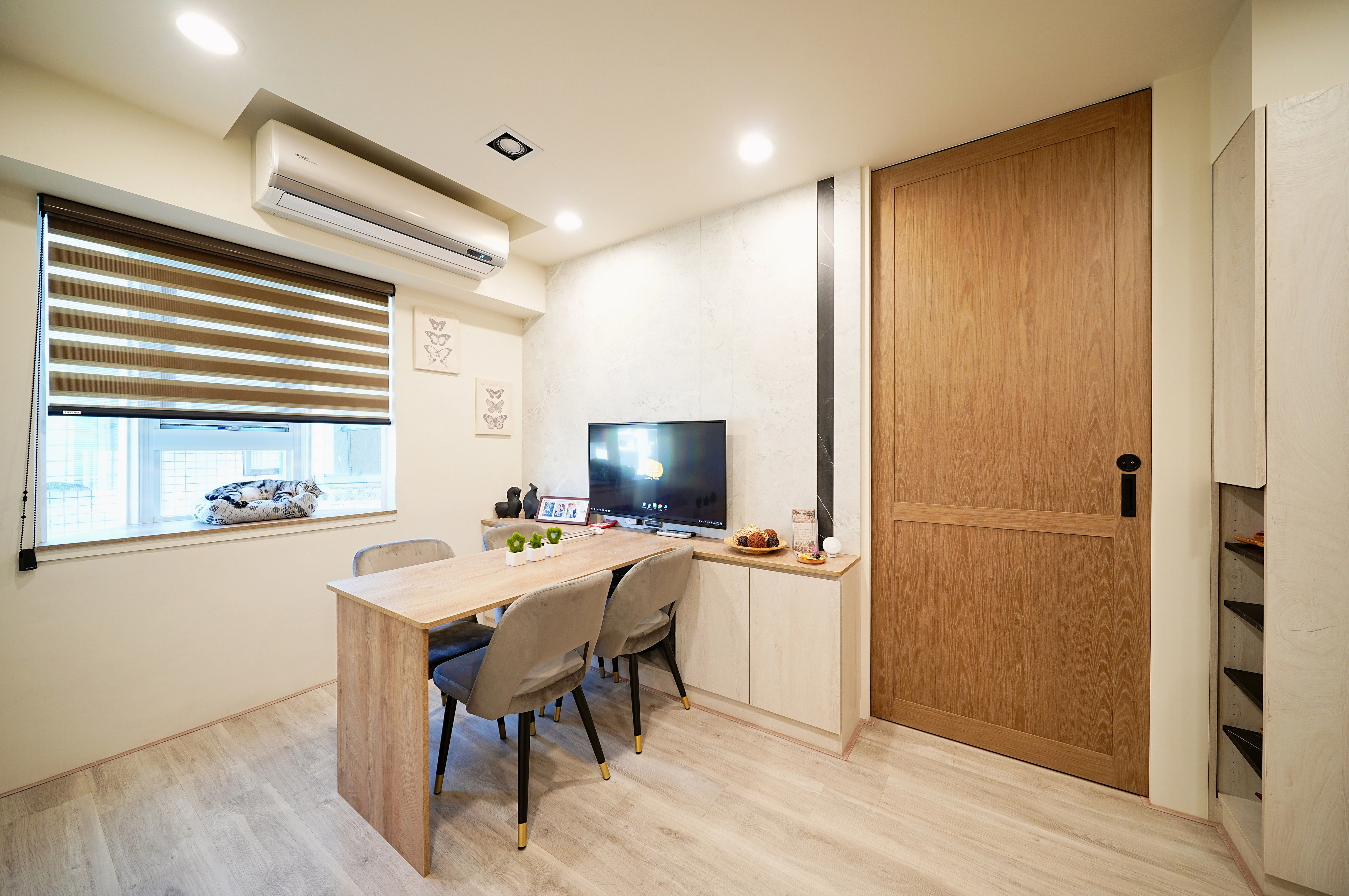 台南系統家具是德盈團隊的指標專長,本案為經典兩房配置,我們從玄關處便開始佈局,運用溫潤木作結合系統鞋櫃,型塑出明亮通透的入戶氛圍。透過精準規劃,將受限的坪數轉化為高效實用的生活場域。