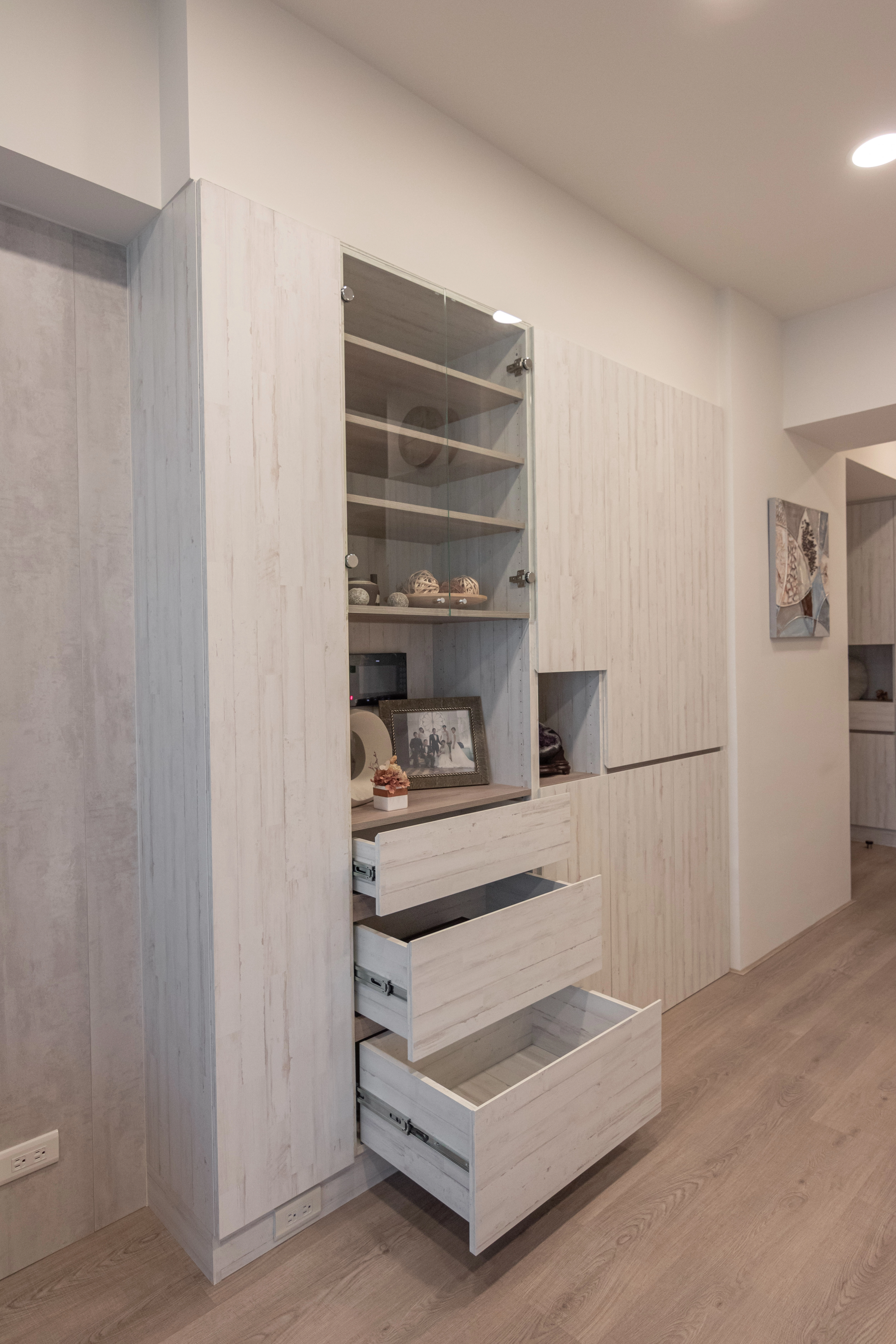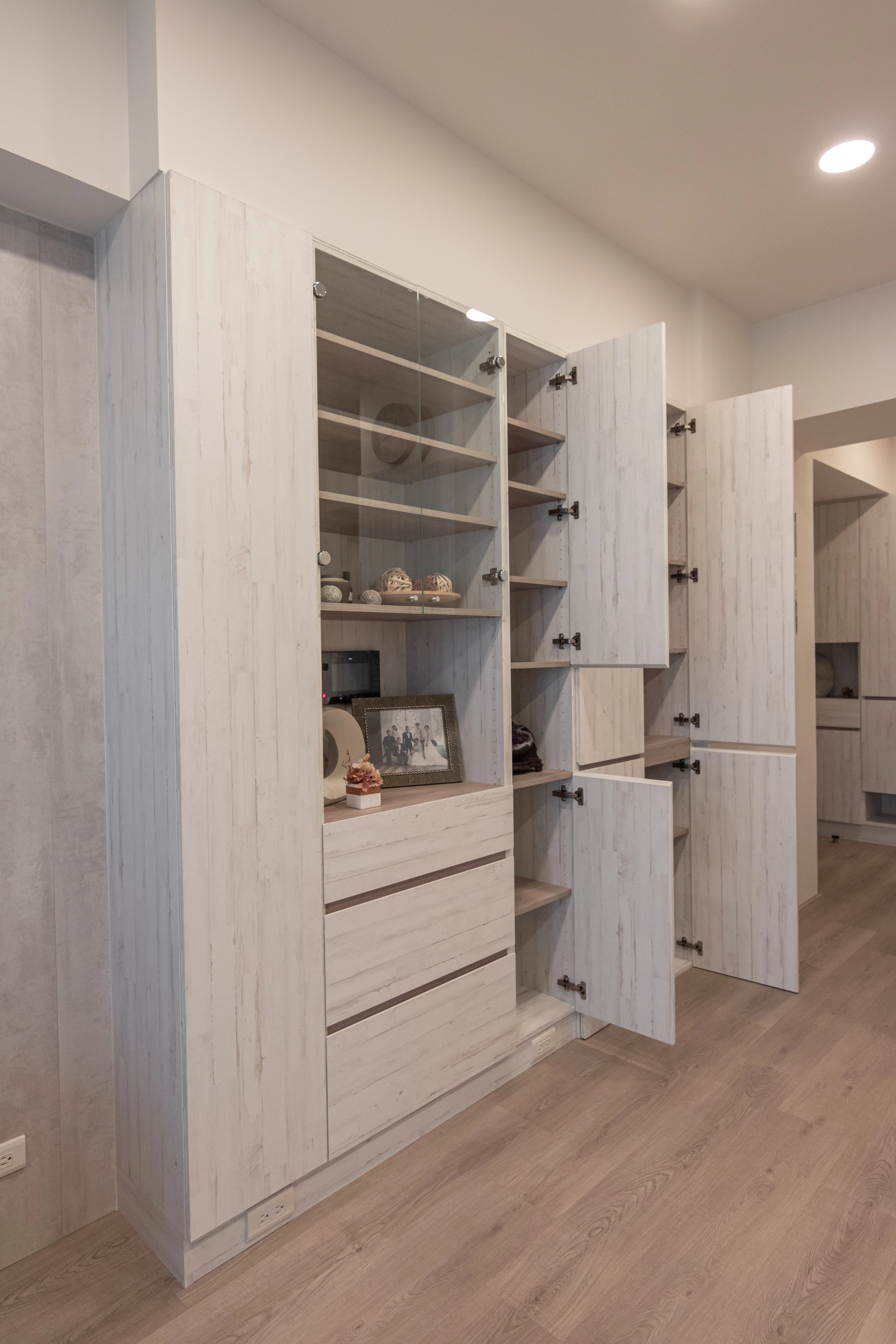 客廳區域特別著重收納體系的整合,利用專業系統櫃技術,將單調牆面打造為多功能收納牆。高櫃結合緩衝抽屜與局部玻璃門片,讓雜物能被完美隱藏,同時降低視覺壓迫感,維持公領域的整潔序位。每一處客製化細節,如電視牆比例與櫃體深度,皆精準貼合屋主的生活慣性。
