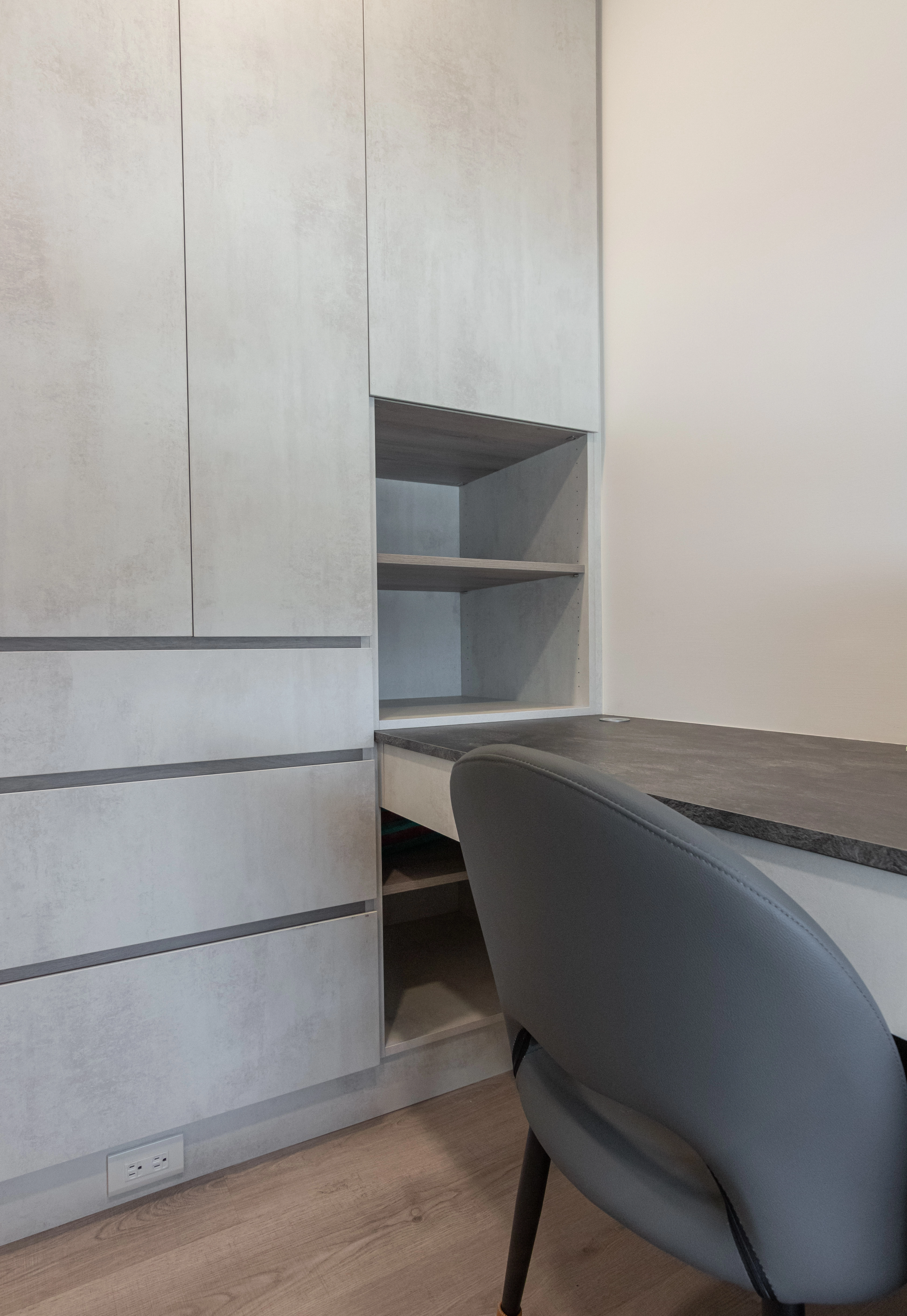 私領域則整合系統書桌與衣櫃,並細膩配置緩衝五金,大幅提升日常使用的手感。德盈堅持選用高品質台南系統家具,從板材選色到工法細節,皆旨在為屋主構築出兼具美感與實用性的美學居所,讓 18 坪小空間也能擁有從容不迫的生活質感。