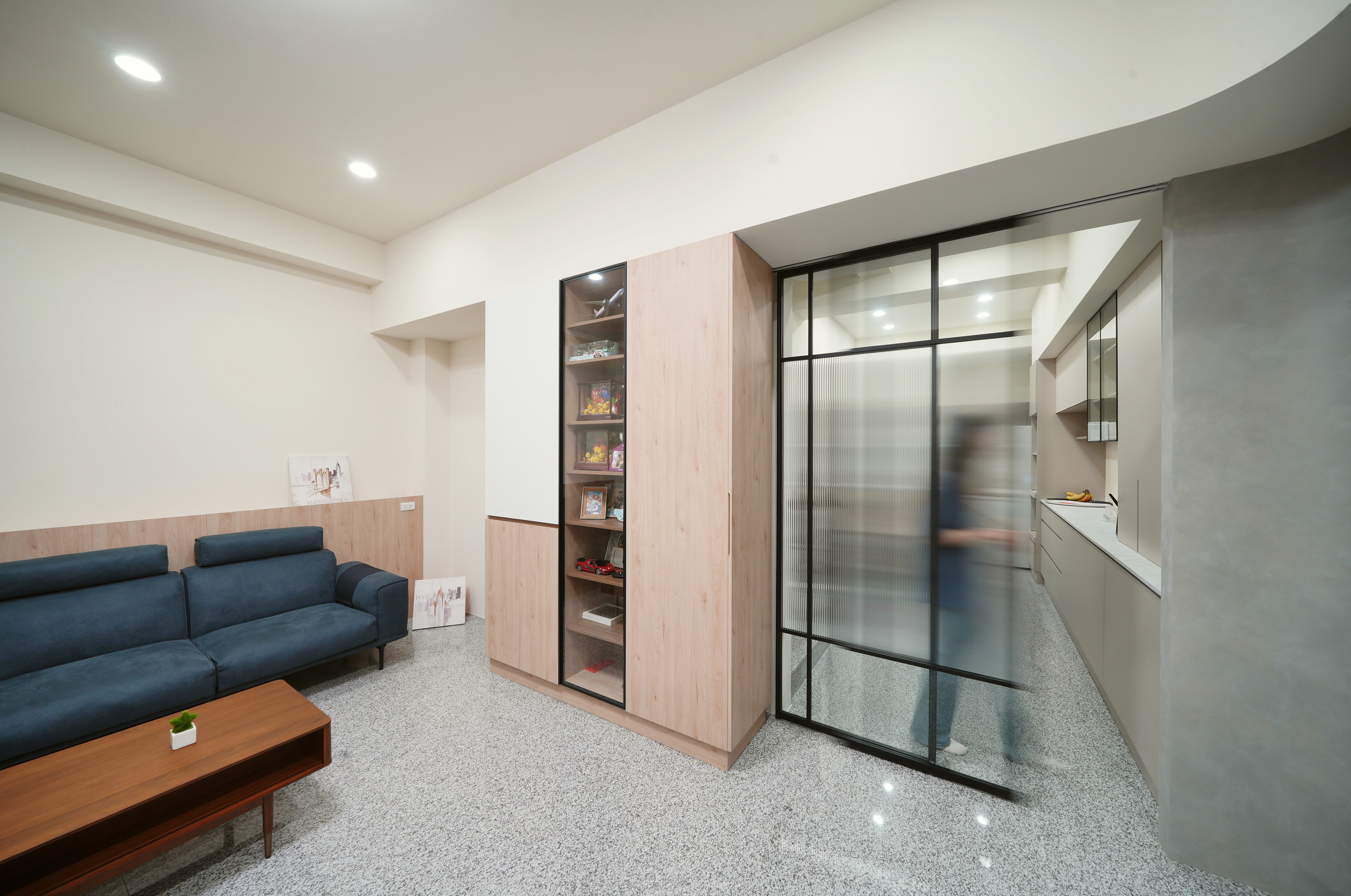 客廳以質感塗料定調,搭配系統懸吊櫃與多功能轉向衣櫃,滿足屋主對海量收納的需求。本案亮點在於鋁框長虹玻璃推拉門,不僅完美區隔場域,更保有光線的穿透美感。餐廳區則選用柔和的奶茶色系,透過收納中高櫃與電器櫃的精準配置,輔以鋁框玻璃懸吊櫃,在優雅氛圍中展現強大的機能實力。