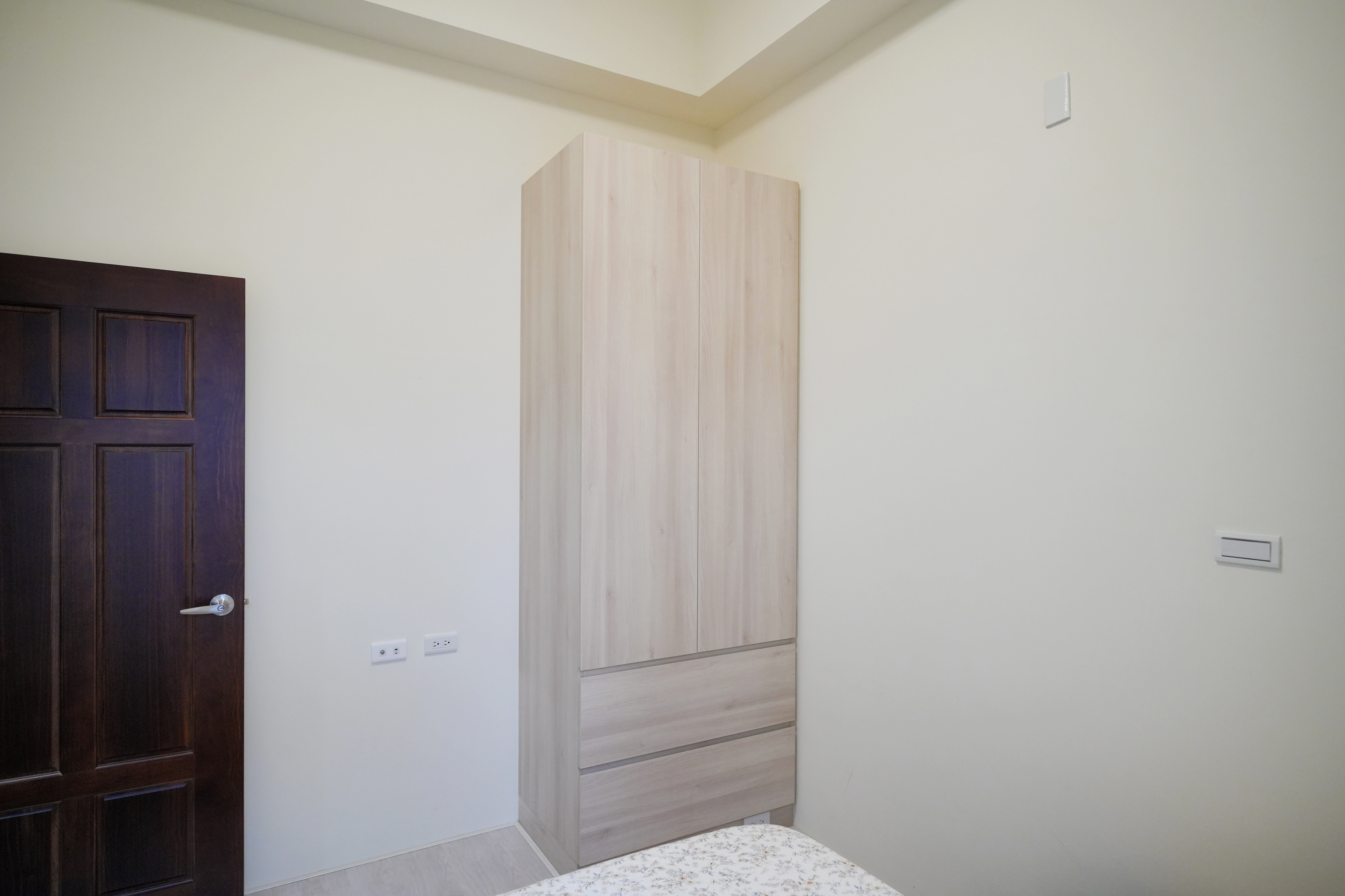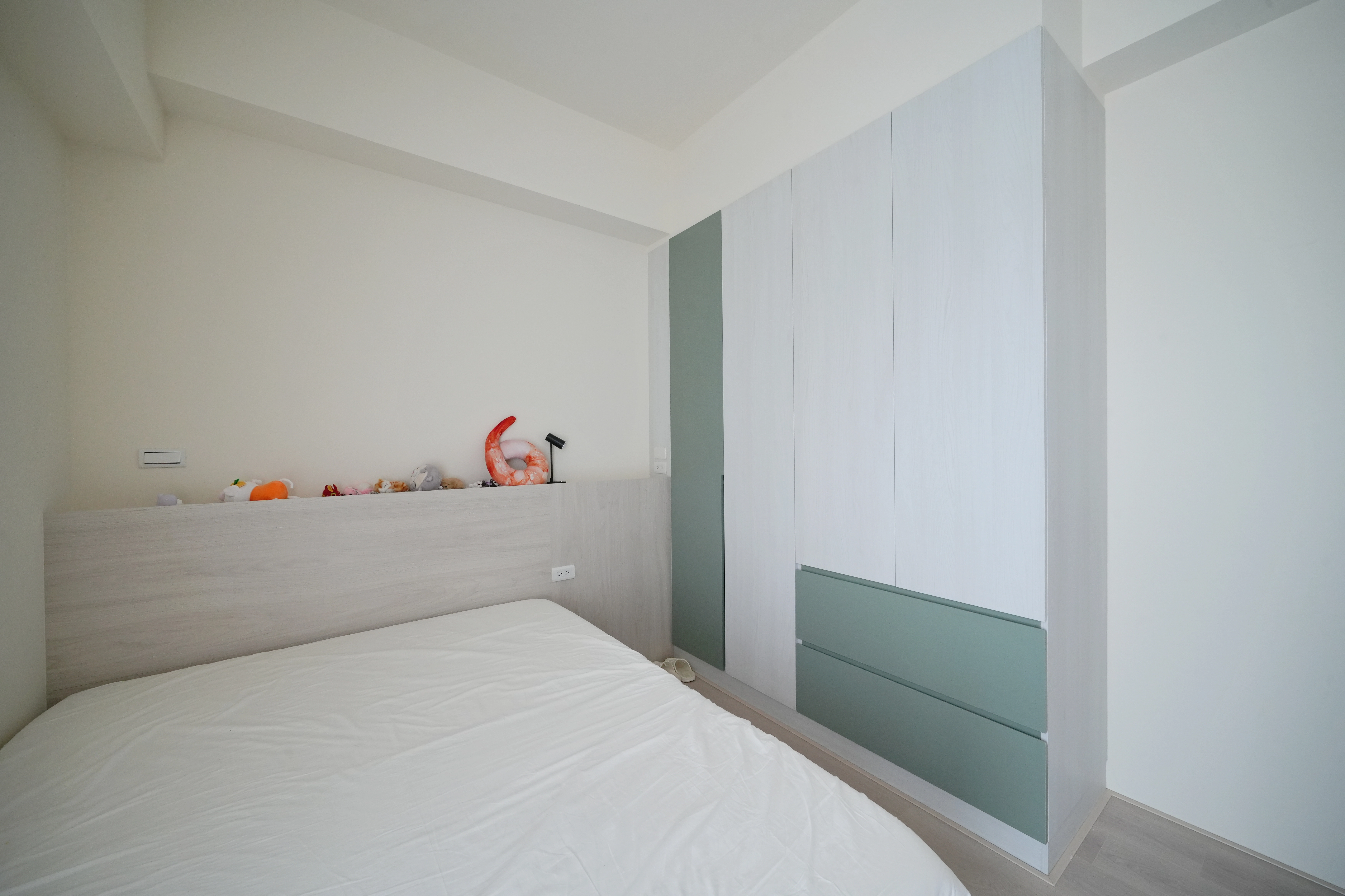 私領域的主臥室選用暖木色背牆營造溫馨感,地面鋪設超耐磨木地板提升踩踏觸感。我們利用整面系統開門衣櫃結合入口處的轉向收納設計,將儲物機能發揮到極致,構築出簡約實用的休憩場域。每一處細節皆考量到使用便利性,讓臥室在俐落線條下,依然保有居家應有的溫度。