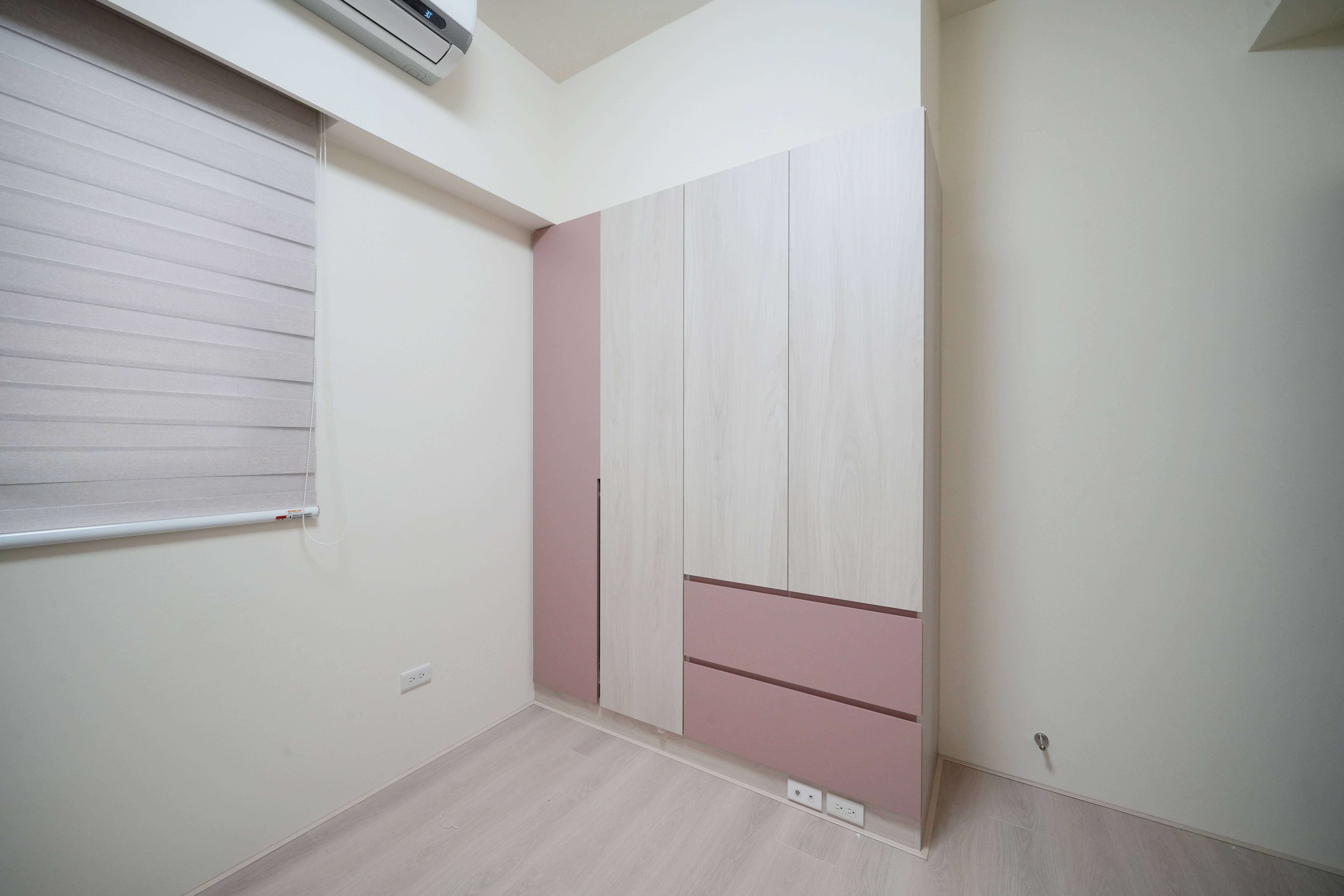 樓上空間則展現了設計的趣味與靈活性。二樓客房利用系統半高櫃整合書桌與下掀式床頭收納,巧妙極大化空間效能;三樓孩臥則分別以粉色與綠色系統衣櫃大膽跳色,搭配簡約床頭造型,為孩子打造出機能完整且活潑的專屬天地。德盈致力於讓每一層空間,都能精準貼合家庭成員的不同生活步調。