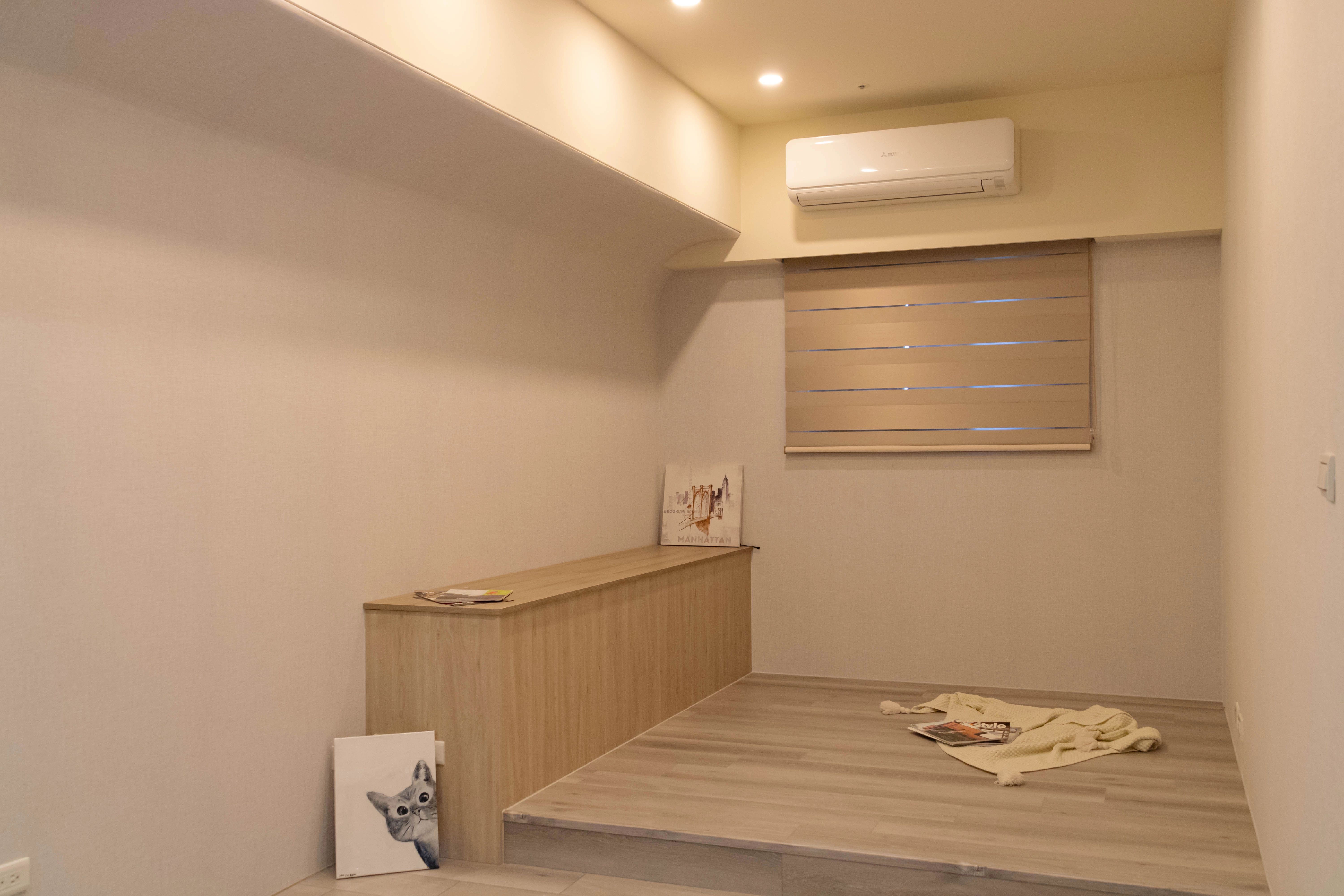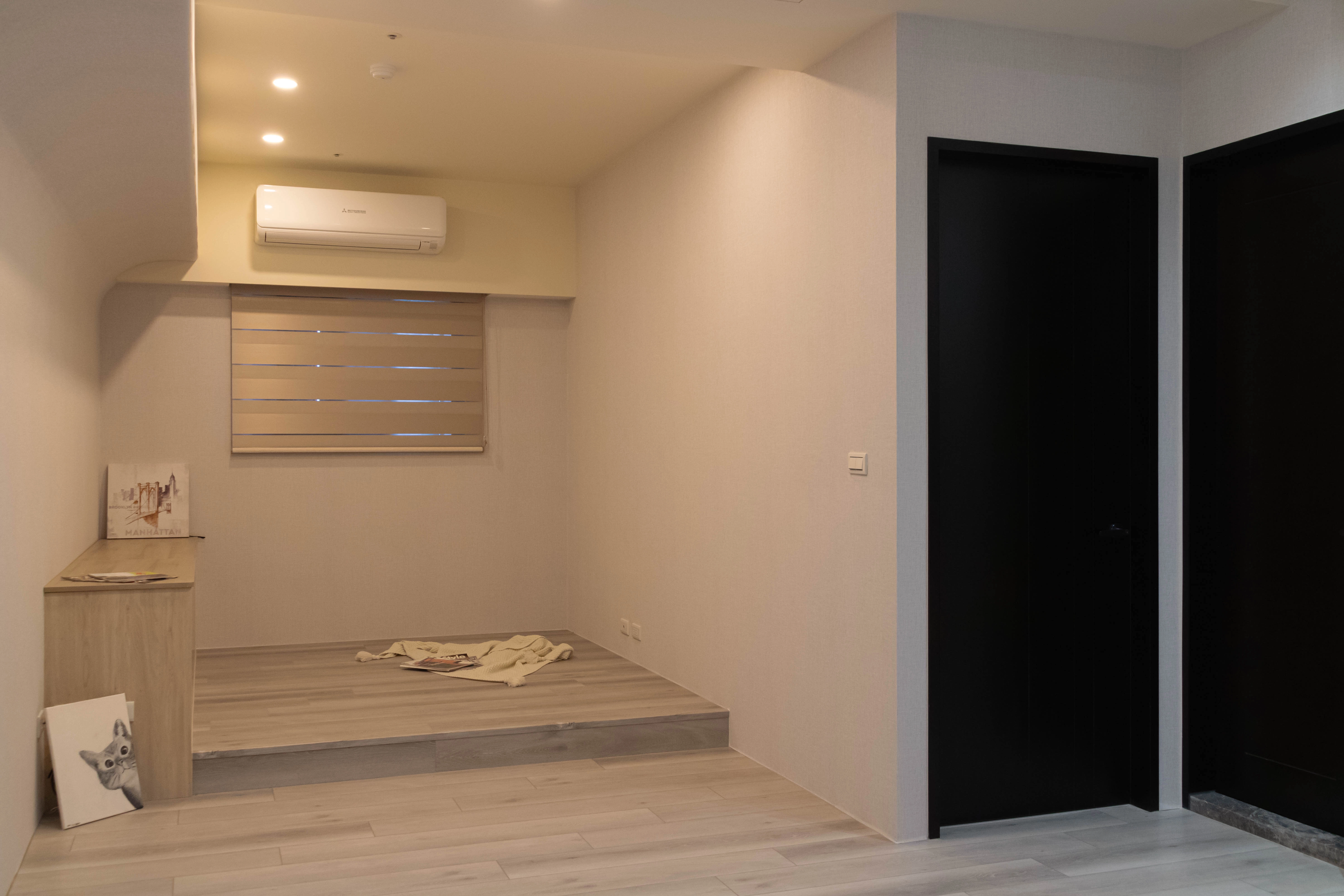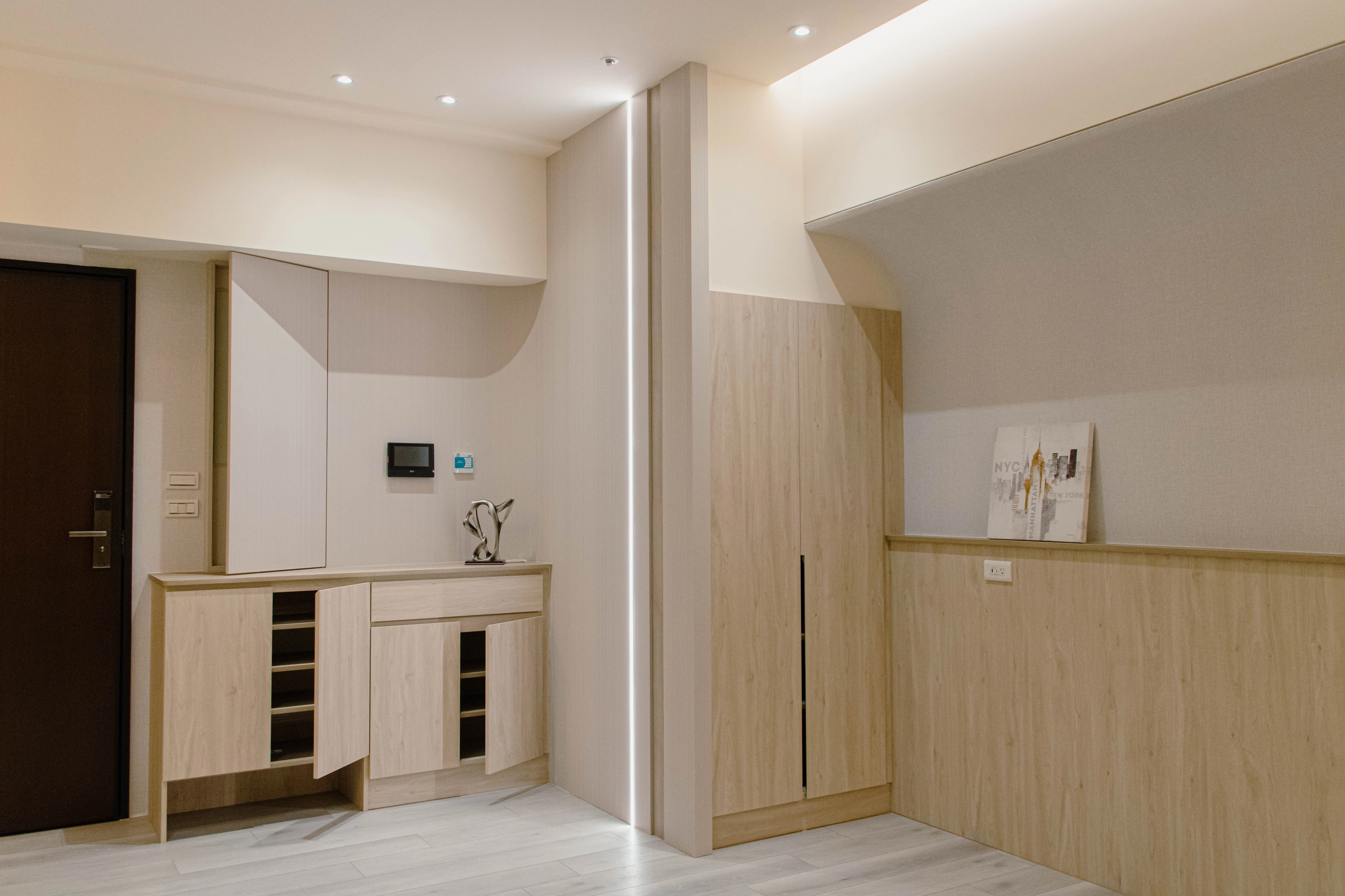 在玄關,我們巧妙運用木作造型天花板,並結合系統開門矮櫃與LED光帶,增添現代感與實用的收納機能。客廳區域,我們採用系統懸吊電視矮櫃,維持視覺輕盈,並在電視牆面漆上溫暖的塗料。而在一旁的休憩區,透過木作加高10公分區隔,與客廳區劃開來,並於下方設置收納上掀櫃,有效利用空間。