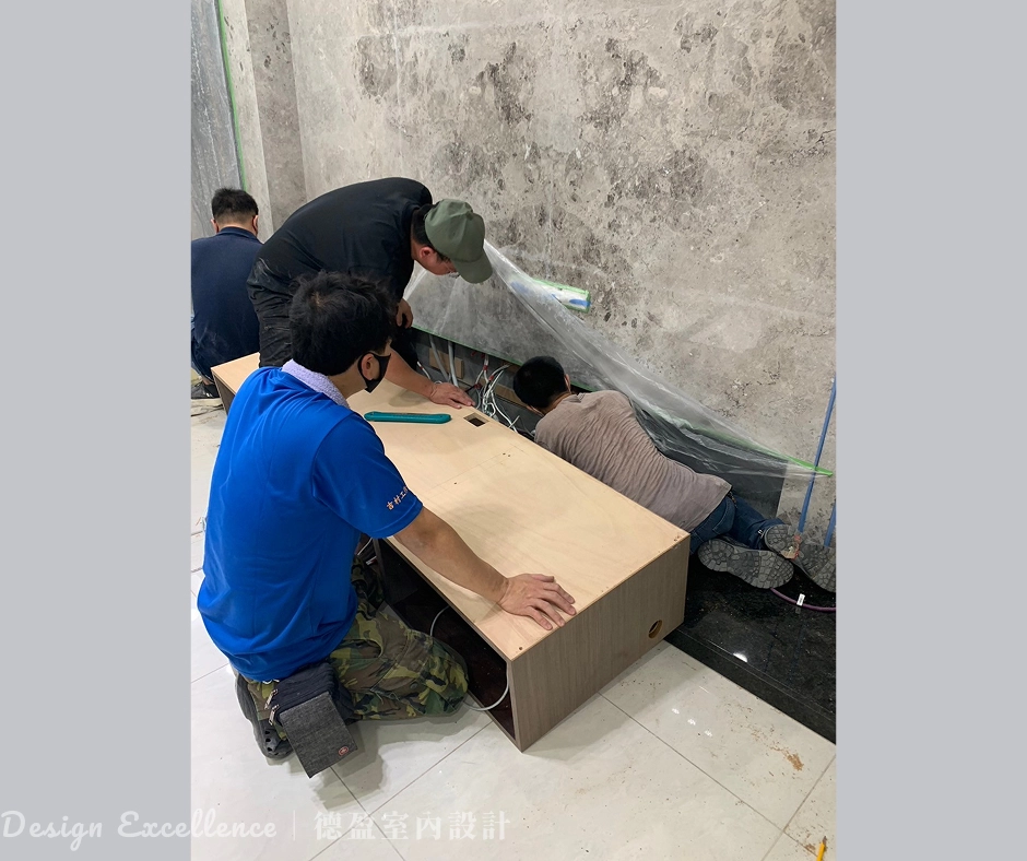 我們在玄關入口處做了木作 L 型隔屏搭配強化黑色透玻,既維持採光也保有隱私。客廳主視覺則是造型大理石電視牆配大理石底座,下方結合黑透玻門片的系統矮櫃。最細緻的地方在於電箱修飾箱,我們在外層貼上斜木皮,讓原本突兀的電箱變成牆面設計的一環。