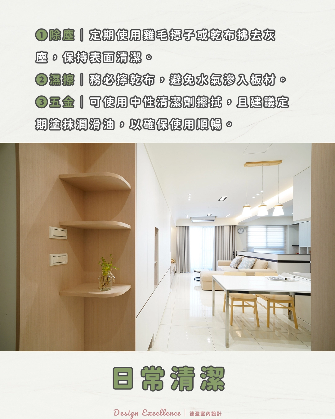 學會這幾招簡單的保養術,不只能讓系統櫃更耐用,還能讓生活空間隨時保持高質感。德盈室內設計不只幫你規畫美宅,更在乎你入住後的每一天。覺得這篇文章實用嗎?追蹤我們的粉絲專頁,獲取更多設計靈感與居家保養技巧!