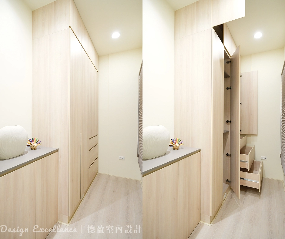 充分利用樑下與畸零空間,透過系統櫃將收納從地板延伸至天花板。不只解決壓樑問題,更把原本浪費的「平面」變成強大的「垂直收納牆」。