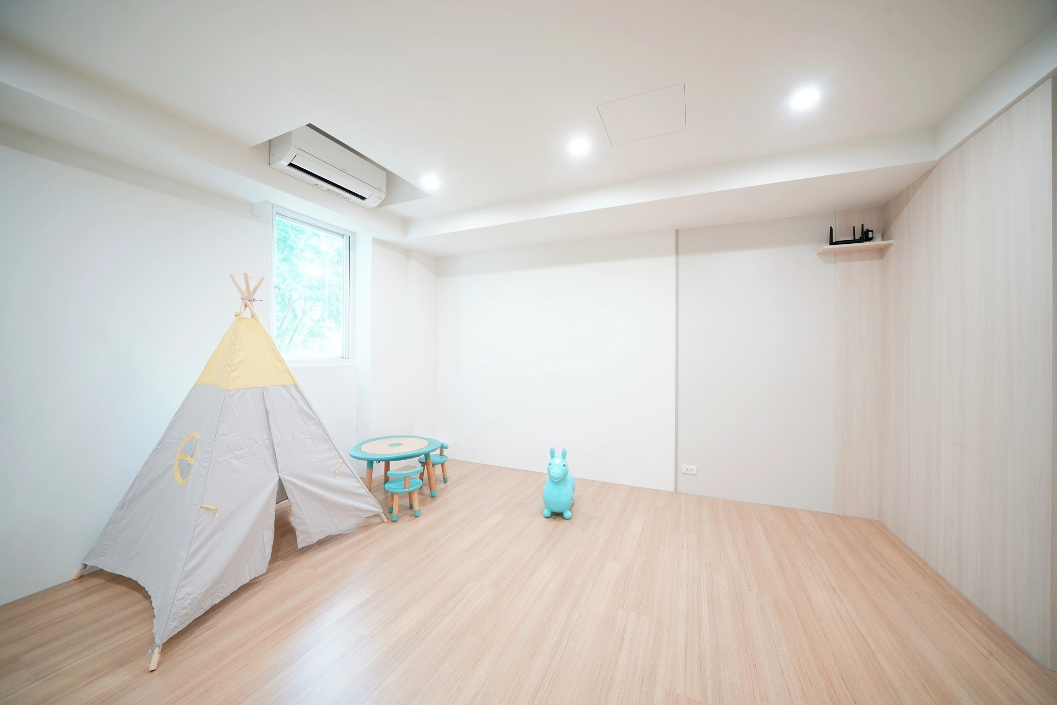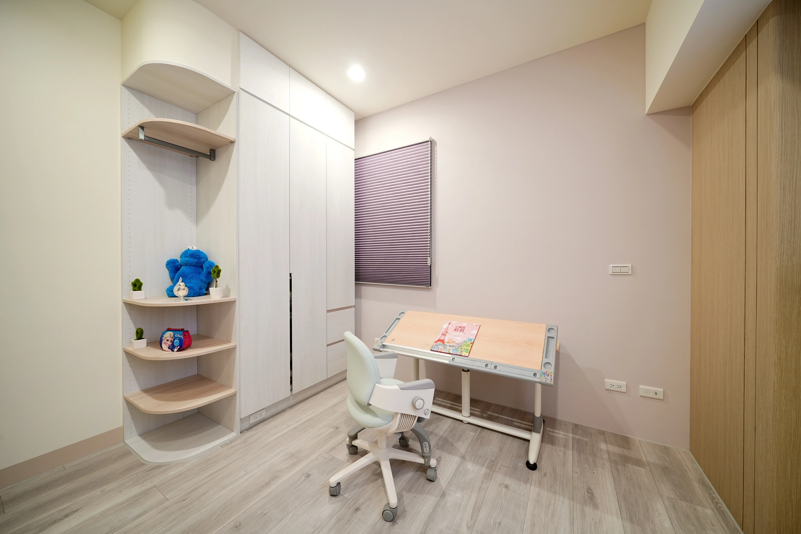 其實最好的兒童房,是讓孩子也能當空間的小主人。我們沿著牆面規劃了高度剛好的系統矮櫃和層架,把視覺重心往牆面帶,透過「垂直收納」的方式,玩具、繪本再多都有地方放。當收納就在伸手可及的地方,孩子自然而然就會知道:「玩完了,要把玩具送回家。」整理這件事,也就這樣輕輕鬆鬆變成親子之間最日常的生活習慣。