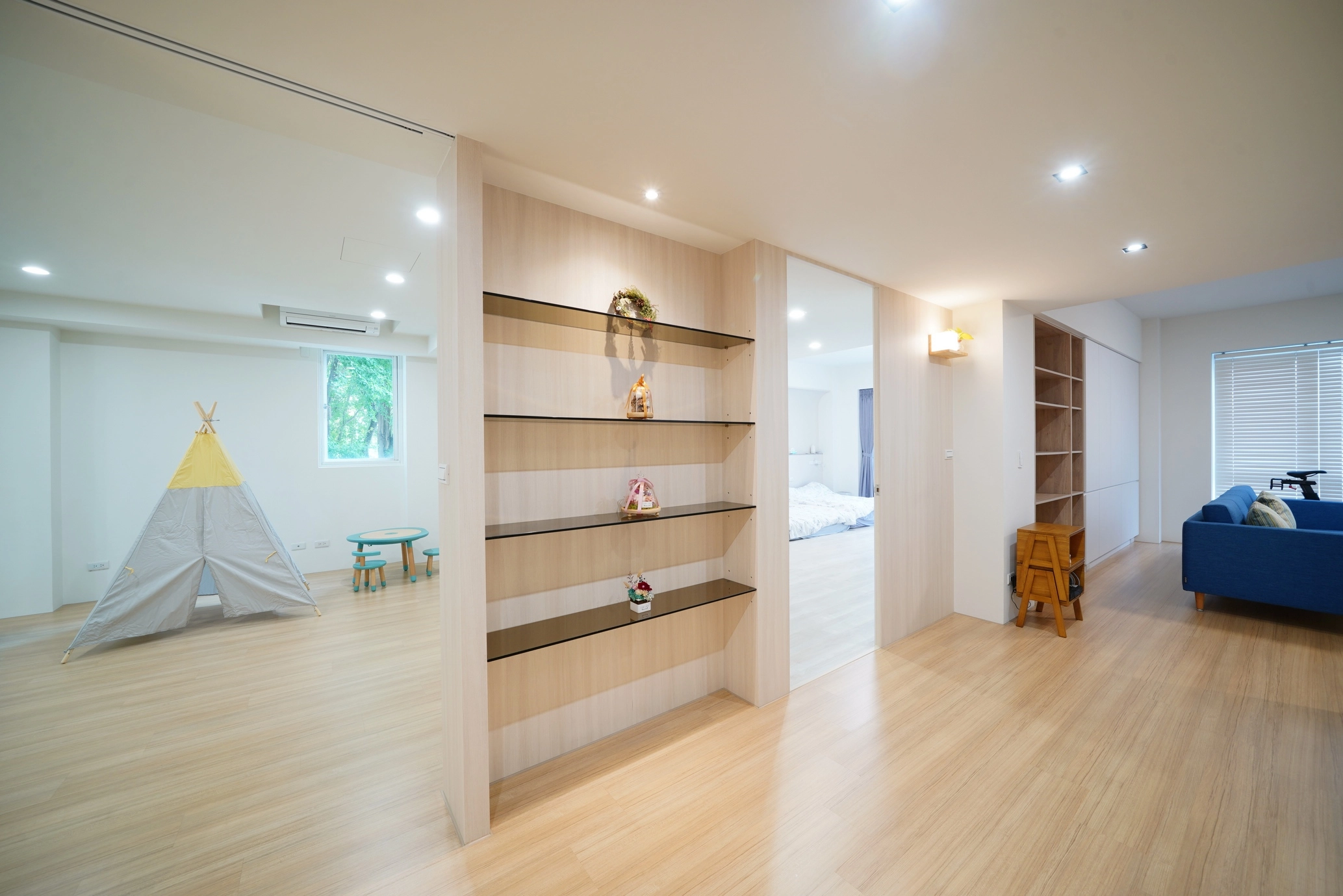 孩子的空間,不該被制式家具卡死。在案例中,我們刻意留白,採開放式動線,讓家具不再擋路。小時候鋪上軟墊當遊戲區,大一點變成窩著看書的閱讀角,朋友來玩的時候也能直接變聚會場地。這種會呼吸的設計,不只陪著孩子一路長大,也讓空間跟著他們的步調,慢慢變成最適合的樣子。