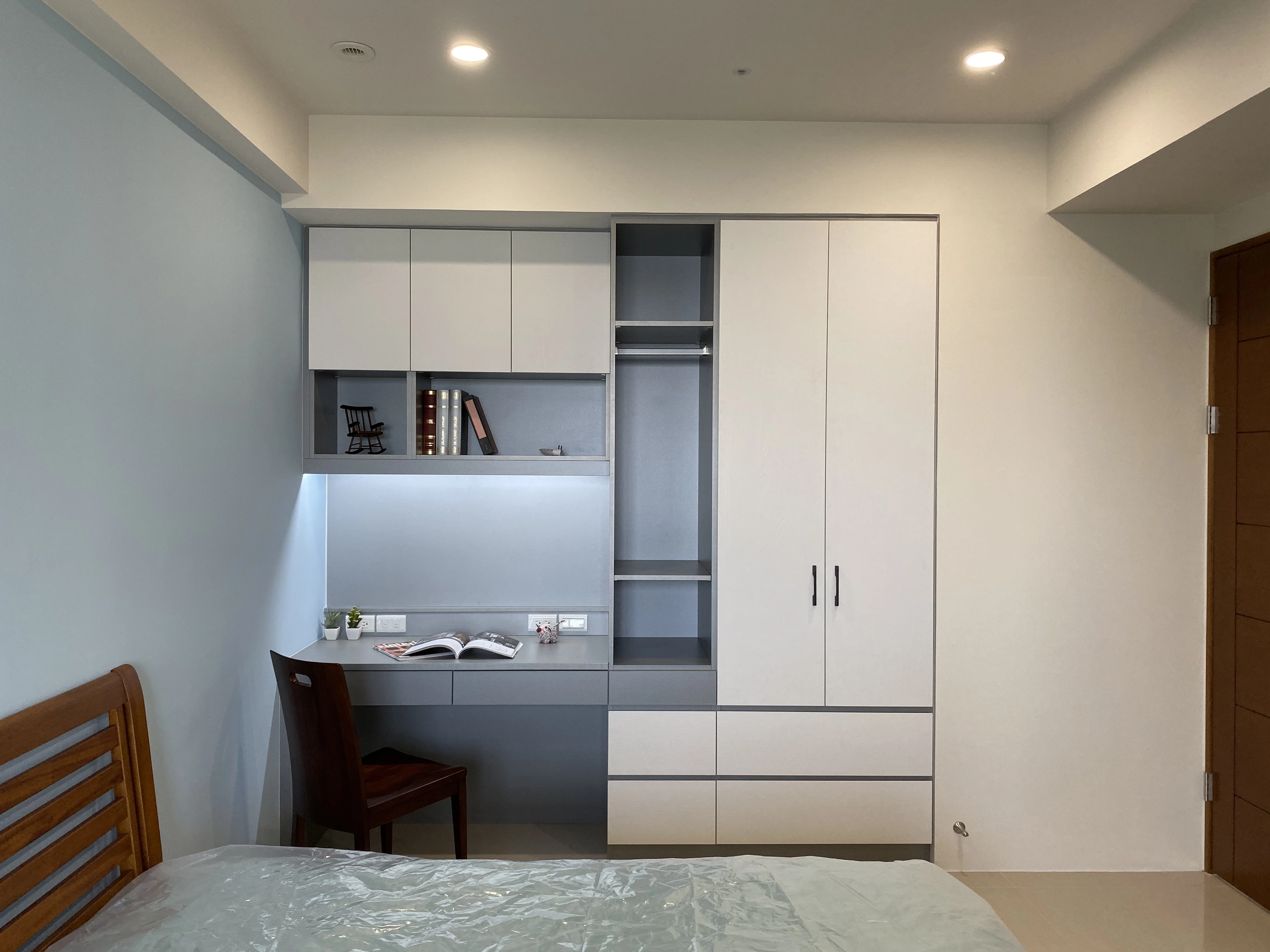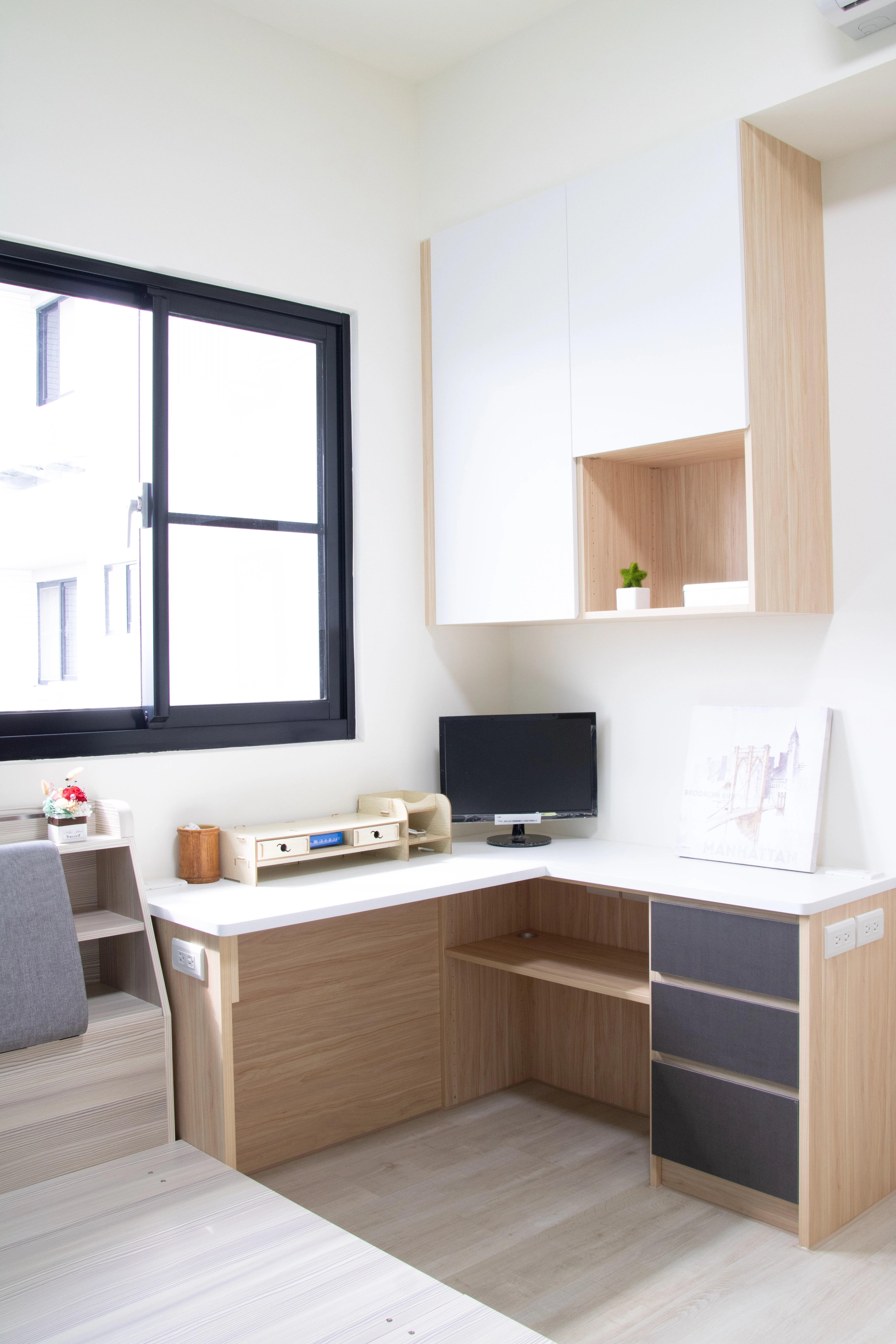 櫃體直接延伸成桌面,收納跟工作一個空間搞定。這種櫃桌一體的設計,特別適合小宅,每一寸都不浪費。空間看起來精簡俐落,用起來卻什麼都有,收納跟辦公機能一次到位。